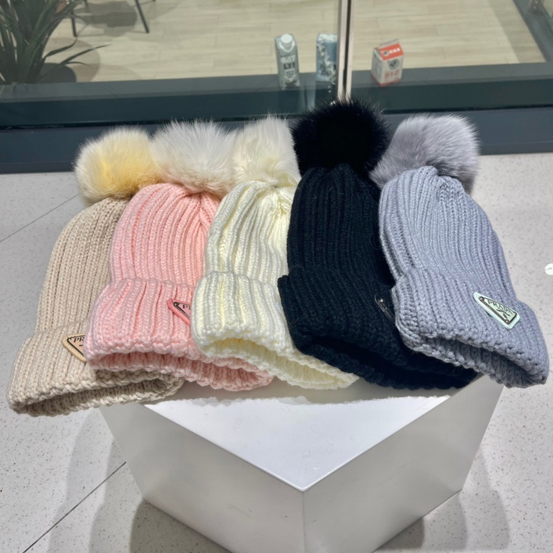 Prada 2023 Fall/Winter Fox Fur Pom Pom Knit Beanie Premium Quality
