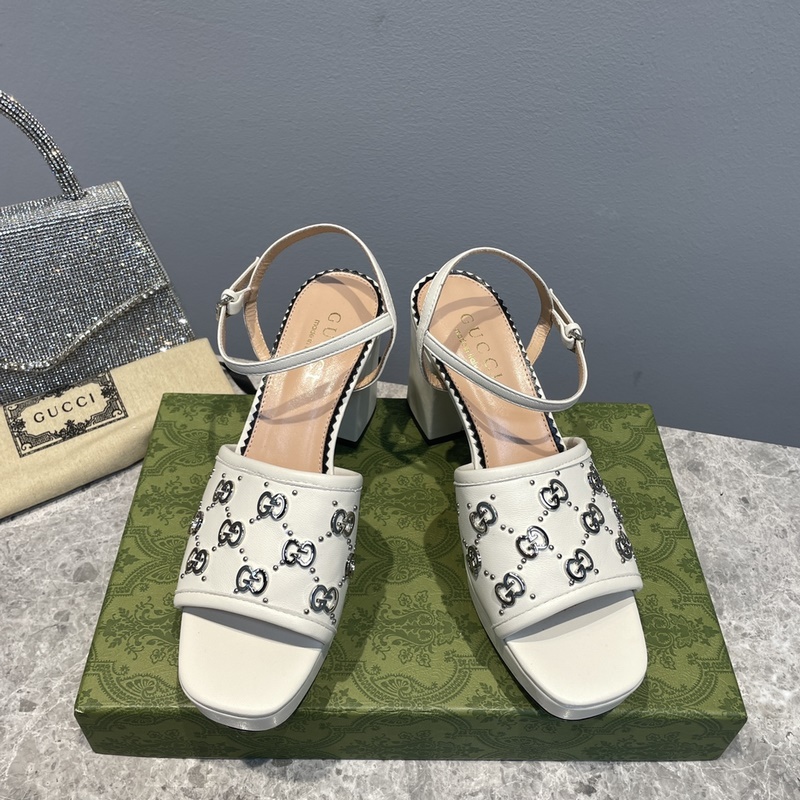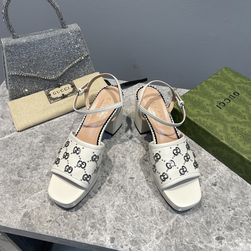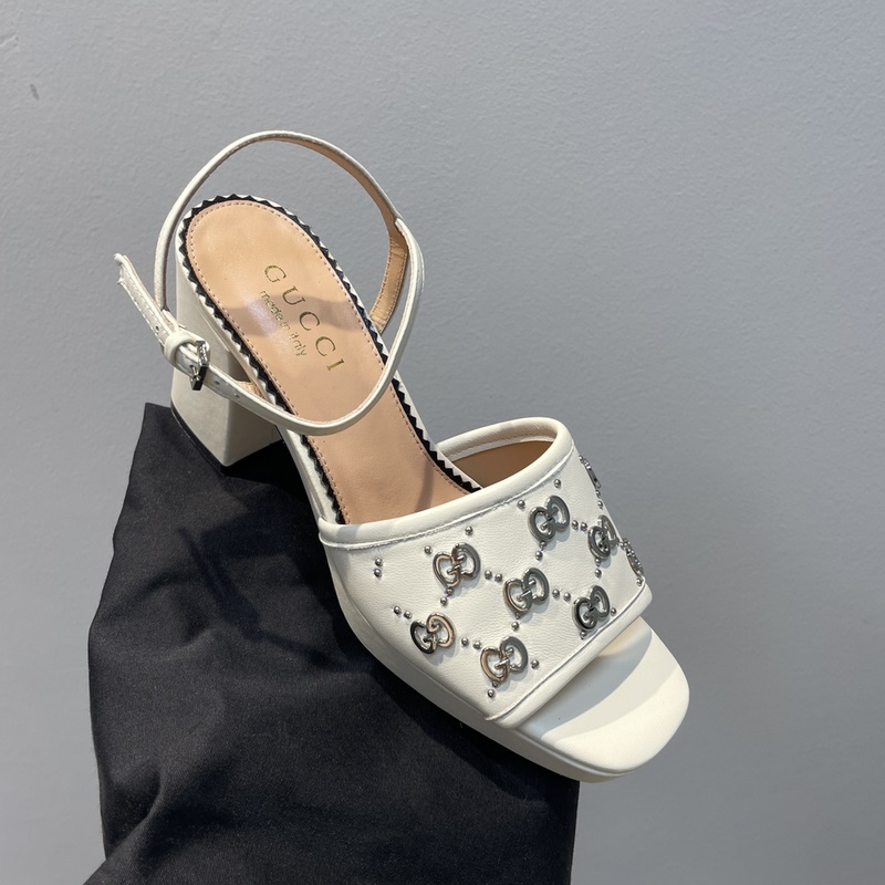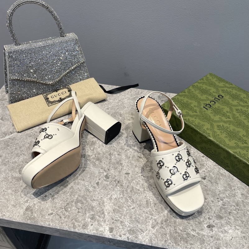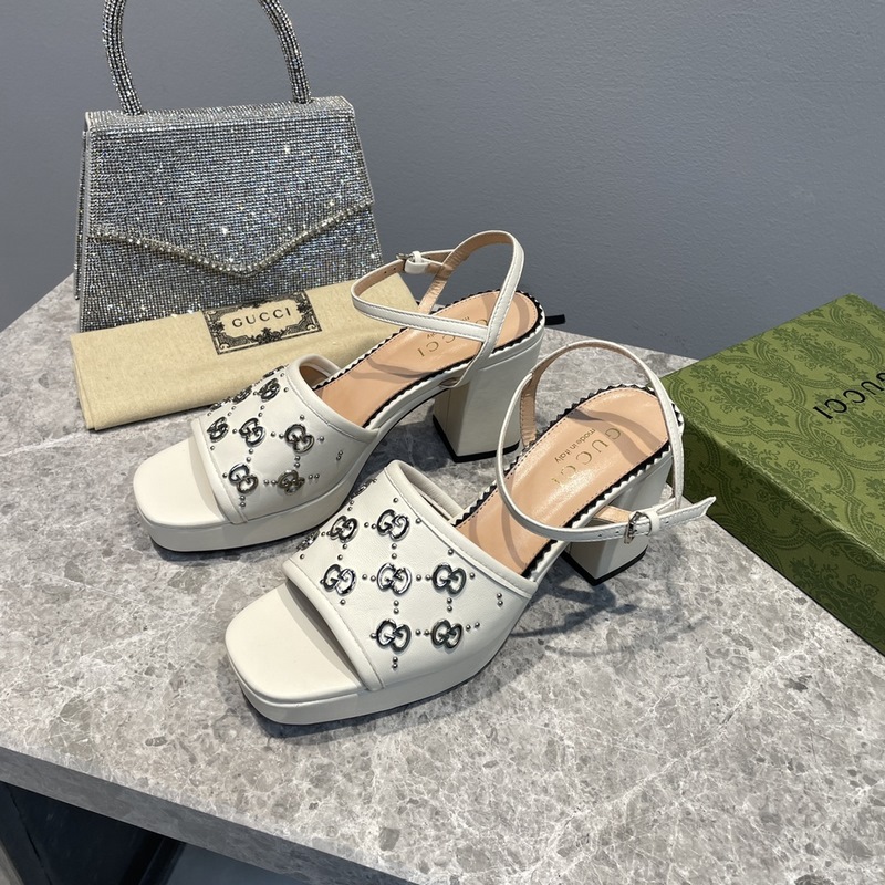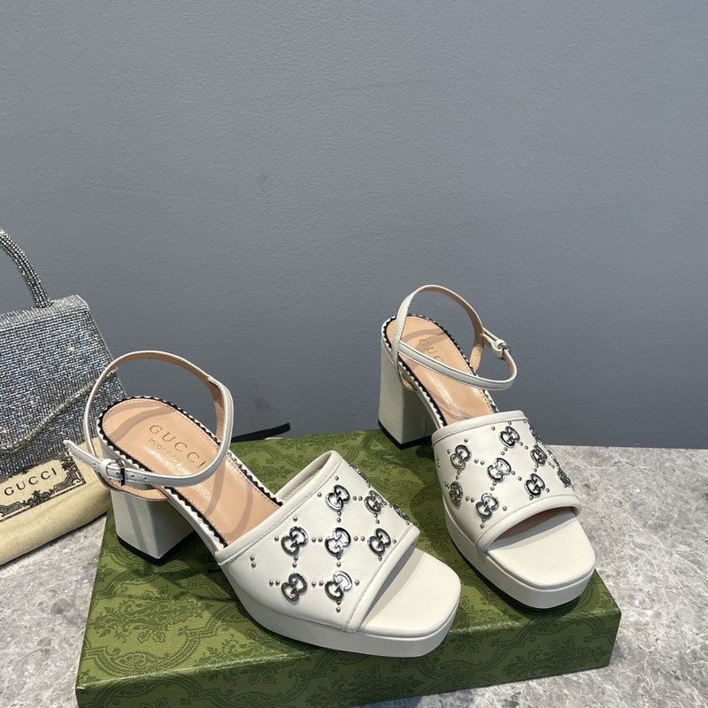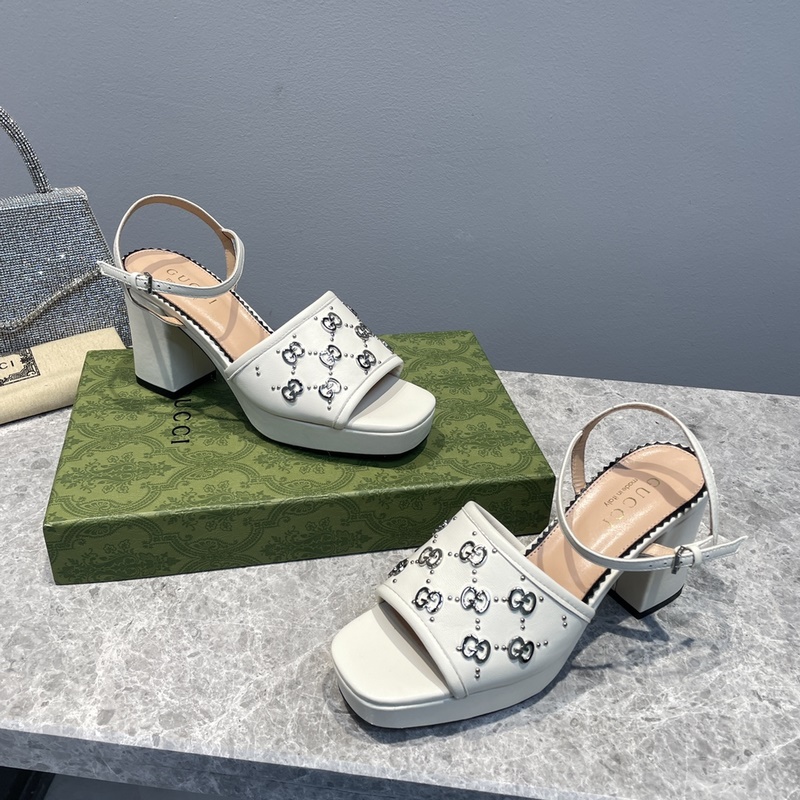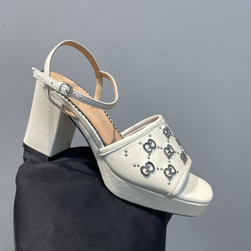 A statement heel and thick sole pay tribute to the 70s. This sandal is made of black leather. The interlocking double G studs add a touch of style and brand appeal to this piece. Materials: Upper, lining, sheepskin, leather outsole. Heel height: 8.5cm