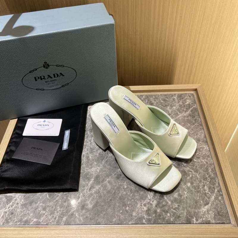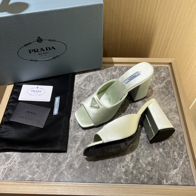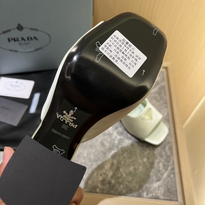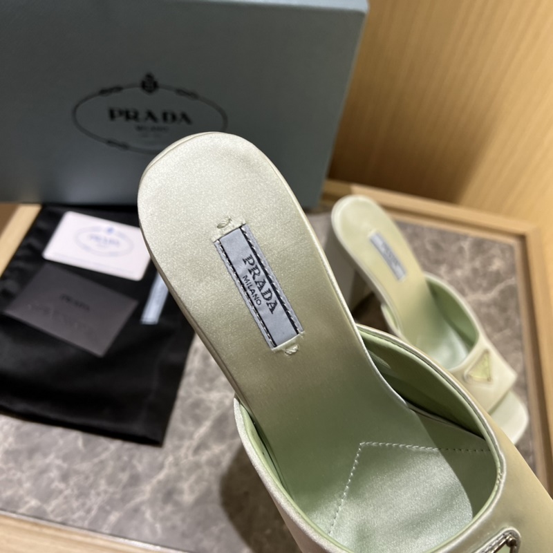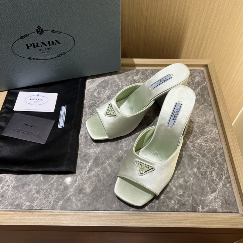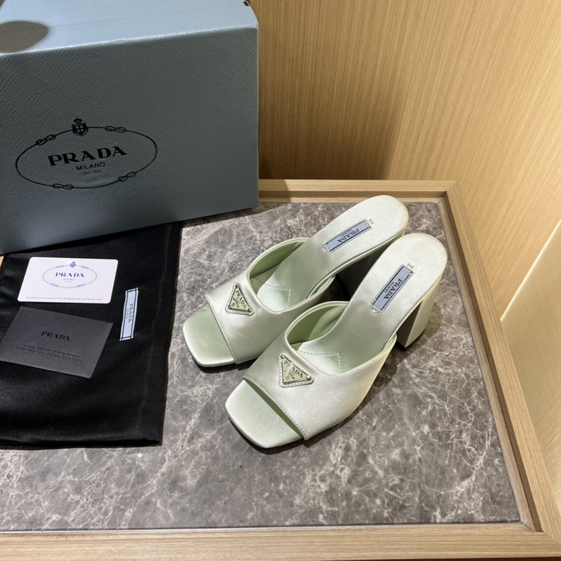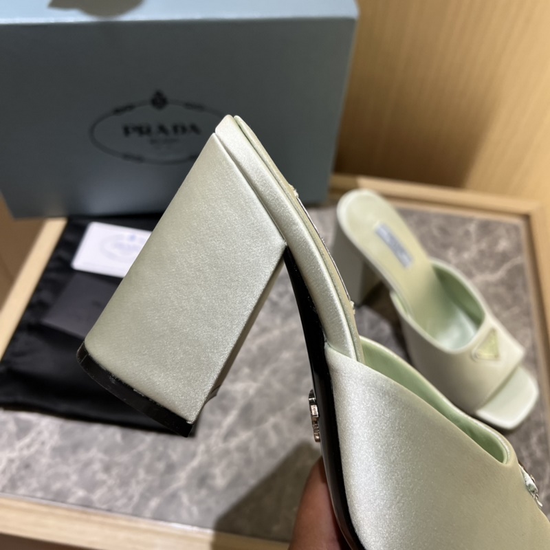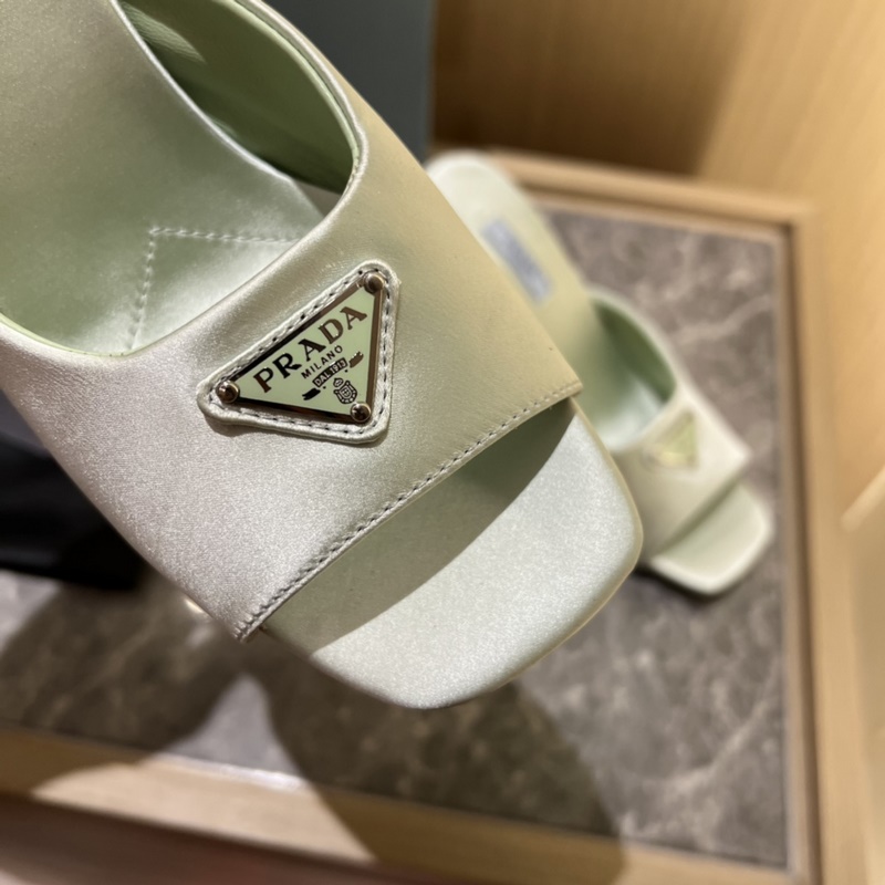 2023ss early spring new product, this high-heeled satin high-heeled slipper adheres to the modern design concept and exudes exquisite charm. The new and elegant colors of the fabric add a bright style. With rhinestones, the iconic enamel metal triangle logo highlights the brand characteristics. This logo is designed by Mario Prada.