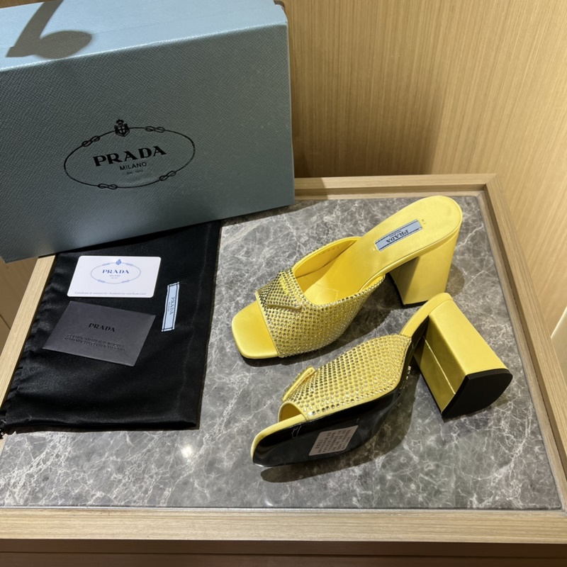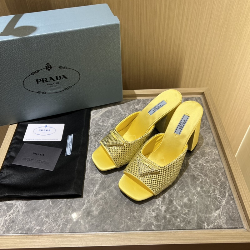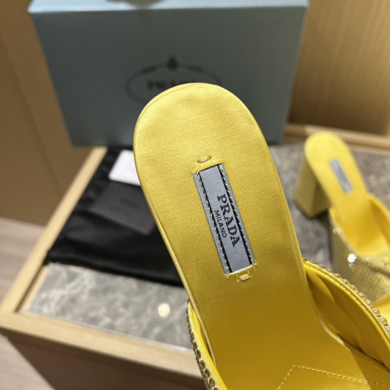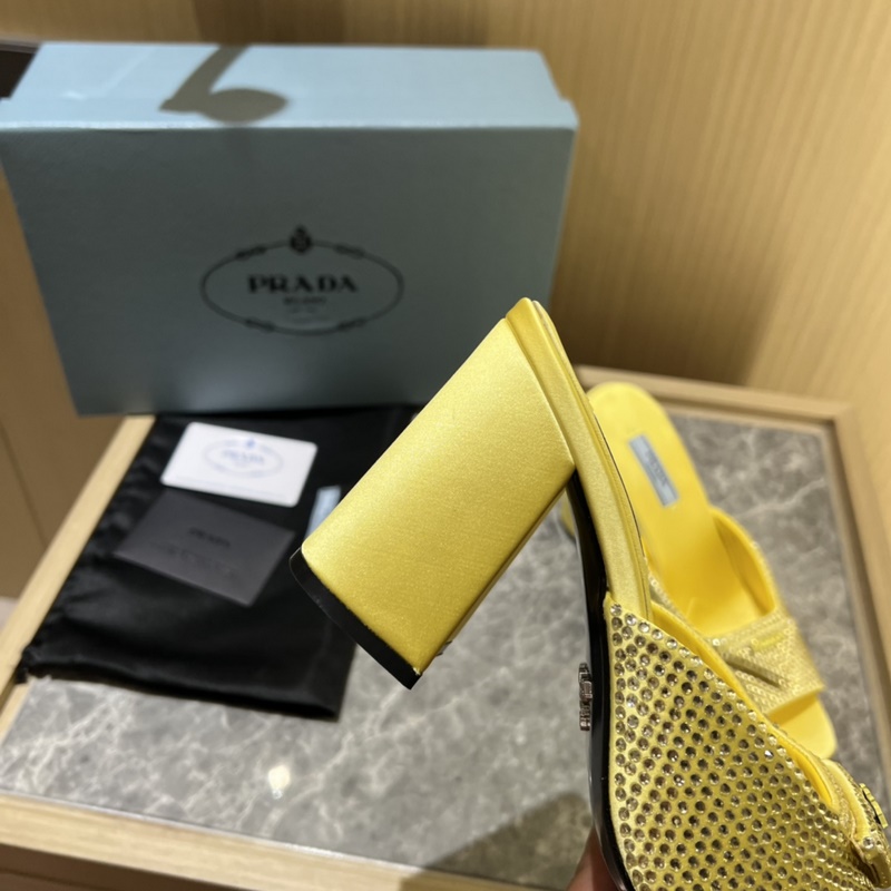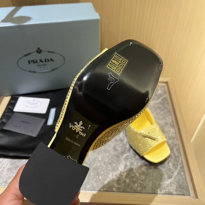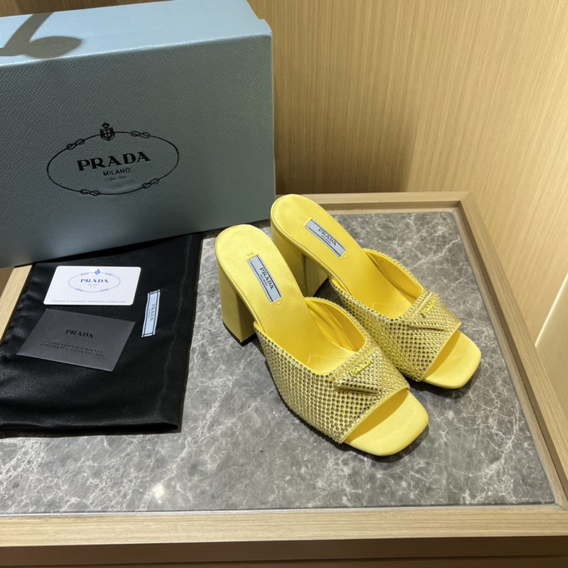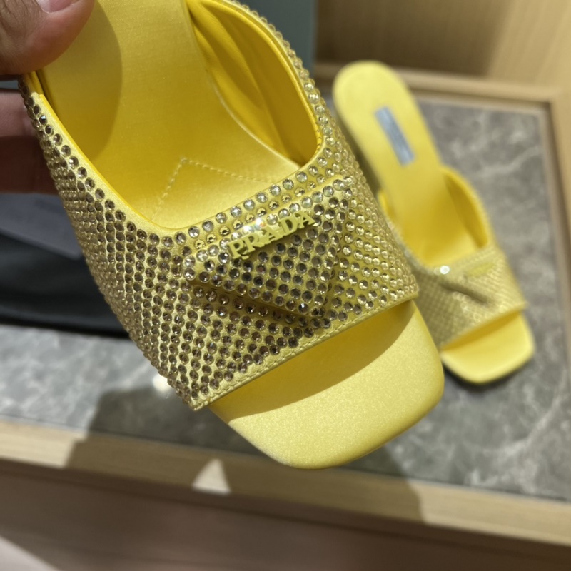 2023ss early spring new product, this high-heeled satin high-heeled slipper adheres to the modern design concept and exudes exquisite charm. The new and elegant colors of the fabric add a bright style. With rhinestones, the iconic enamel metal triangle logo highlights the brand characteristics. This logo is designed by Mario Prada.
