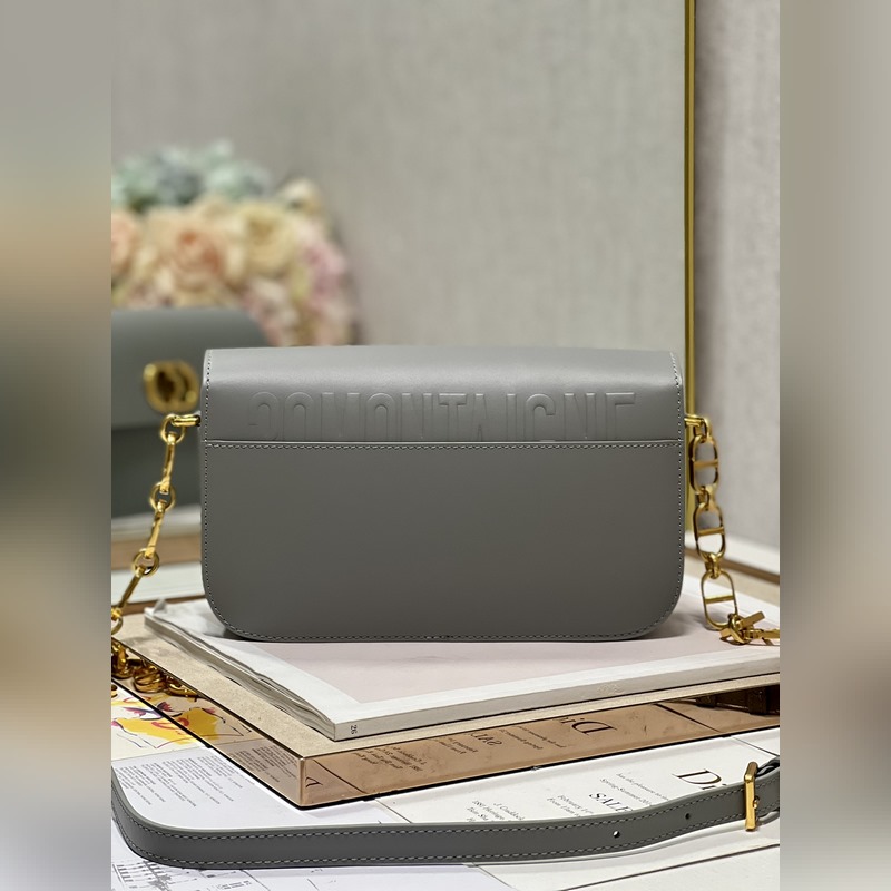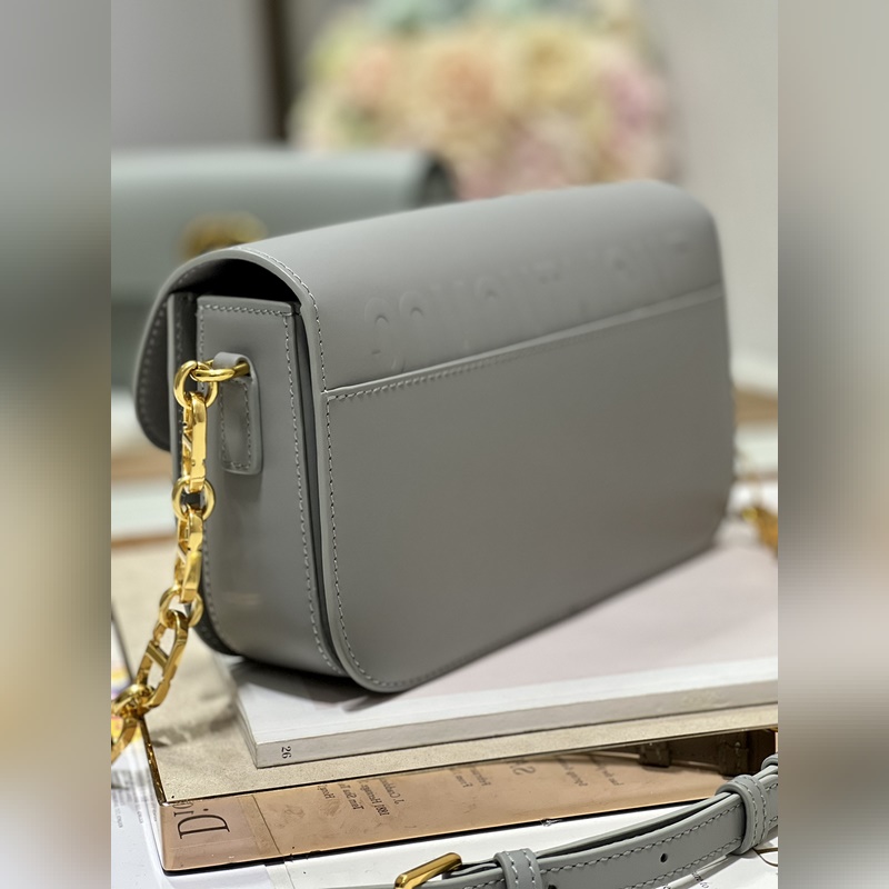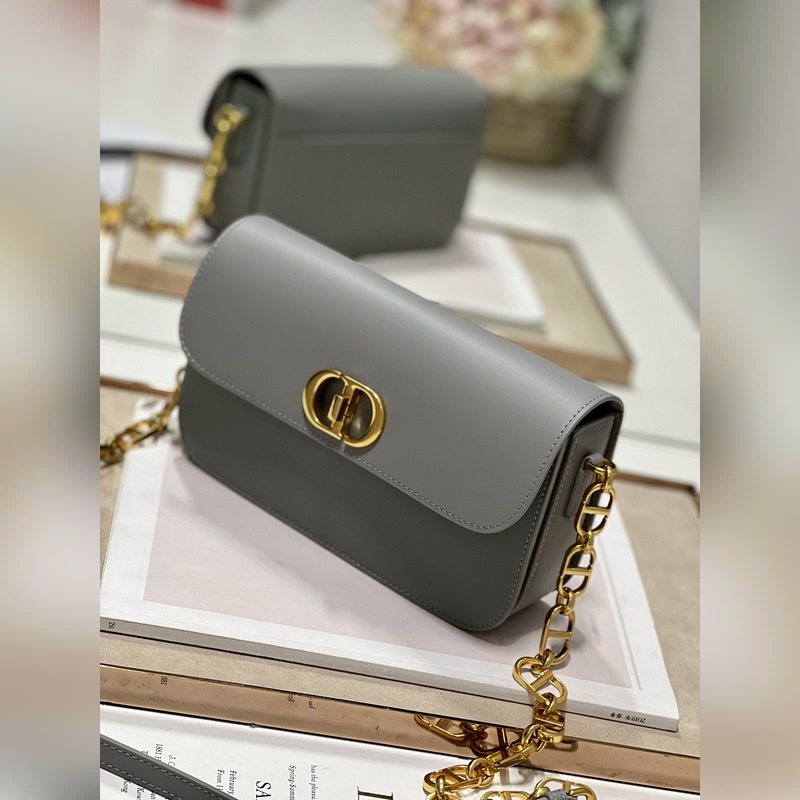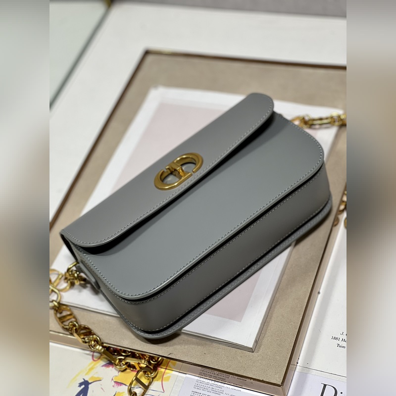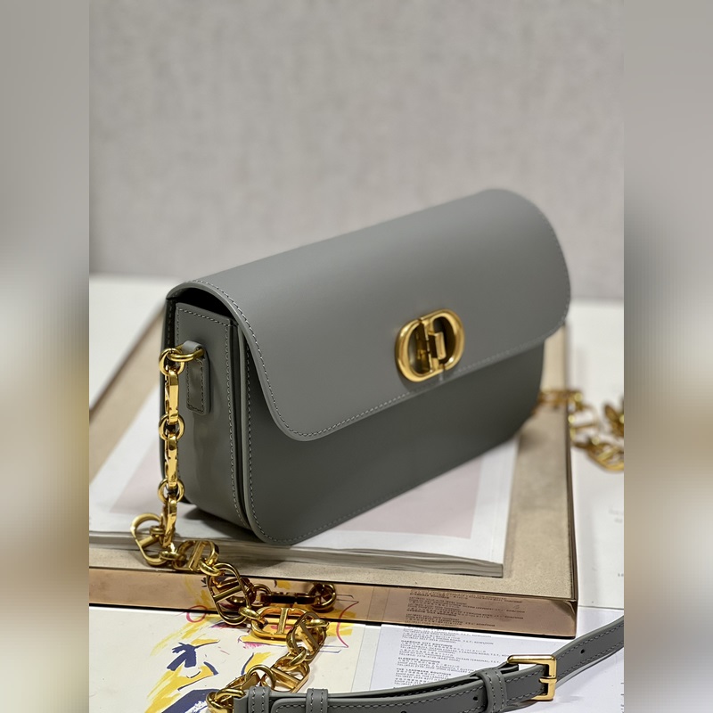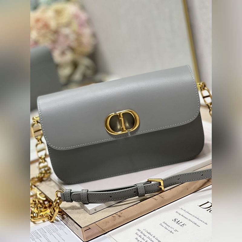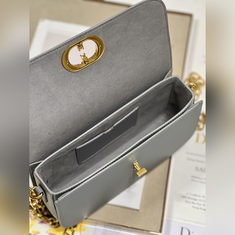 The 30 Montaigne Avenue bag, with its elegant design, elevates this classic collection. Crafted in grey glossy calfskin leather, it features a rounded flap with a refined curve and a CD clasp in antique gold-finish metal, inspired by the closure of a Christian Dior perfume bottle. The back is embossed with the 30 Montaigne logo and features a classic chain made up of alternating gold-finish metal and enamel links in the same tone as the leather. The pleated design offers room for a refined silhouette and can be carried by hand, on the shoulder or across the body.