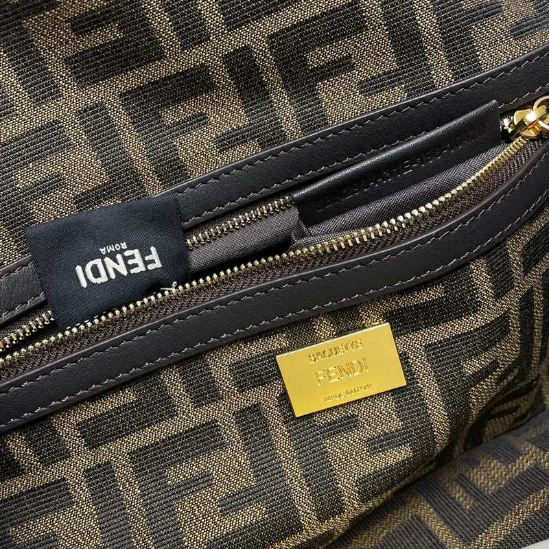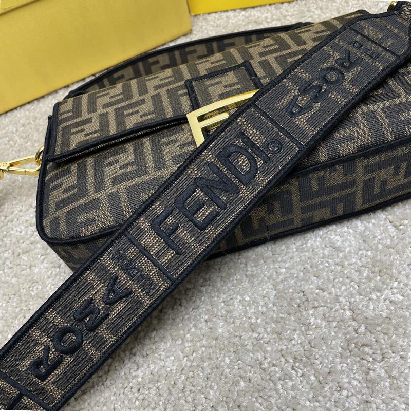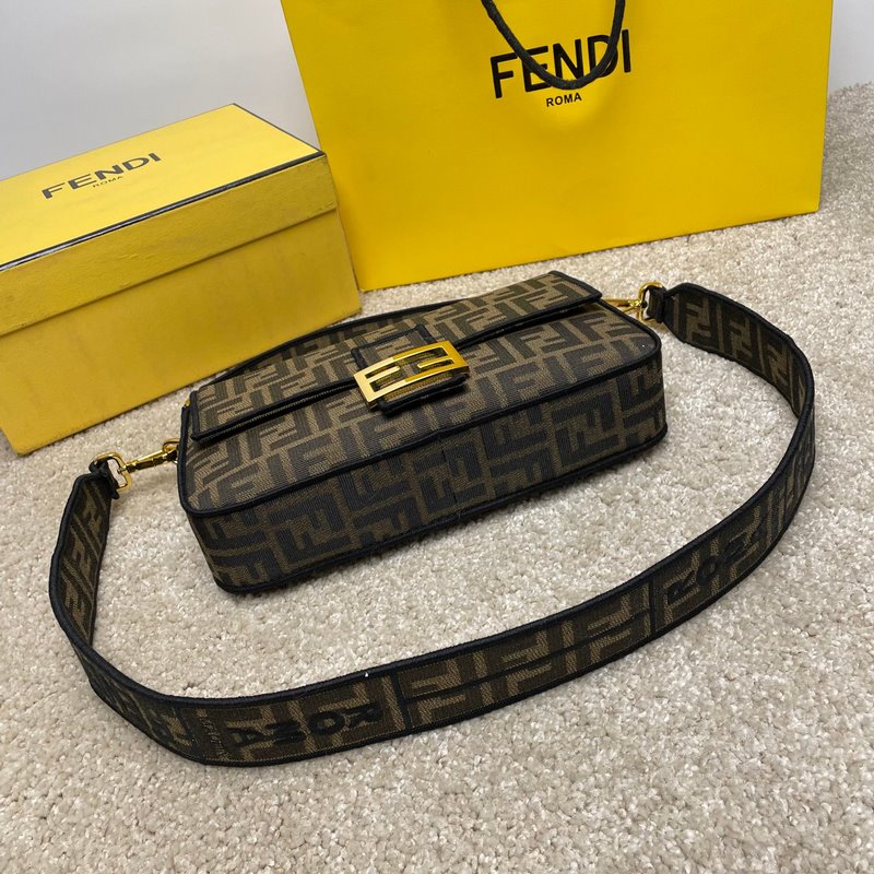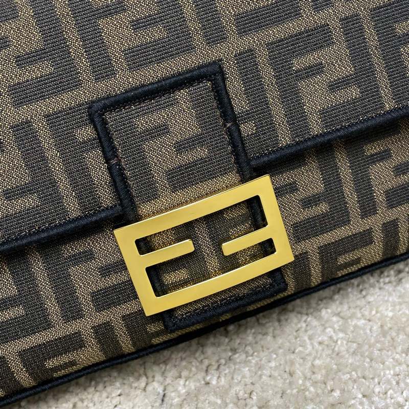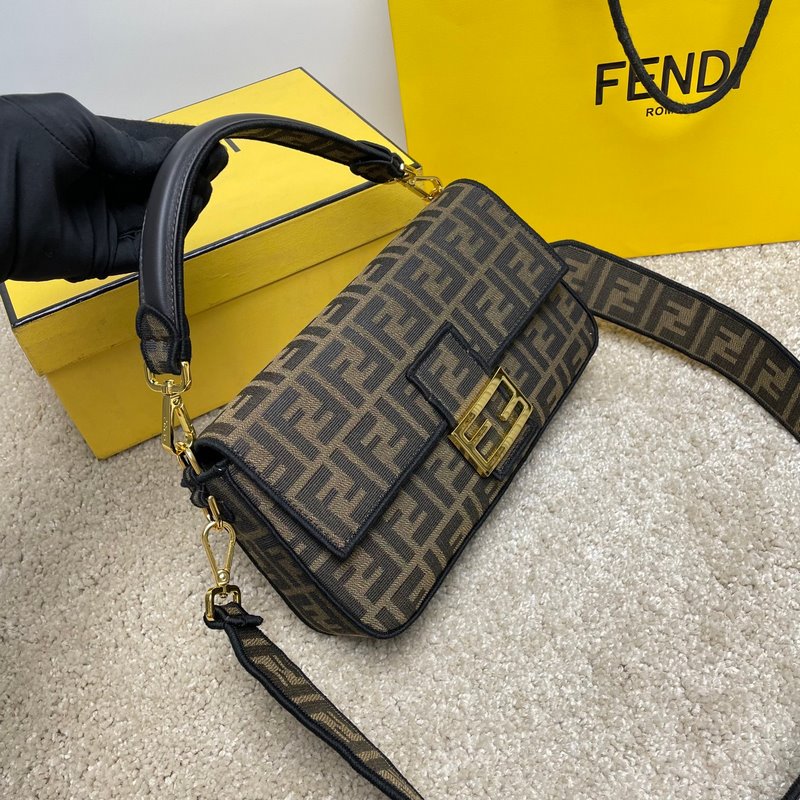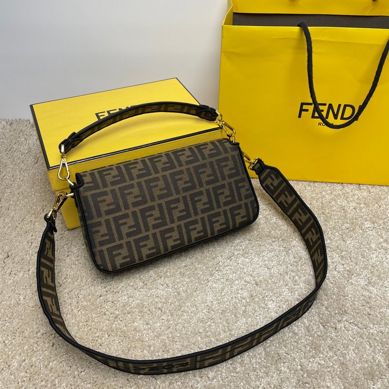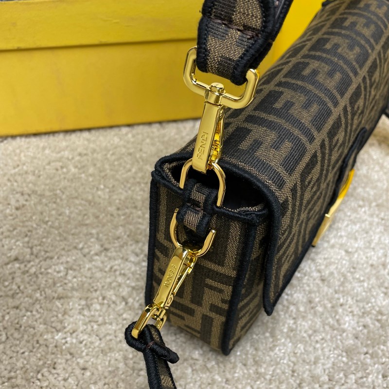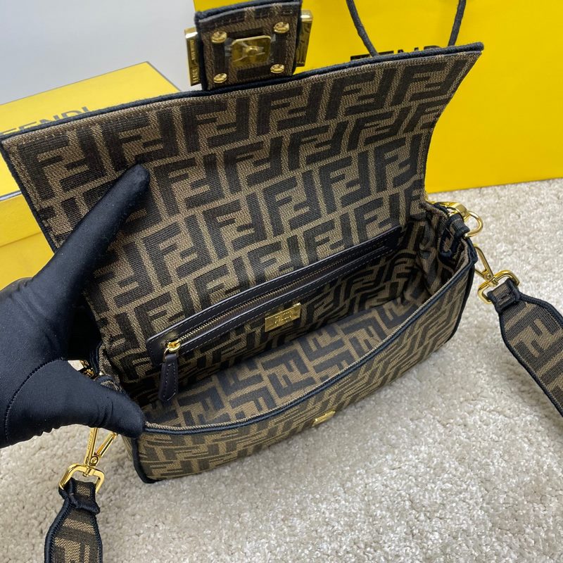 Fend1’s iconic Baguette Medium handbag features a flap design with FF magnetic clasp and lining with zipper pocket. Equipped with a detachable shoulder strap for hand or crossbody. Made of fabric, decorated with FF pattern and pink satin stitch embroidered edges. Custom shoulder strap with pink Fend1 Label pattern.