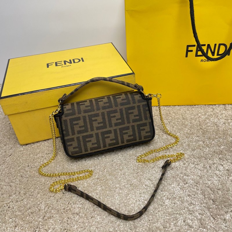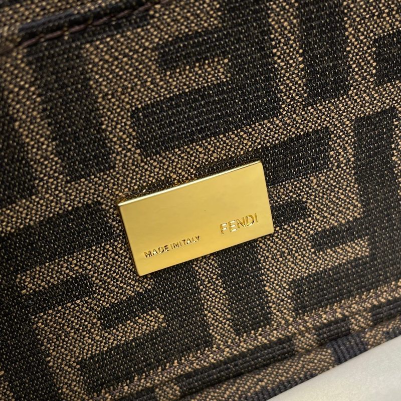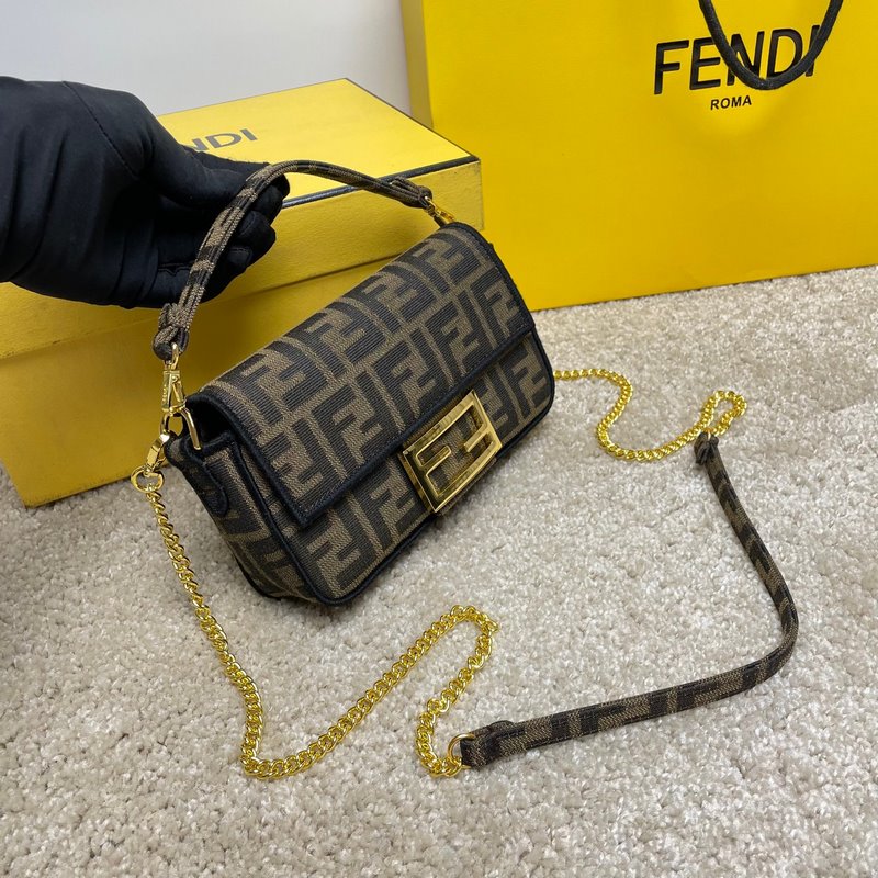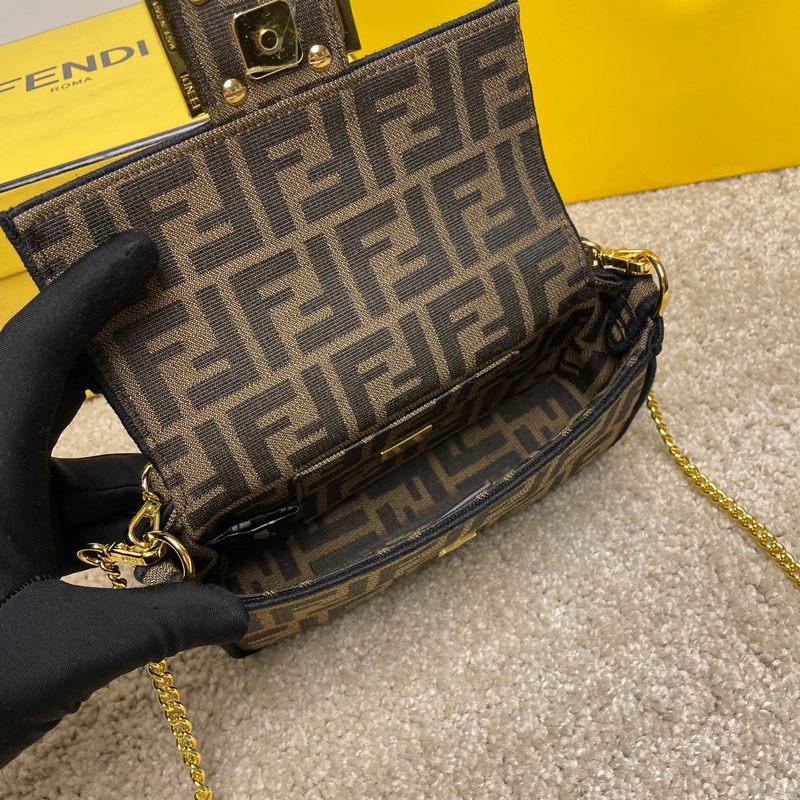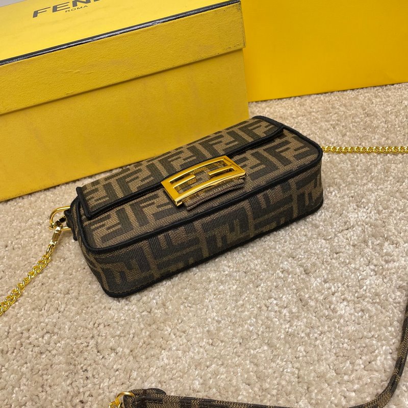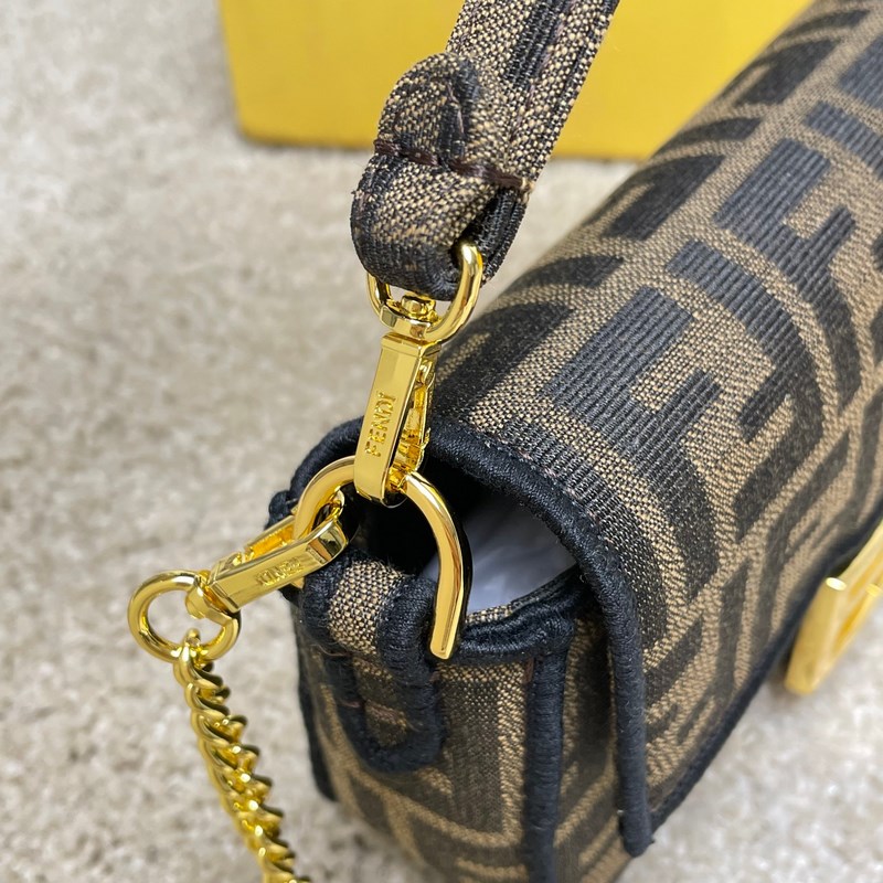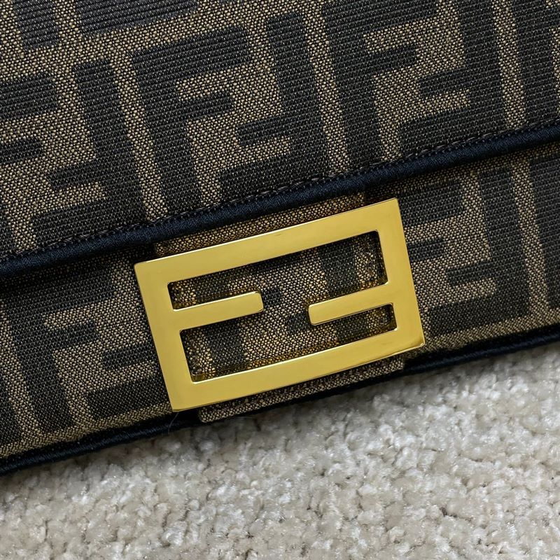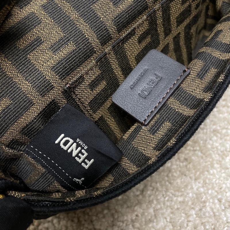 Fend1’s iconic Baguette medium handbag features a flap design with FF magnetic clasp and lining with zipper pocket. Equipped with a detachable shoulder strap for hand or crossbody. Made of fabric, decorated with FF pattern and pink satin stitch embroidered edges. Custom shoulder strap with pink Fend1 Label pattern.