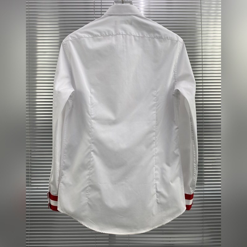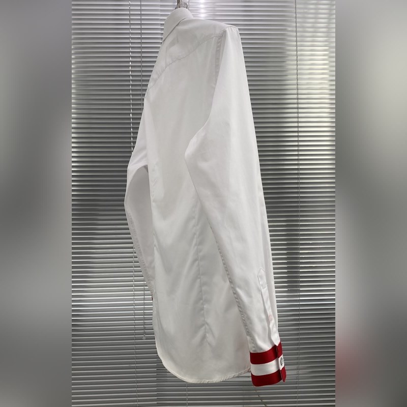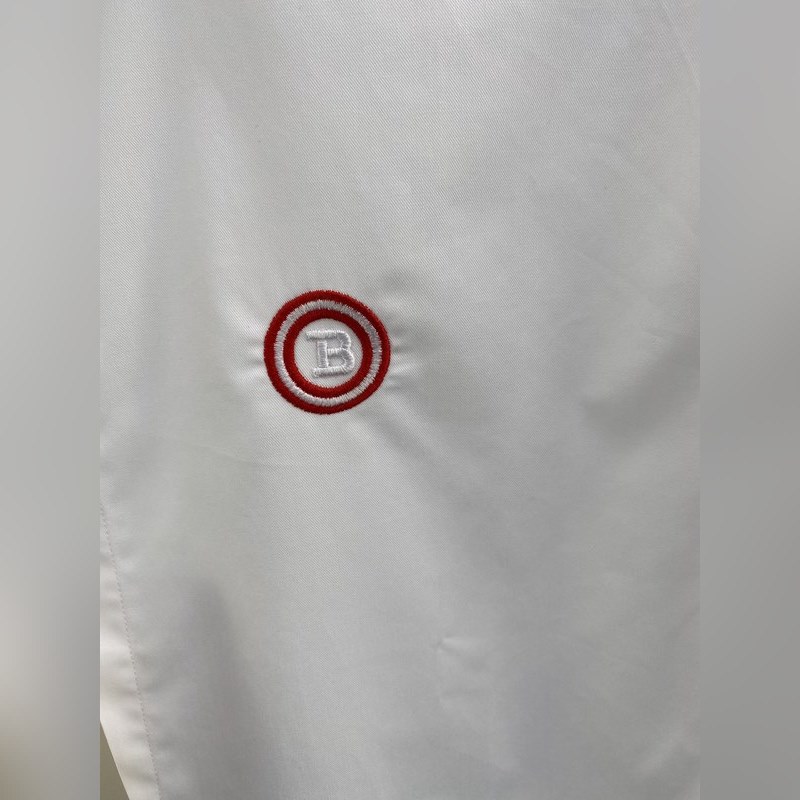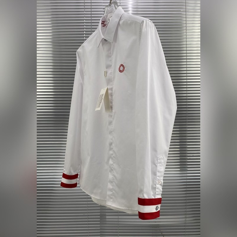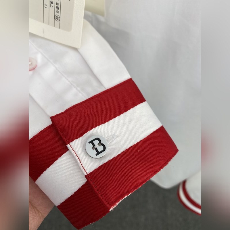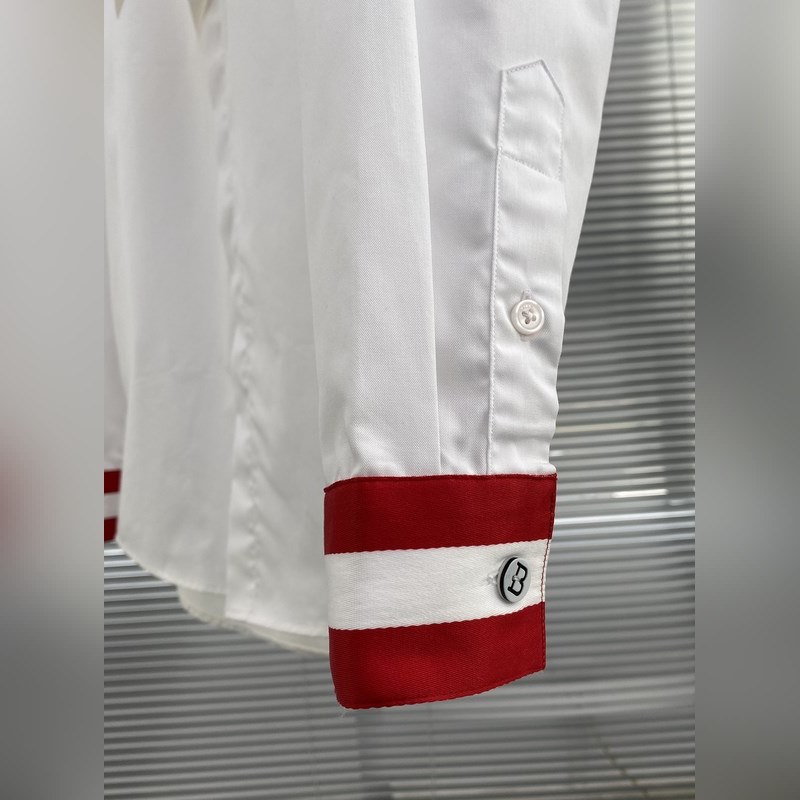 The satin fabric imported by Lutai Textile has a silky and thick feel after satin finishing. The fabric has a double yarn count of 140 and a weight of 146 grams. The chest is embroidered with a colorful brand logo with a high-quality thread. The first button of the collar and the cuffs each have a big B Logo. The rest are spiral buttons and laser BALLY letters. It is a high-end product at first glance. The cuffs have a classic ribbon contrasting color design.
