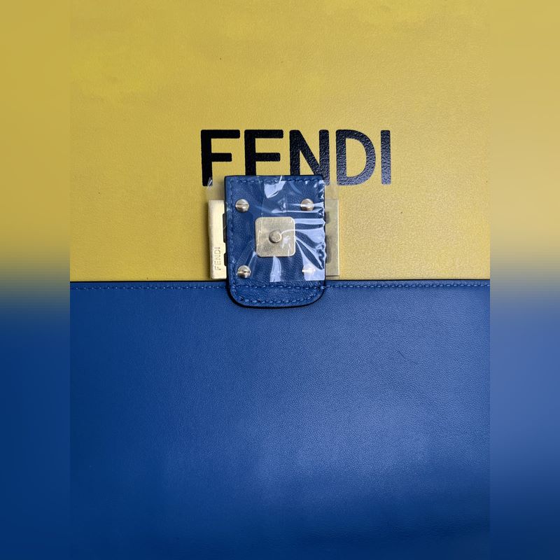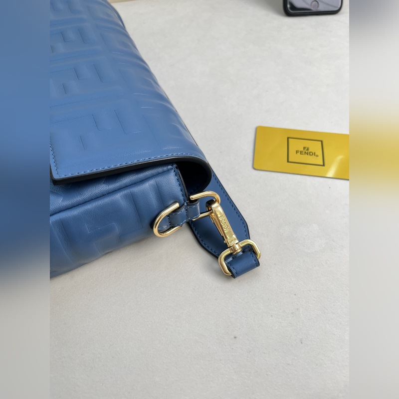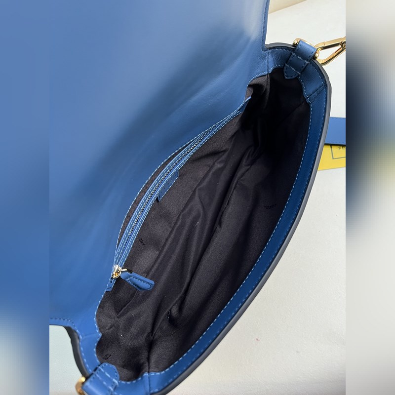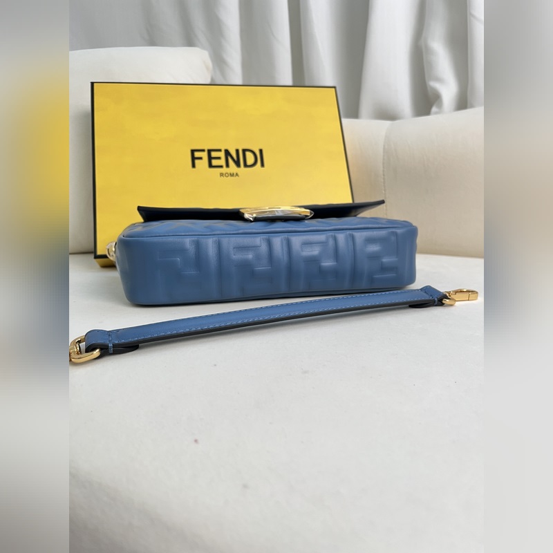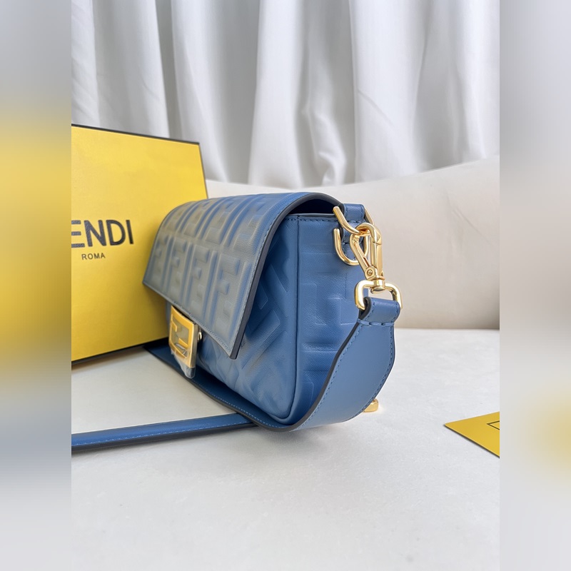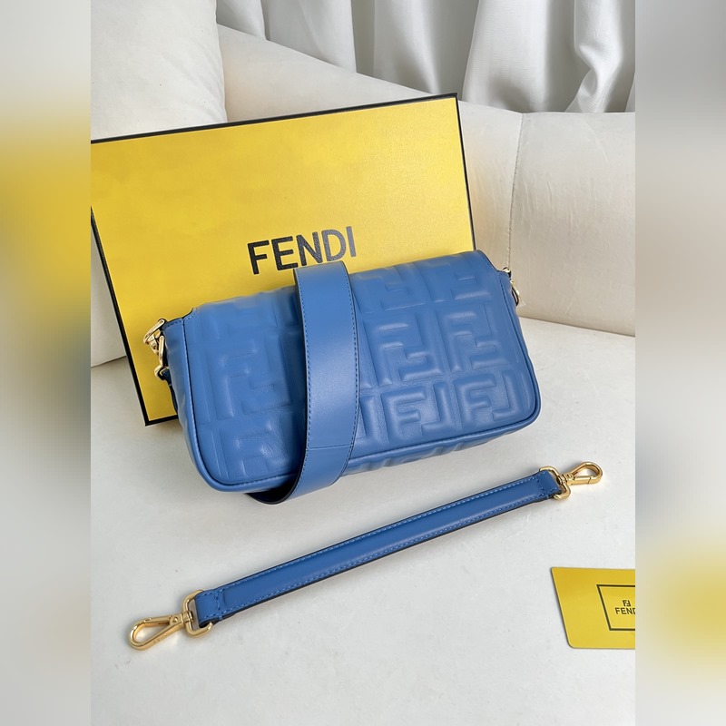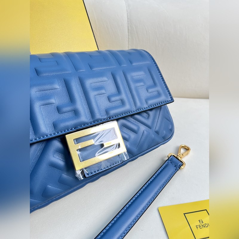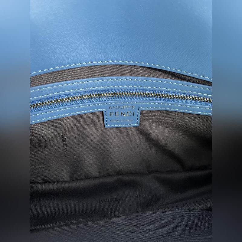 Baguette Bag Leather Bag More details Iconic Baguette medium bag in soft nappa leather with three-dimensional textured FF motif. Decorated with FF buckle. Features front flap, magnetic clasp, lined interior compartment, zip pocket and gold-tone hardware. The bag has removable handles and shoulder strap and can be carried by hand, on the shoulder or across the body. Made in Italy Materials: Outer: Lambskin, Lining: Cotton, Depth: 6 Length: 27 Height: 15