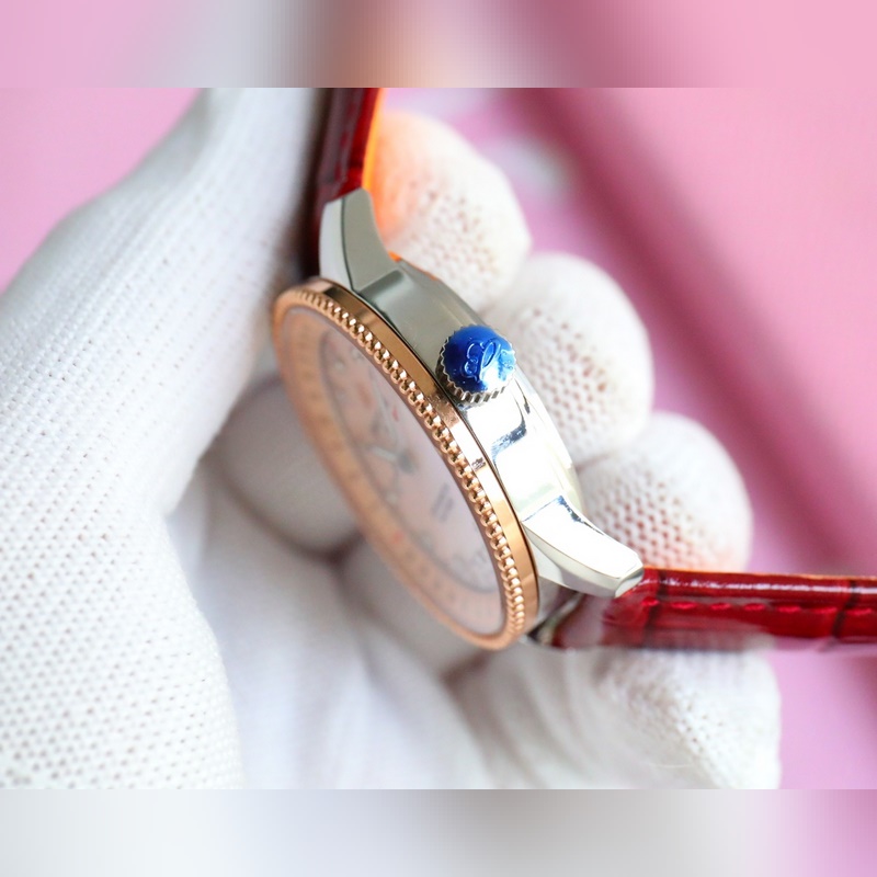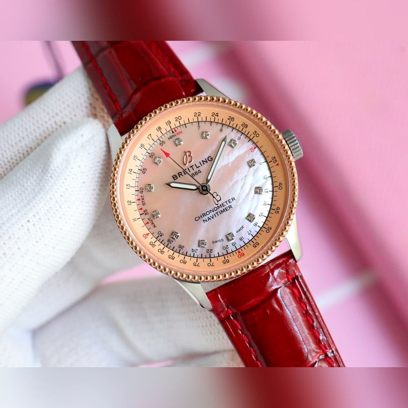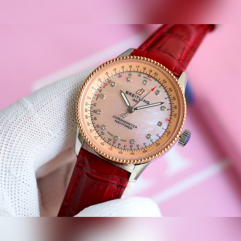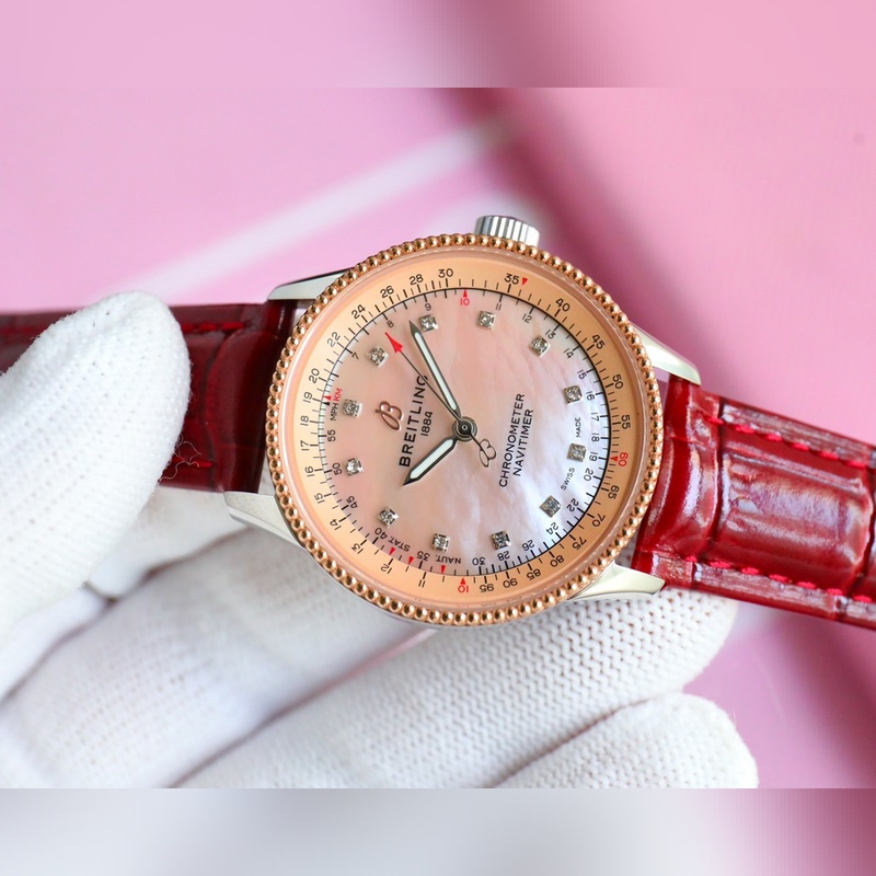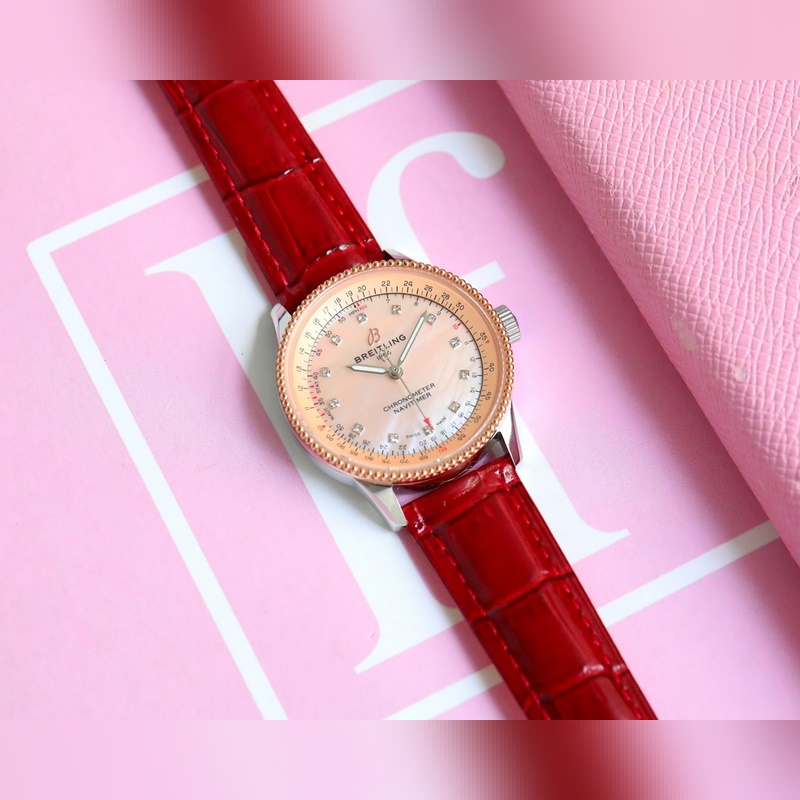 Breitling Women’s Aviation Chronograph Automatic Model. The first new model to arrive on the market, the women’s model is exquisite and elegant, carefully combining the classic historical charm with the sophisticated modern watch design. The watch uses a 35mm case, which is synchronized with the original thickness of 9.9mm. It is equipped with a beaded bezel that can rotate in both directions and a series of elegant and sophisticated dial styles, such as silver, blue, copper dials or diamond-set white mother-of-pearl dials. The case is made of 316L stainless steel and has a sapphire crystal glass mirror. The watch is equipped with the original Swiss SW200-01 automatic mechanical movement (that is, the Breitling official certified Breitling original cal.17 movement) 2824 movement. The strap is made of cowhide strap and original fine pin buckle. It is carefully designed to fit the wrists of all women. It is high-end and durable. Although the good work is late, it is full of sincerity.