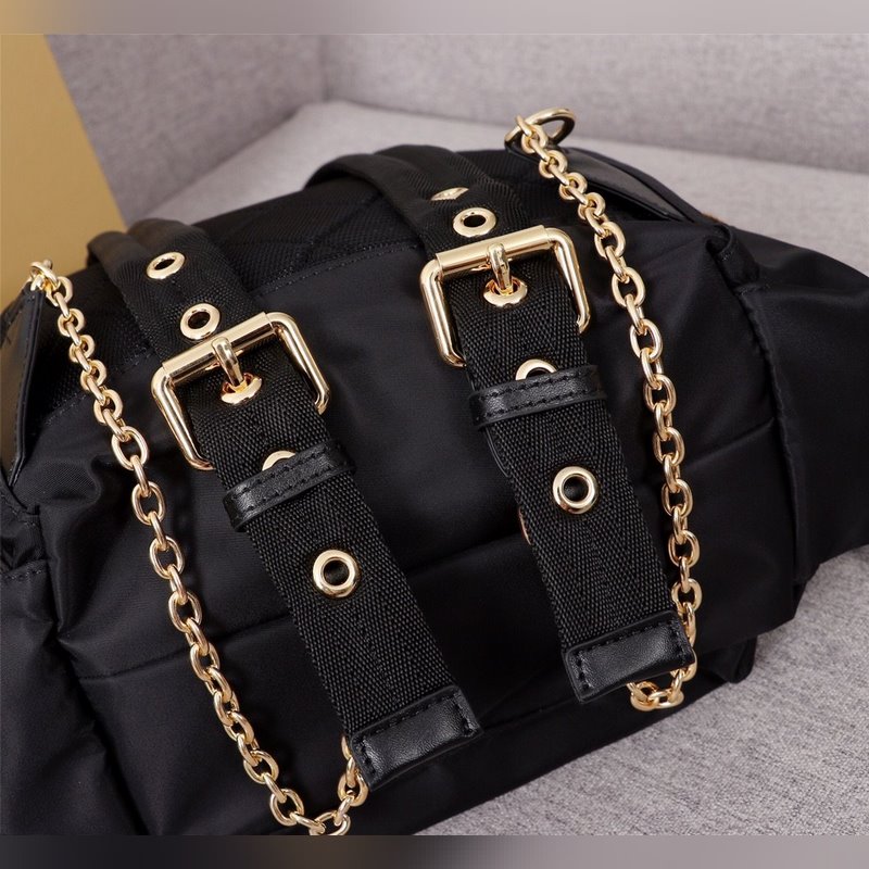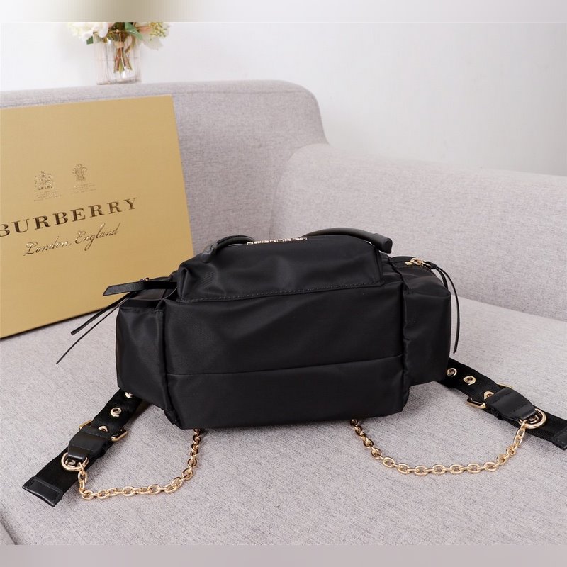 The lightweight and rainproof backpack is inspired by the iconic trench coat fabric. It is made of flexible nylon material with the same dense woven structure as cotton gabardine. 3 zippered outer pockets; 1 inner slip pocket; 1 zippered inner pocket Leather top handle; adjustable canvas and chain shoulder strap buckle and drawstring closure Front pocket decorated with Bur*erry three-dimensional letter logo Size: 22-14-33CM No.: 9618760