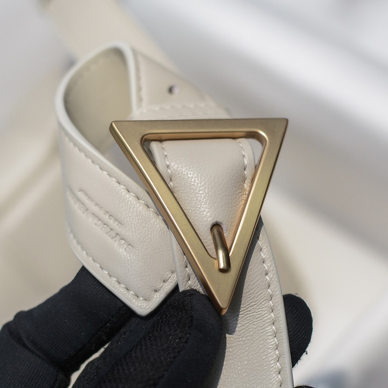 The bag can be held or worn cross-body, it is elegant and simple, with sheepskin lining, no interior lining, smooth nappa lambskin zipper pocket, adjustable thin shoulder strap with iconic triangle buckle, Size: 26x18cmx8cm Number: BV96181320