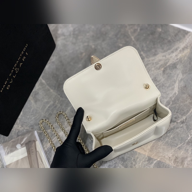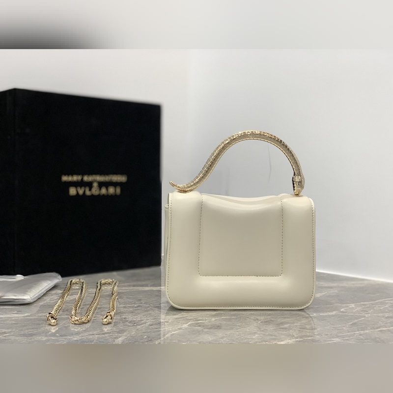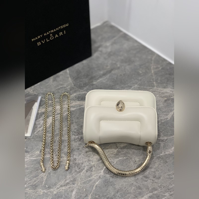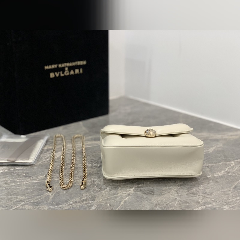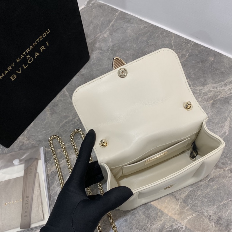 “MARY KATRANTZOU” series reinterprets the classic SERPENTI pattern, inspired by the transformation of the spirit snake, and launches a new exquisite joint series. It is made of black lambskin and paired with gold-plated brass accessories. The gold-plated brass reinterprets the classic SERPENTI snake head buckle with charming crystal eyes. This special handbag has a storage layer, a detachable snake handle and a detachable chain shoulder strap. It can be used as a crossbody bag and is versatile. Small size, with an open pocket and an inner metal nameplate engraved with the “MARY KATRANTZOU X BVLGARI” logo. Dimensions: 19.2 X 15 X 6cm. Code: 291070