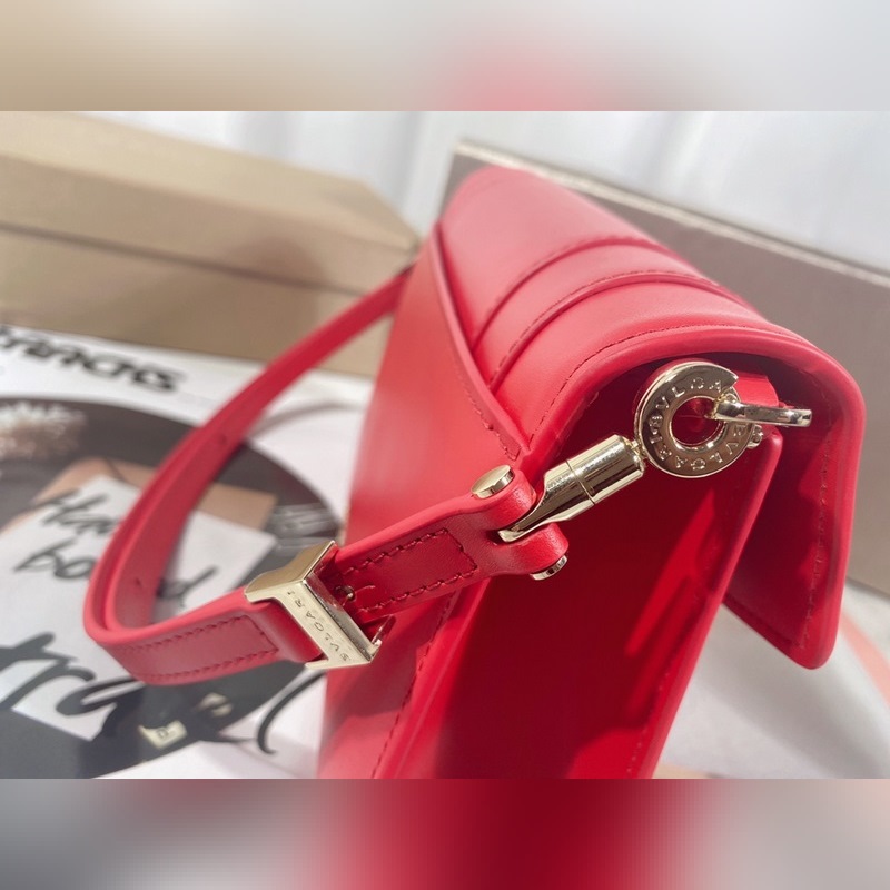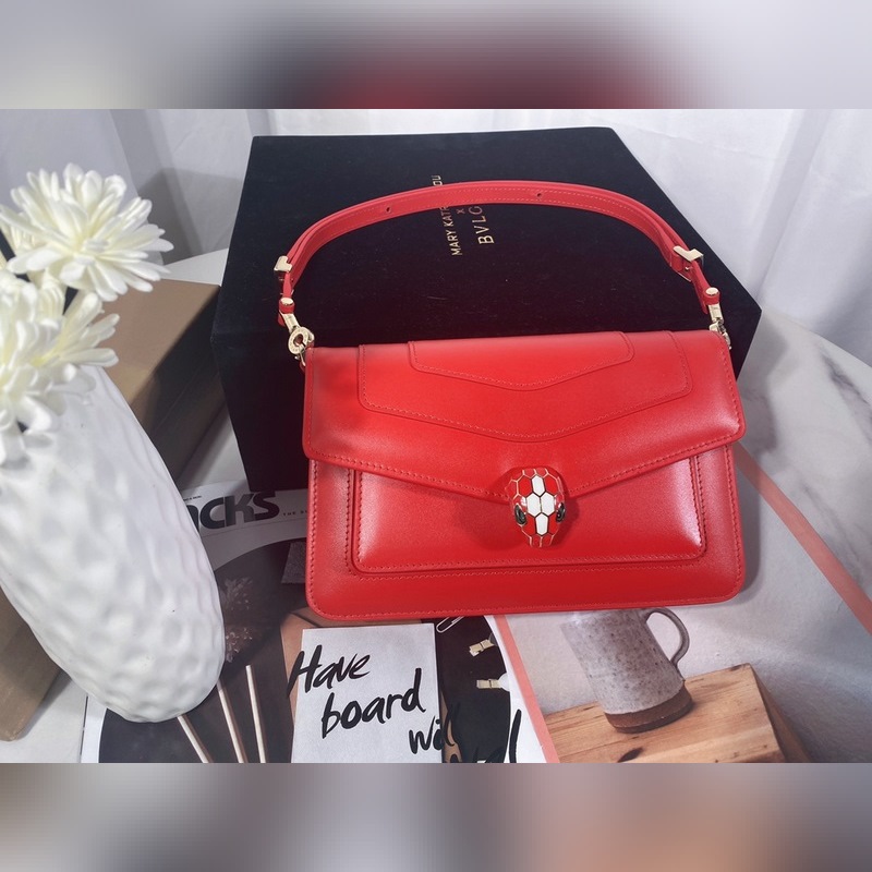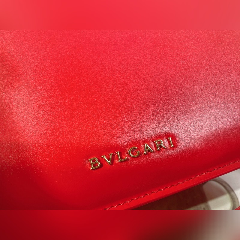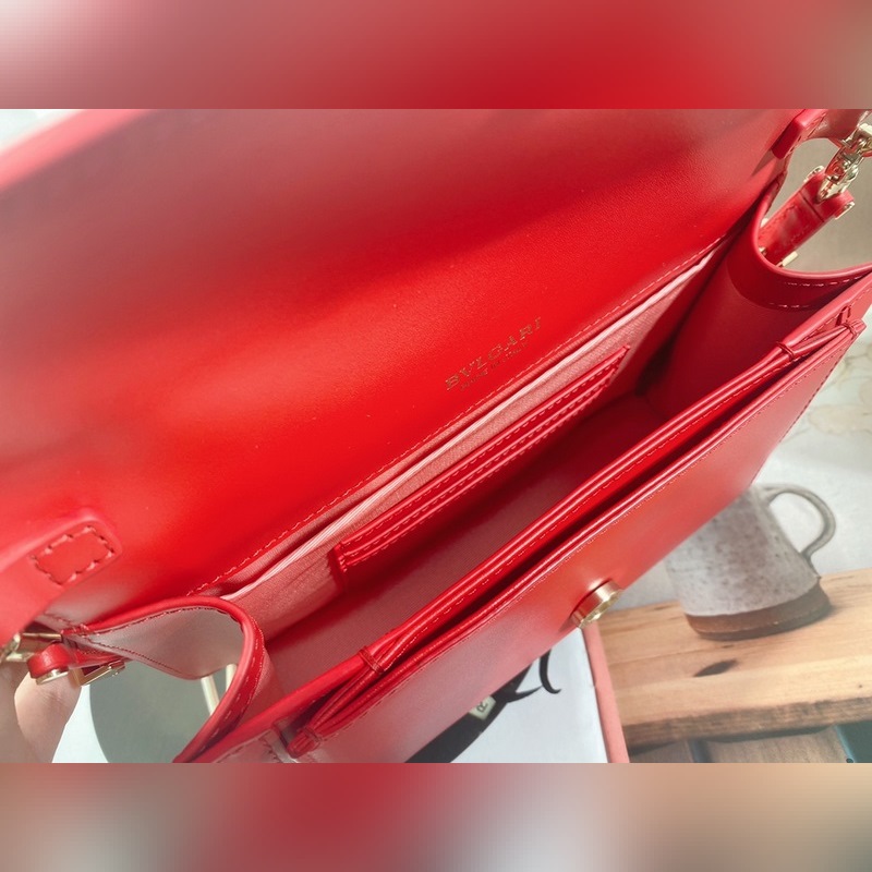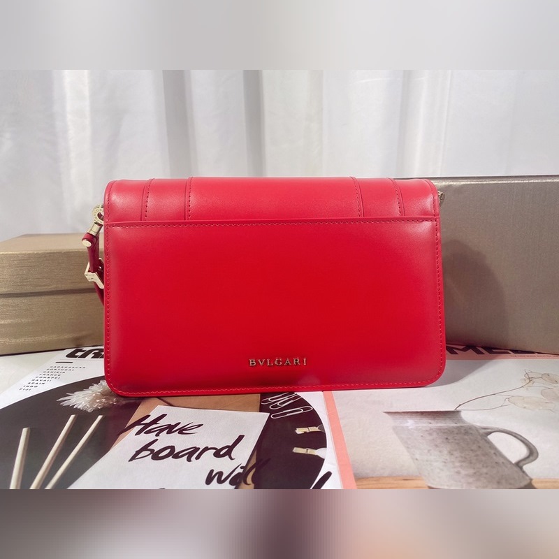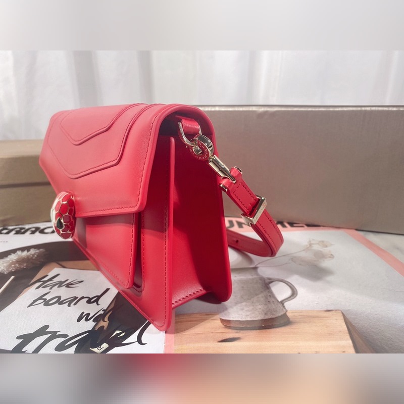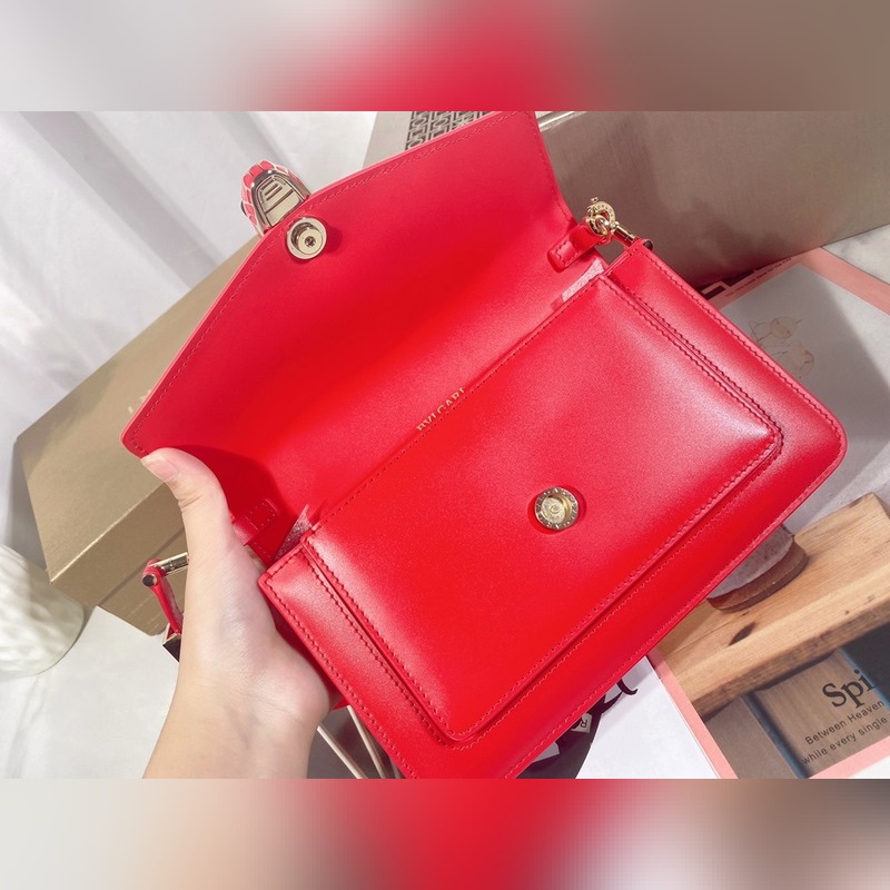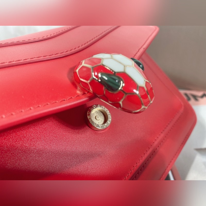 Made in fuchsia garnet red calfskin, this piece is paired with a practical leather shoulder strap and decorated with a classic snake head magnetic buckle, which is versatile and suitable for daily wear. It has a single compartment, a front pocket, a back patch pocket, an internal quilted line pocket, three card slots, a vanity mirror, and a BULGARI metal logo on the back.