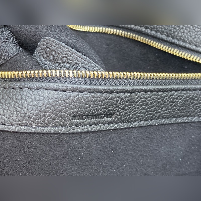Cow leather lining Calf leather/fabric Gold hardware Shoulder back Inside zip pocket and double flat pocket Functional drawstring to close the bag Handle drop 22 cm