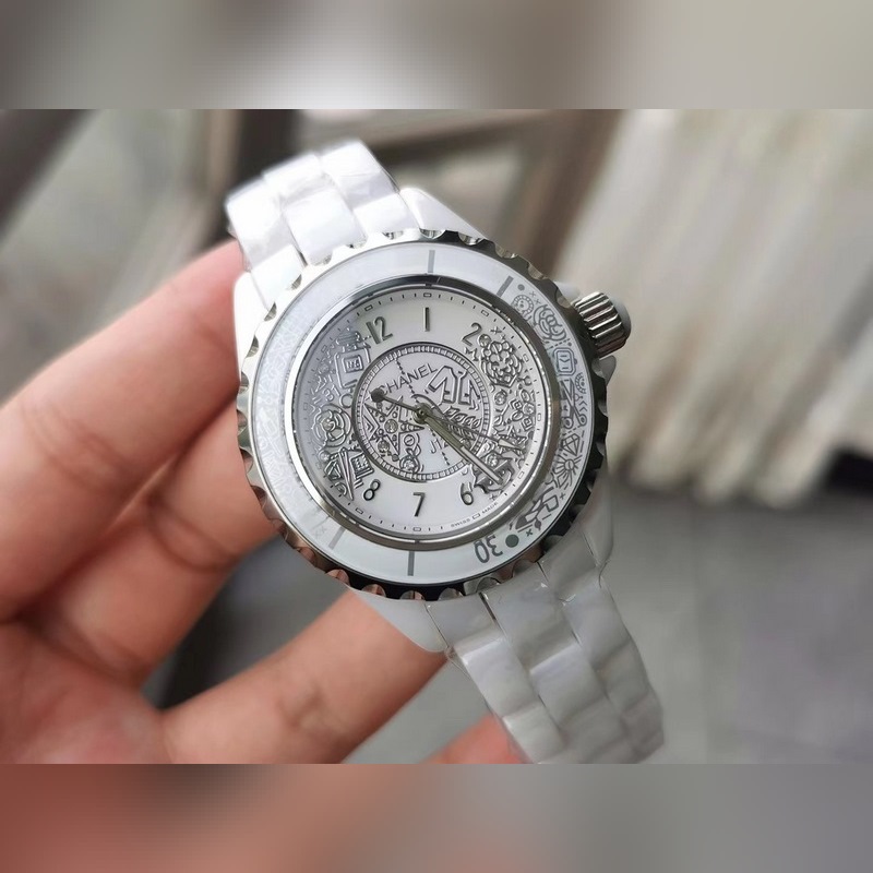 Using polished rhodium-plated decoration technology, all the classic elements and symbolic symbols of Chanel are engraved on the bezel and dial, and 12 diamonds are set on the dial, making the J12 watch one of Chanel’s most important classics in a symbolic and totemic way (33/38 sizes available