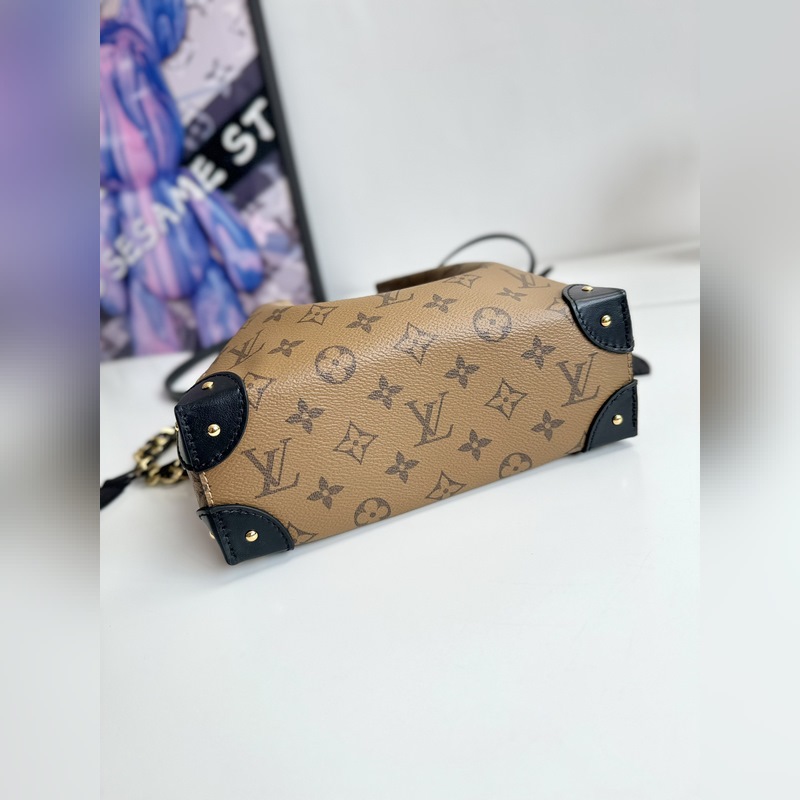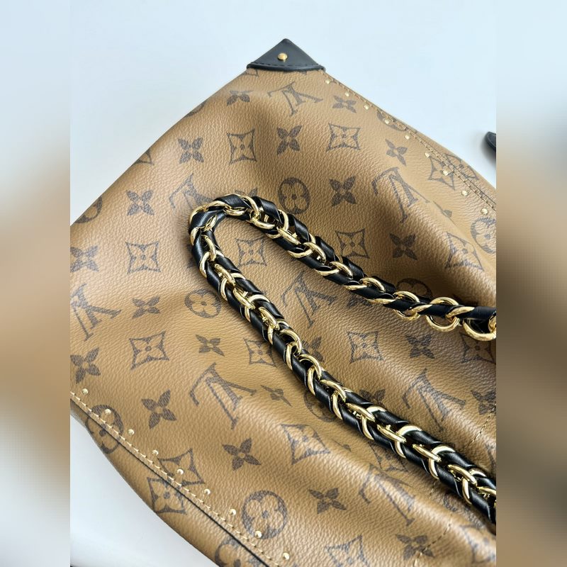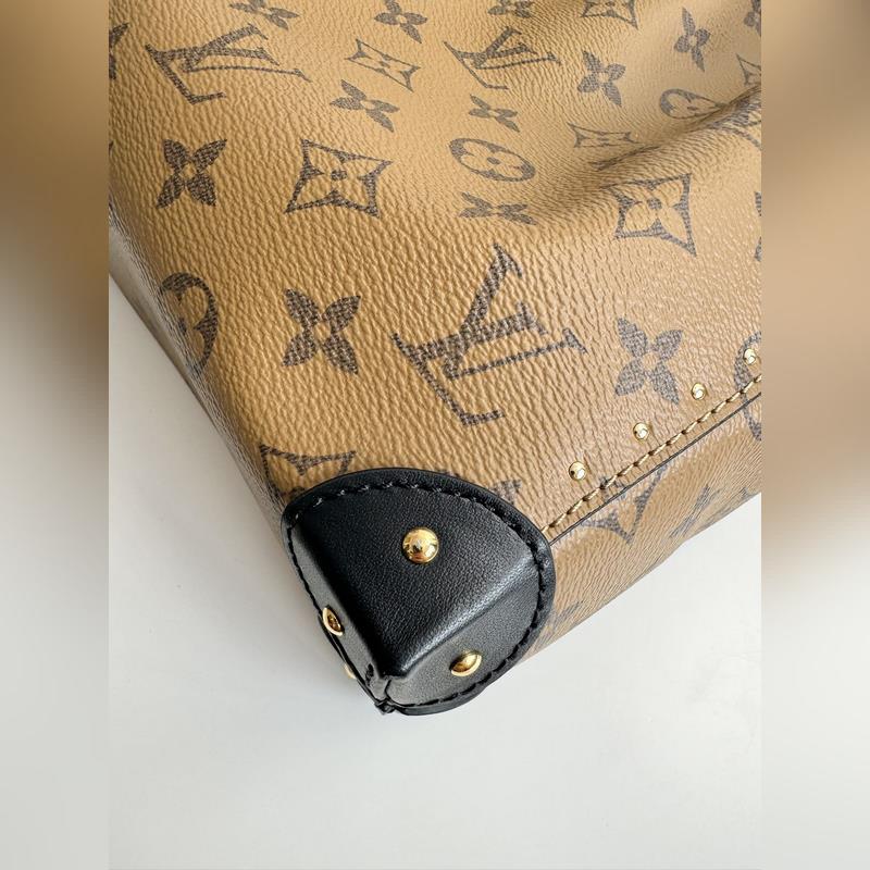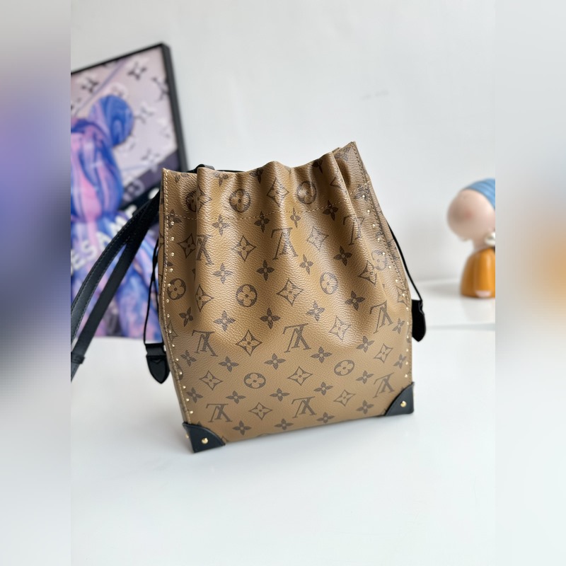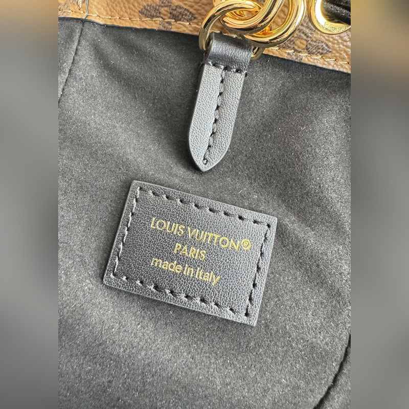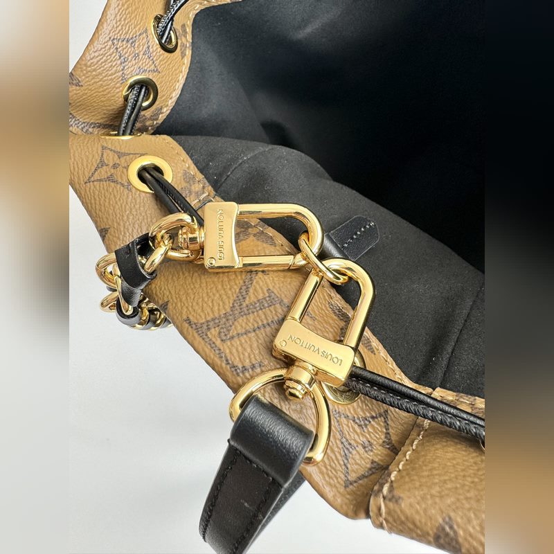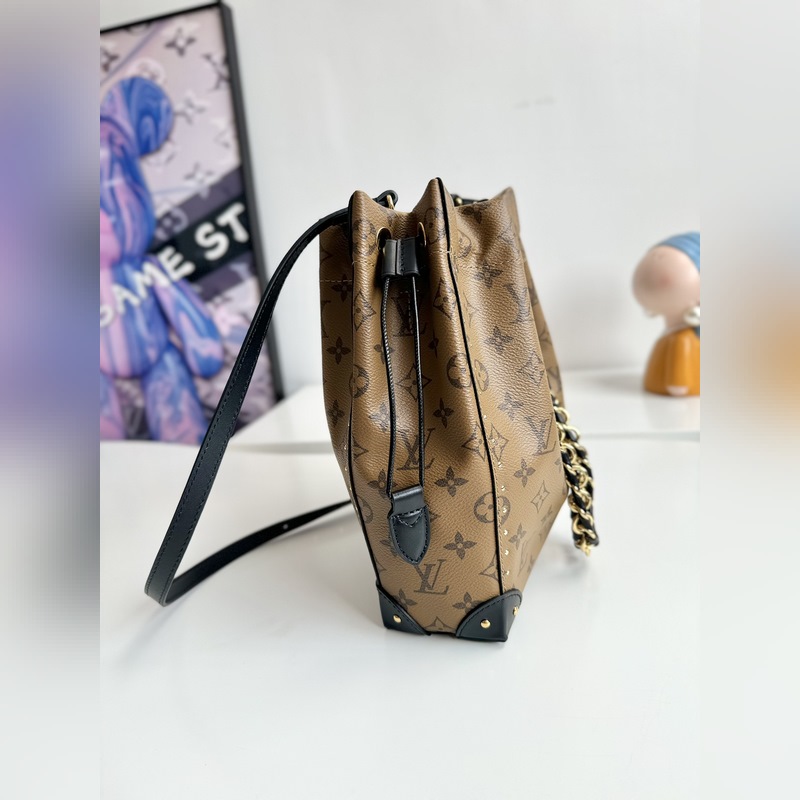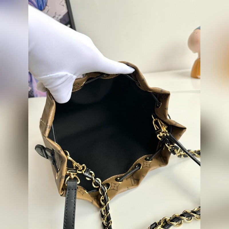 『Dynamic chip with counter packaging』 Exclusive real shot of the overseas original M13324 2025 Cruise early spring series reinterprets the classic Noé handbag, adding a new member to the Trunk family. The Monogram Reverse canvas bag is equipped with a dazzling braided chain, and the leather corners and drawstring closure continue the iconic details. You can recreate the show style by hand or crossbody. Size: 23×23×9cm