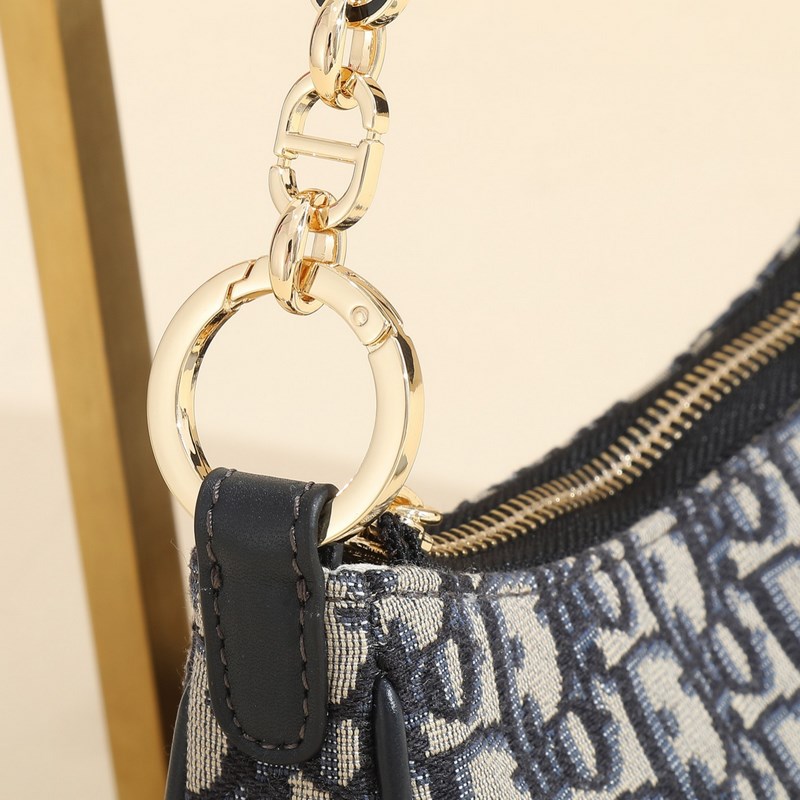 New for Summer 2023, this CD Lounge bag embodies Dior’s modern aesthetic and couture style. Crafted in blue Oblique printed fabric, it highlights the classic Dior pattern. The classic chain is paired with leather, alternating with gold-finished metal and enamel links in the same tone. The design is foldable and can be carried on the shoulder or by hand.