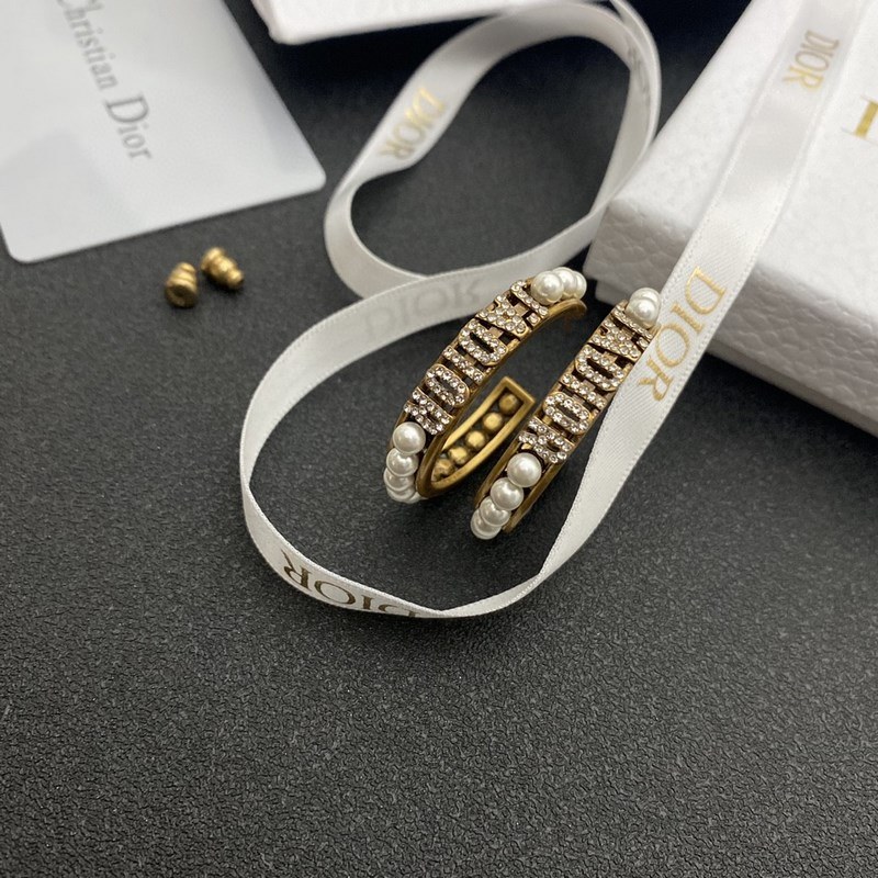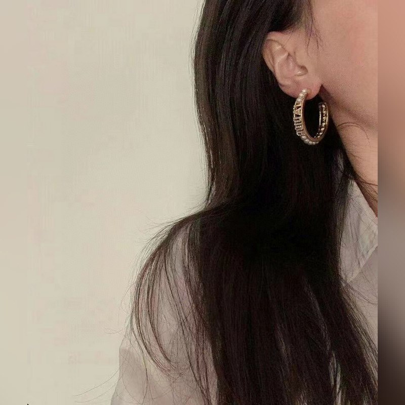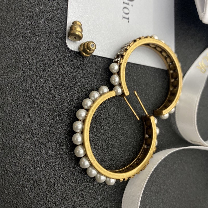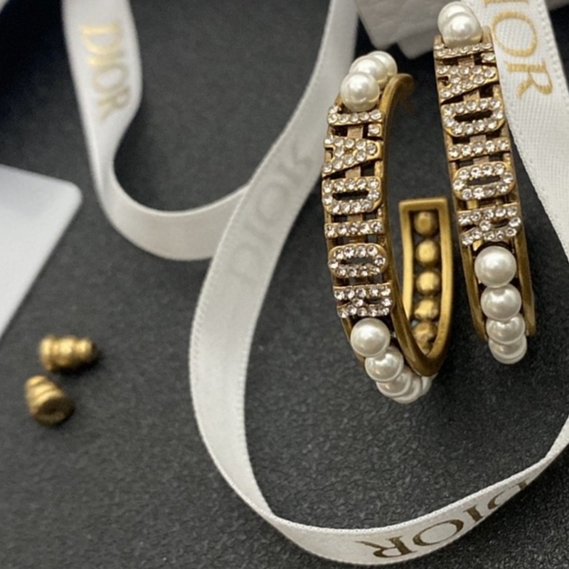 Dior Crystal Diamond Hoop Letter Pearl Earrings