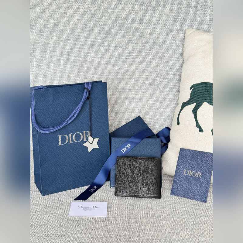 Snap closure coin compartment with gussetMetallic brass Dior logo on the frontEmbossed Dior logo on the insideDust bag included