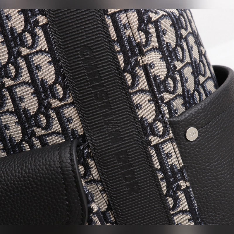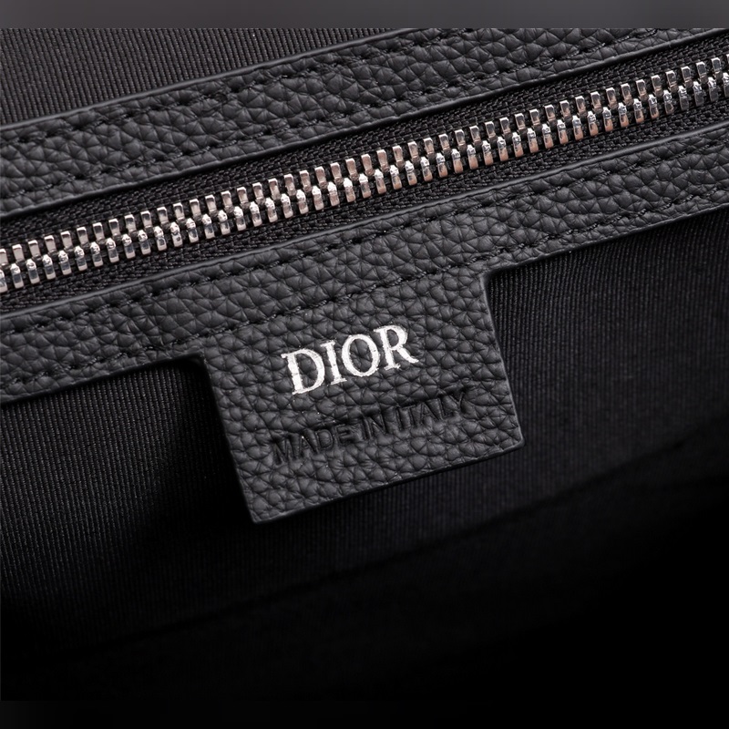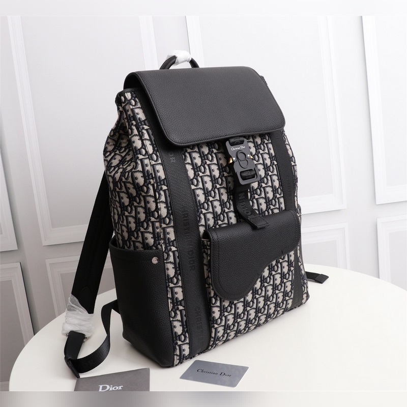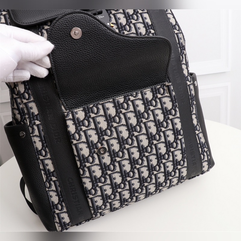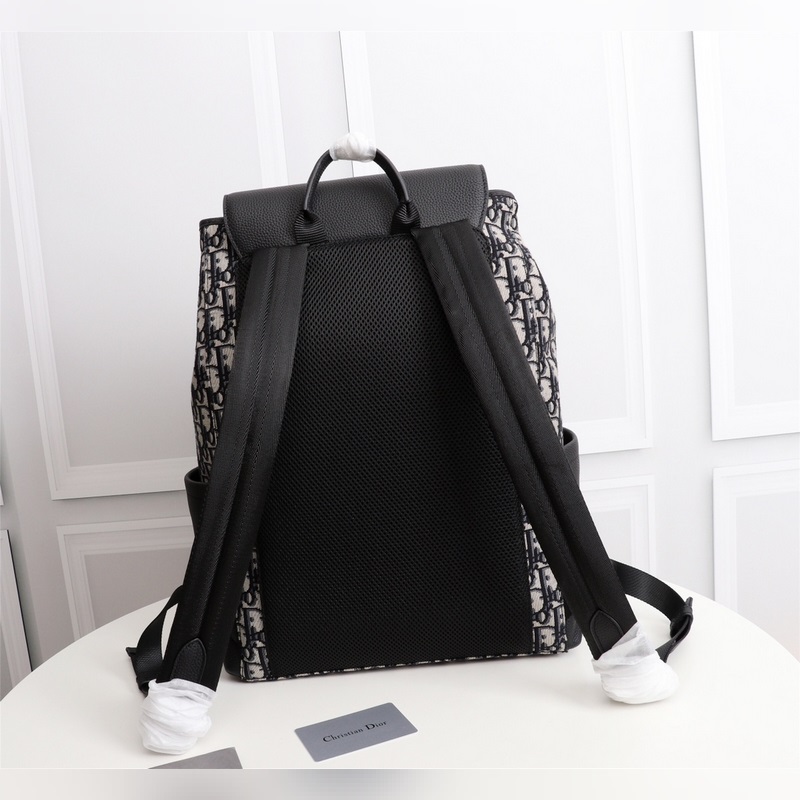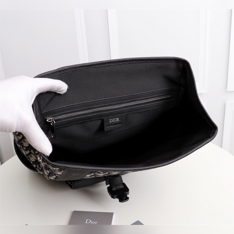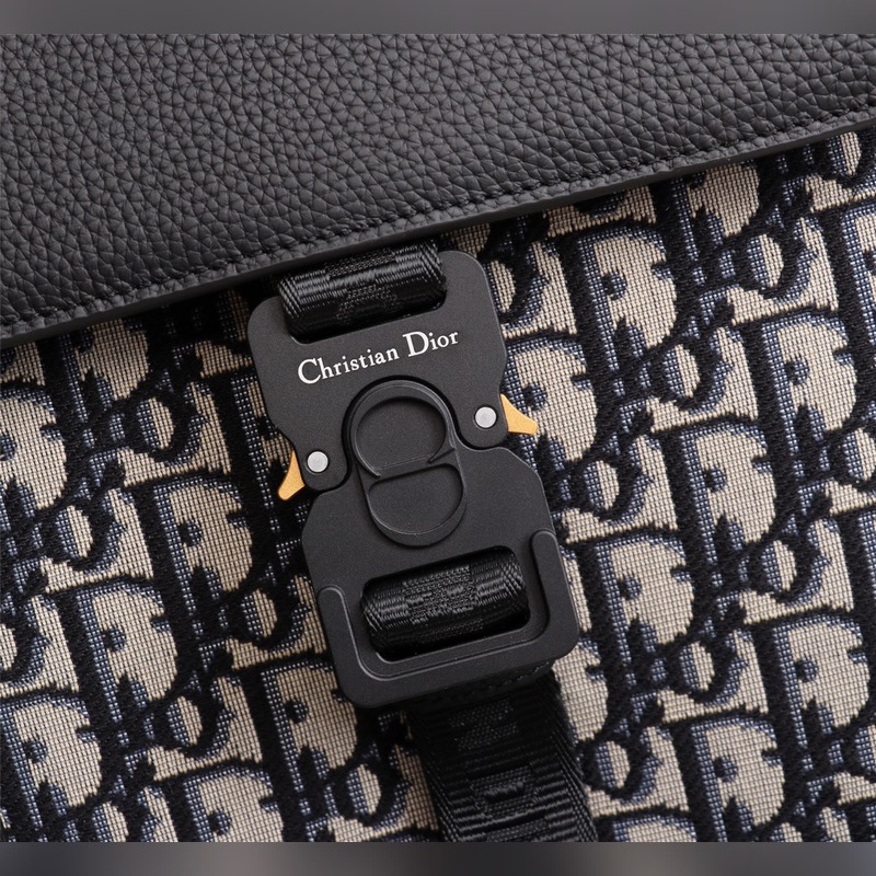 Beige and black Oblique print Black grained calfskin leather “Christian Dior” embossed logo panel on the front “DIOR” embossed logo on the inside Black grained calfskin leather flap with “Christian Dior” logo “CD” aluminum buckle with side snap closure Flap pockets with gussets on the front Adjustable padded nylon shoulder strap Top leather handle Quilted mesh fabric reinforced back Side patch pockets Internal zip pocket Dust bag included