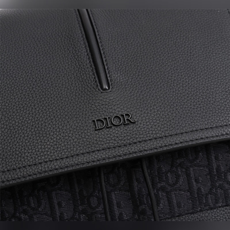 Beige and black Oblique print Brass metal-coated “DIOR” logo on the front Embossed “DIOR” logo on the inside Grained calfskin leather flap and drawstring closure Adjustable padded nylon shoulder strap Top calfskin handle Front leather flap pocket Internal laptop compartment Internal patch pocket Can be carried by hand or on the shoulder