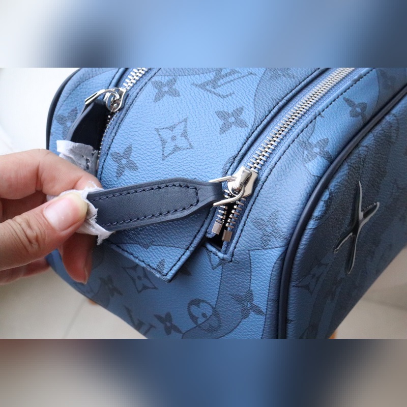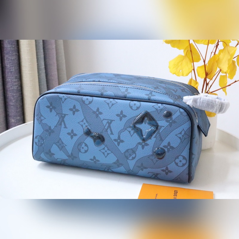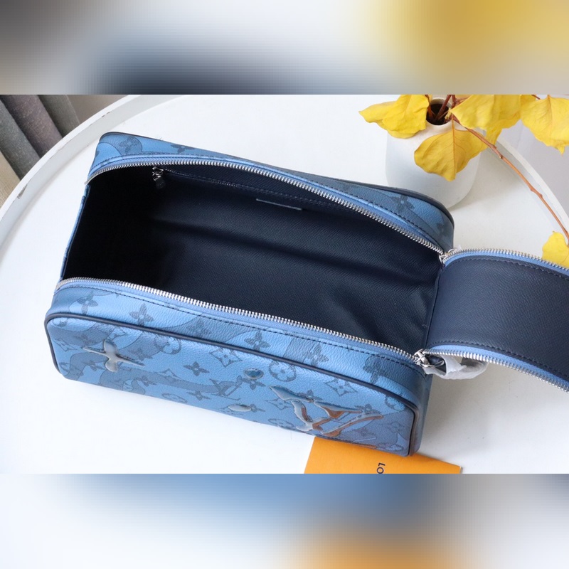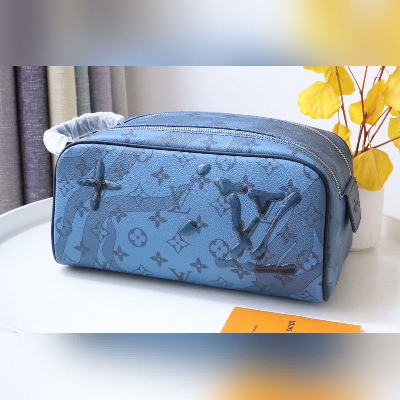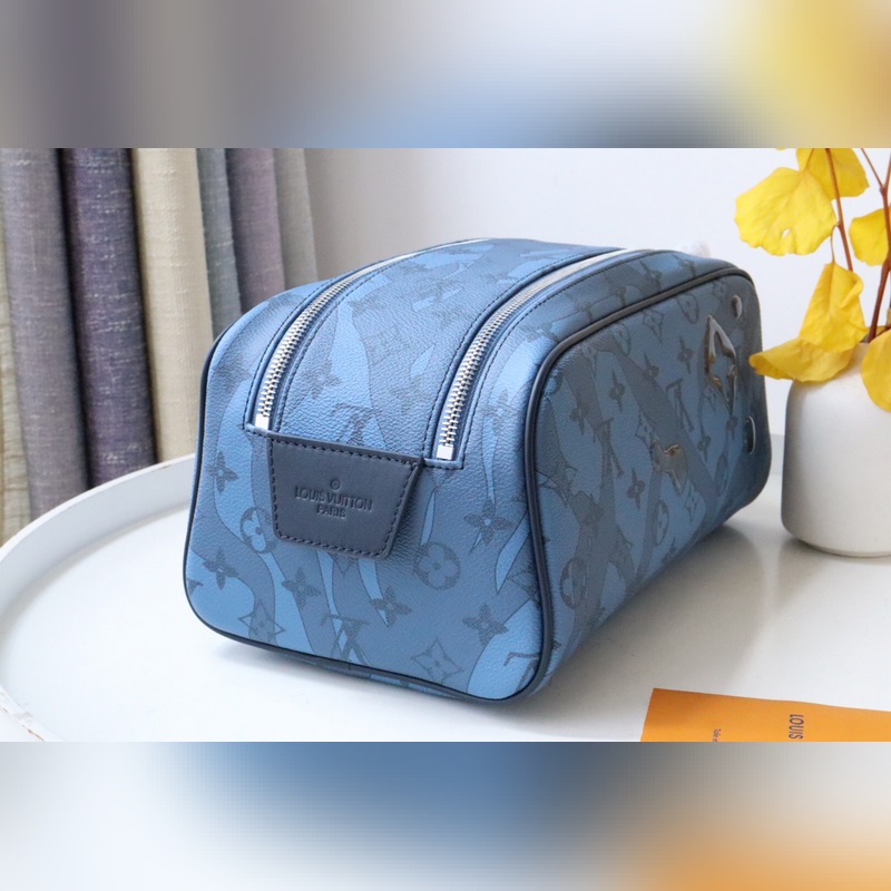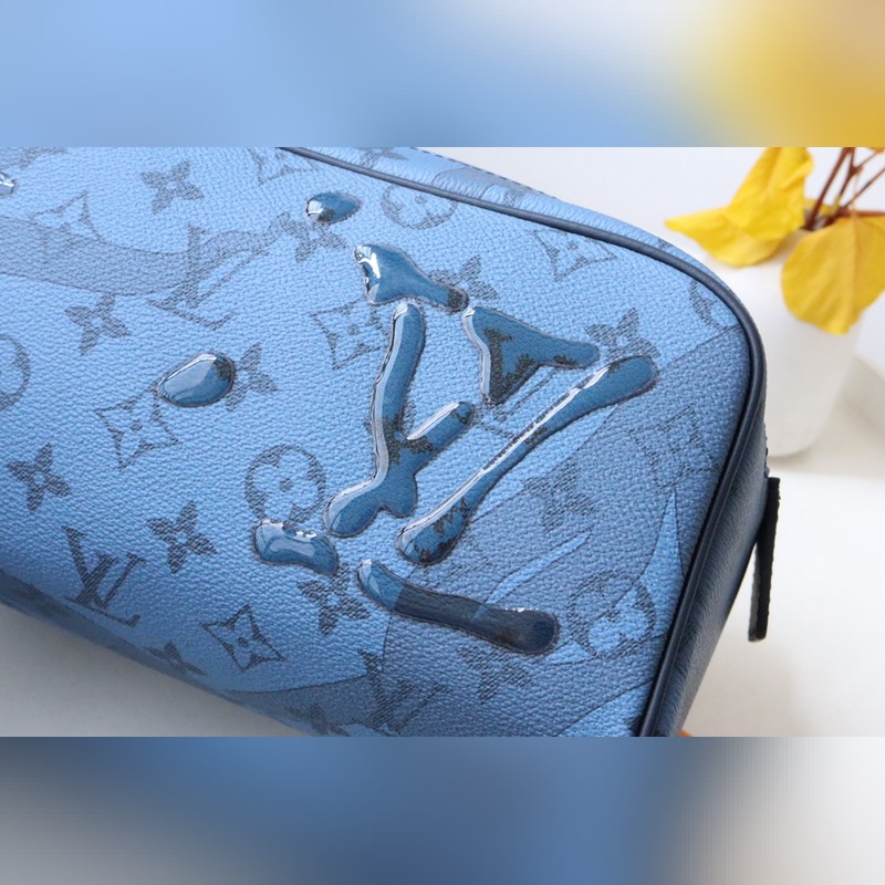 Dopp Kit toiletry bag M82337 Water Drops This Dopp Kit toiletry bag is made of Monogram Aquagarden canvas, with a three-dimensional water drop effect to reinterpret the LV letters and Monogram flowers, as if splashed on the Monogram pattern and seaweed print. Double zipper for secure storage, with washable lining.