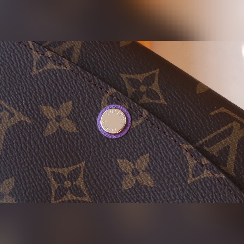 Emily Wallet with coordinated Monogram canvas material and leather lining in a light color. Exquisite rectangular design with practical interior. Item that can also be used as a clutch. Round flap with silver stamped stud-type locking device with engraved details. Leather trim in a color matching the lining.