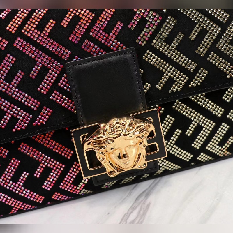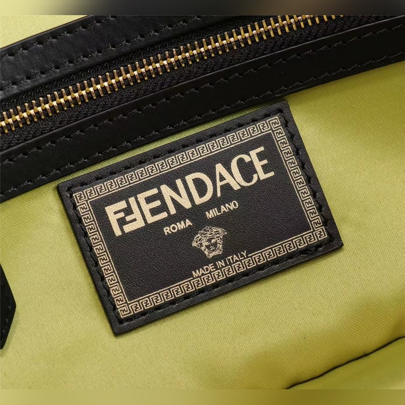 With FF magnetic clasp. Lined interior with zip pocket. With removable shoulder strap, the bag can be carried on the shoulder or across the body. Made of green nappa leather (lambskin). Decorated with embossed FF pattern. Gold metal parts Dimensions: 26x5x15cm