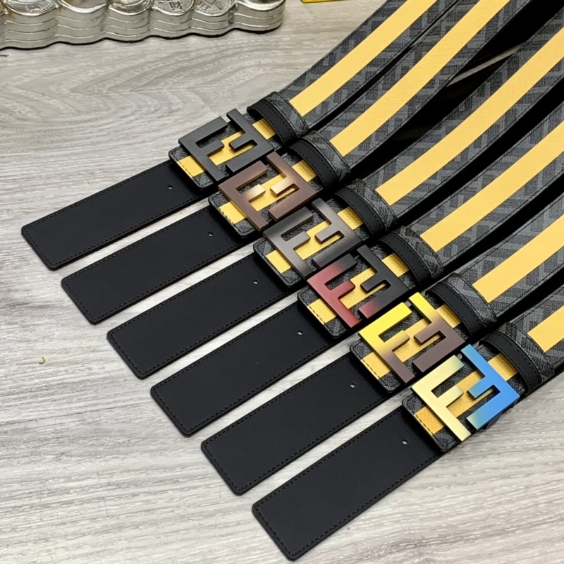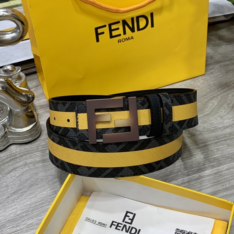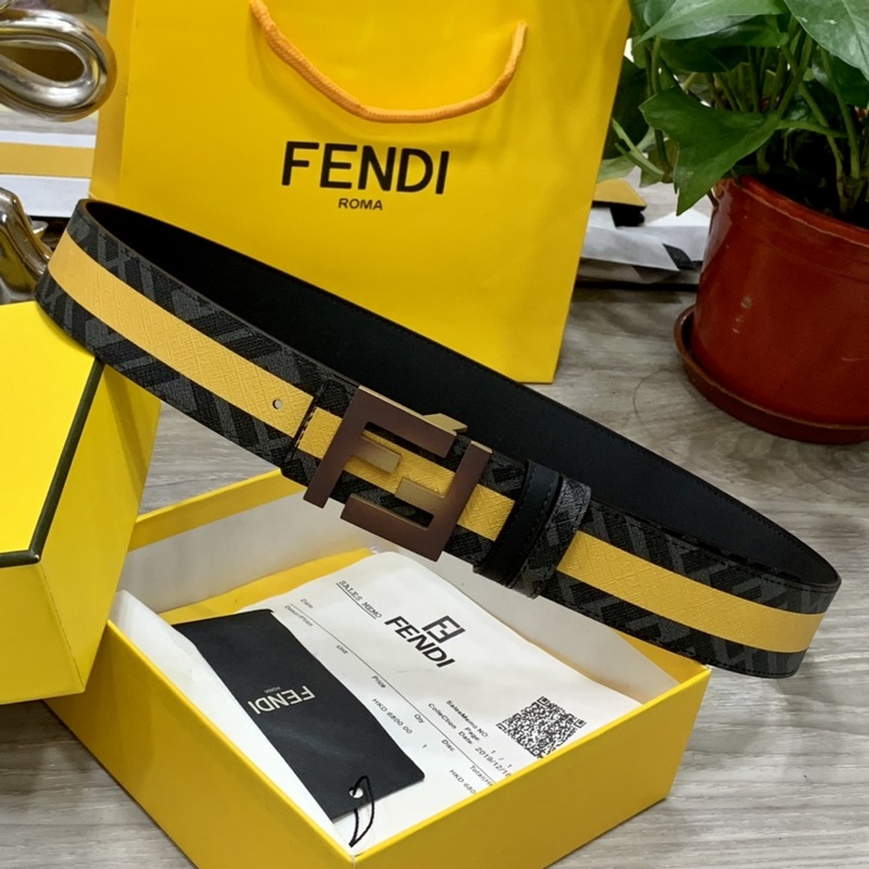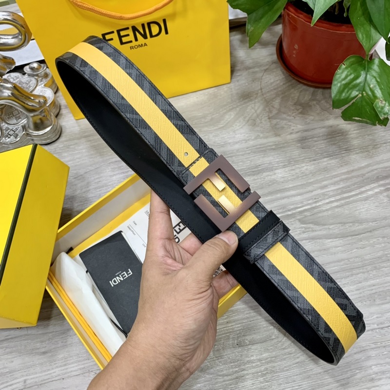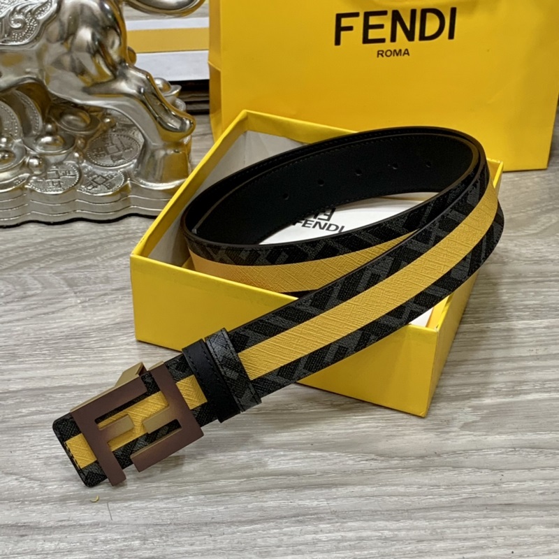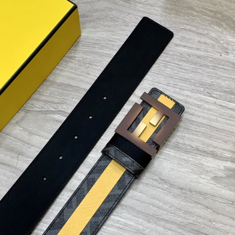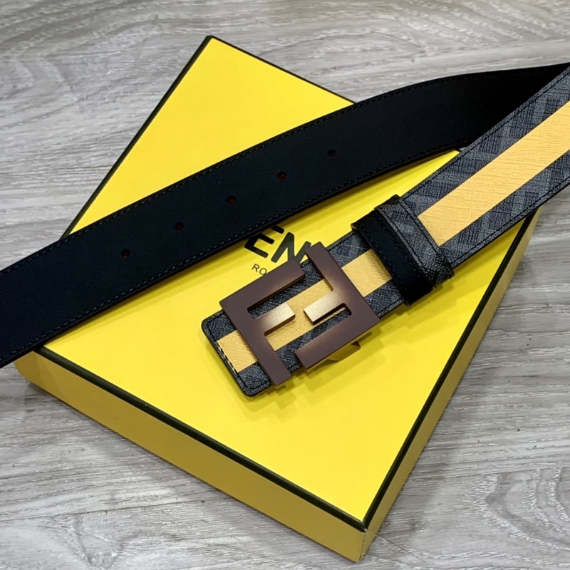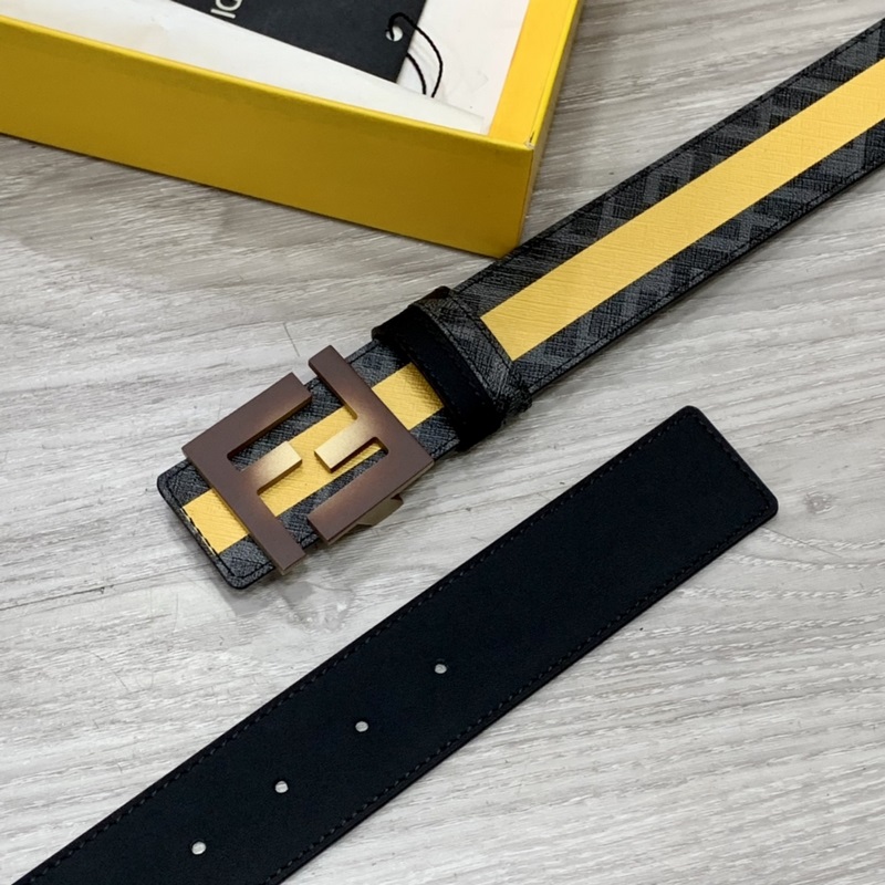 FENDI counter style 4.0cm wide double loop reversible belt FF snap buckle Black Cuoio Romano leather material Tobacco yellow and black FF pattern on the reverse side Square diamond metal finish Fashionable and classic All-match style