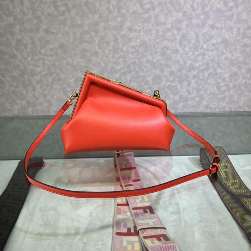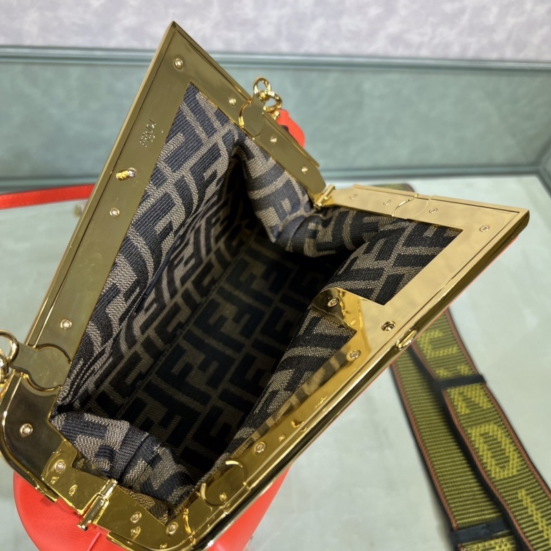 Made of red soft nappa sheepskin, with an oversized F metal buckle with a nappa leather strap in the same color. Fabric lining with iconic FF pattern. Internal compartment, with detachable internal hook and gold metal parts. Equipped with a detachable shoulder strap. Can be carried by hand or crossbody.