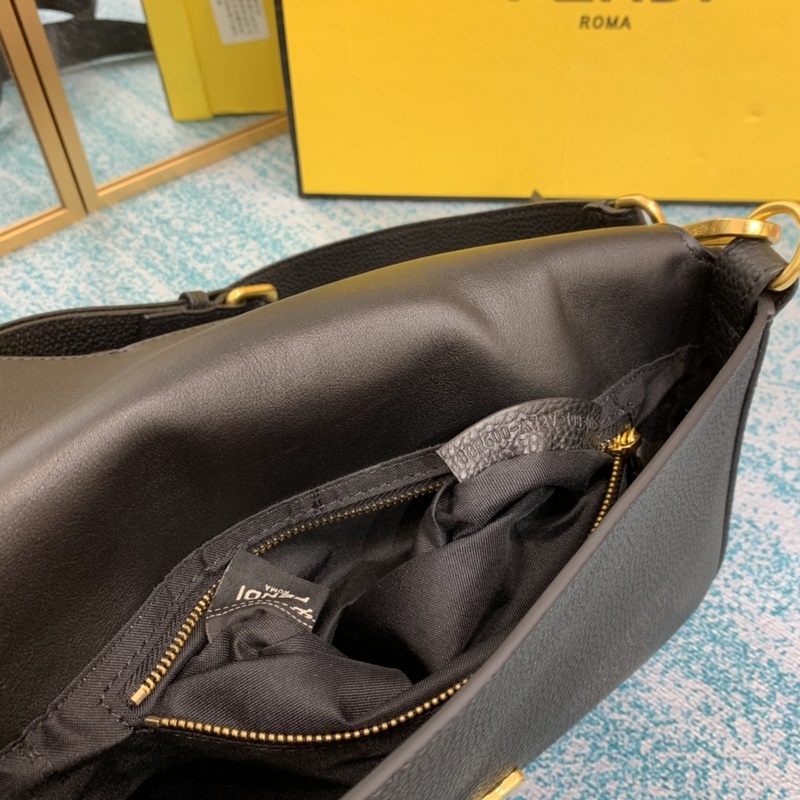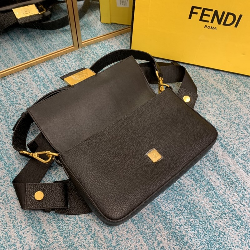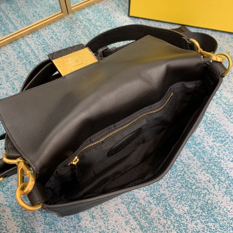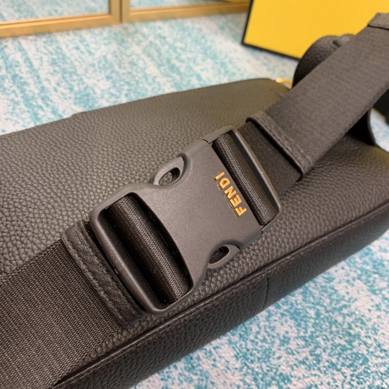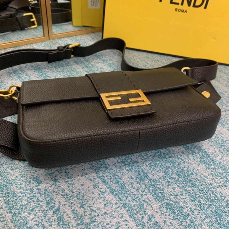 With magnetic buckle closure∩Use the belt pulled out from the back outer pocket to wear it as a waist bag, or use the detachable shoulder strap to carry it on the shoulder or crossbody Lined with zipper pocket Black Italian Romano leather size 28*18*7c Packing number: BD96181300