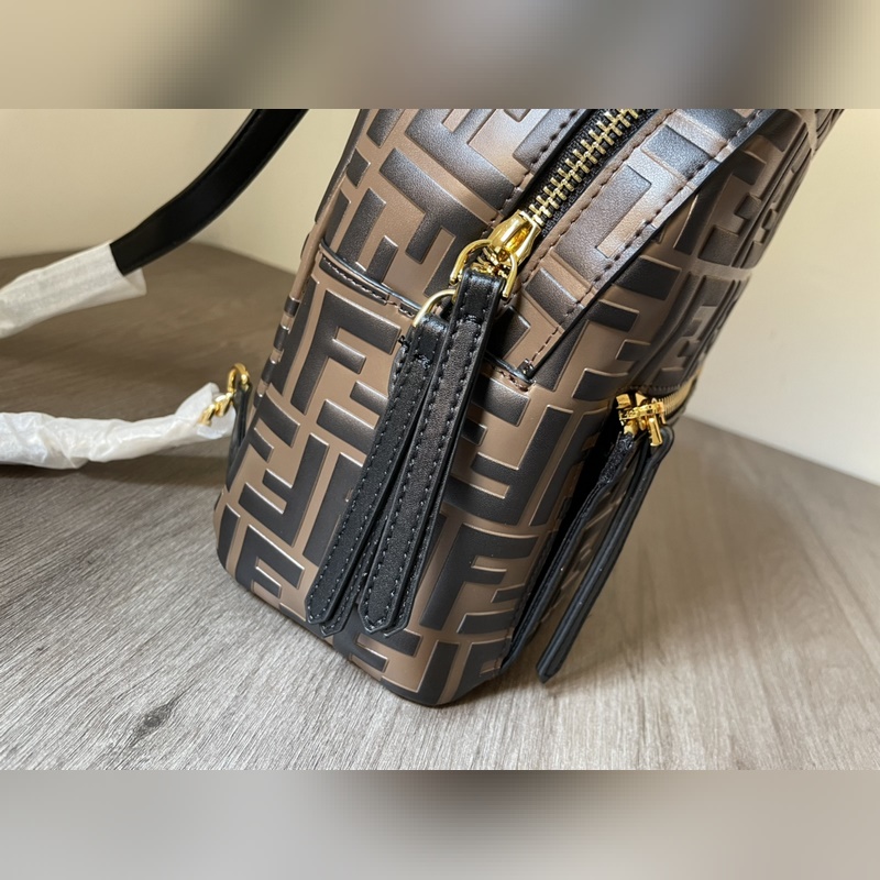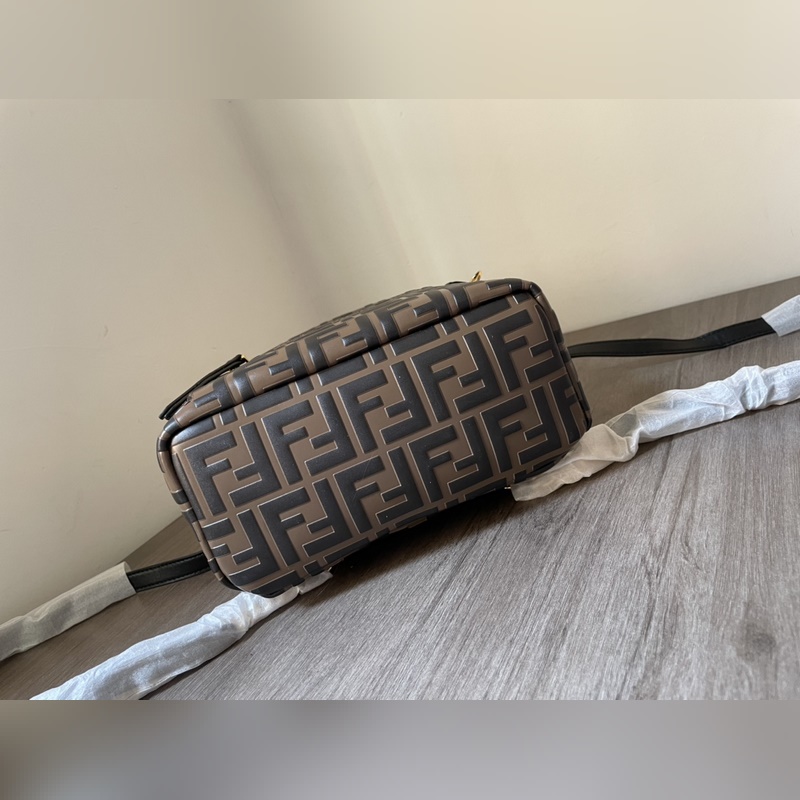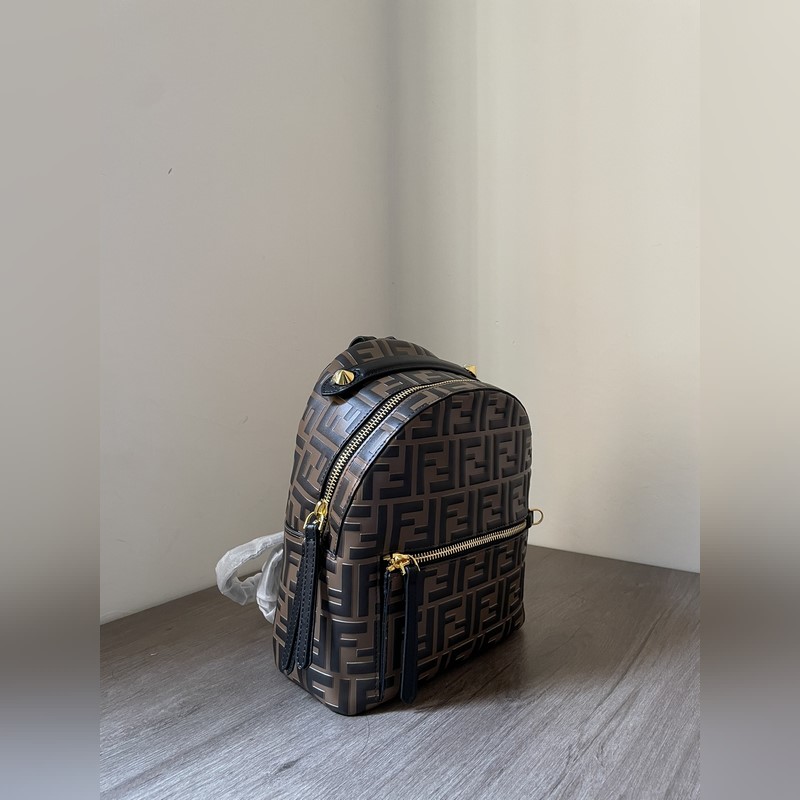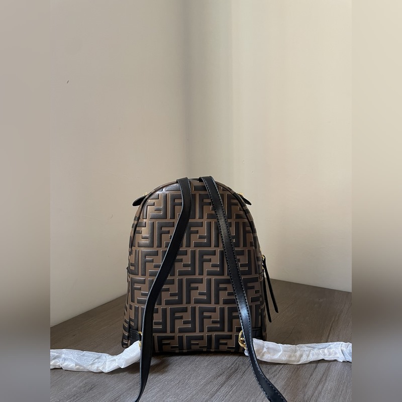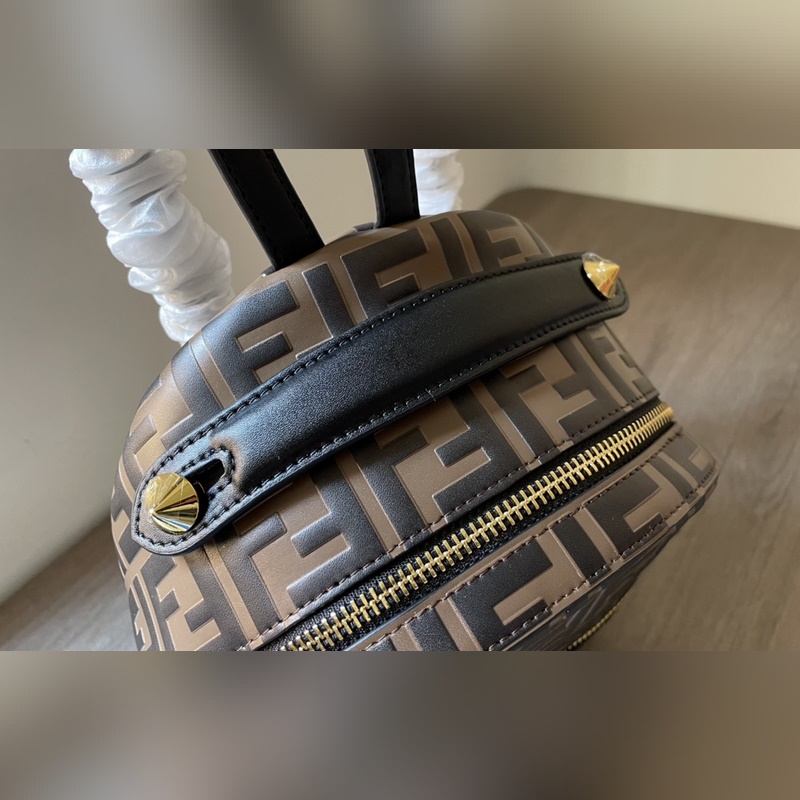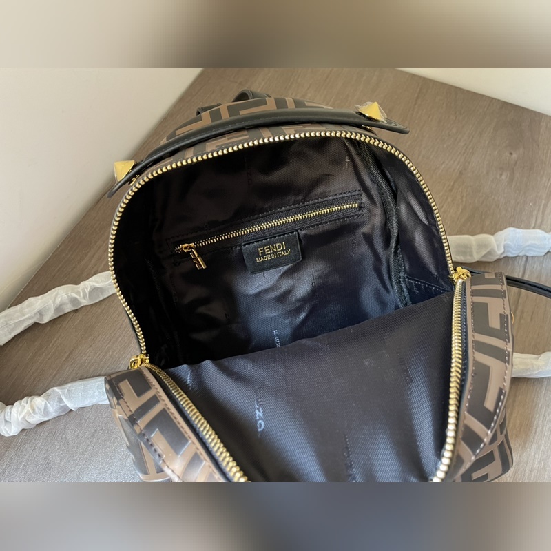 Decorated with front pocket. Another zip pocket inside. Handles and soft adjustable shoulder straps, metal chain decoration. Made of black leather. Features colorful rivets, full leather back, palladium-finish metal accessories. Size: 23x22x10cm