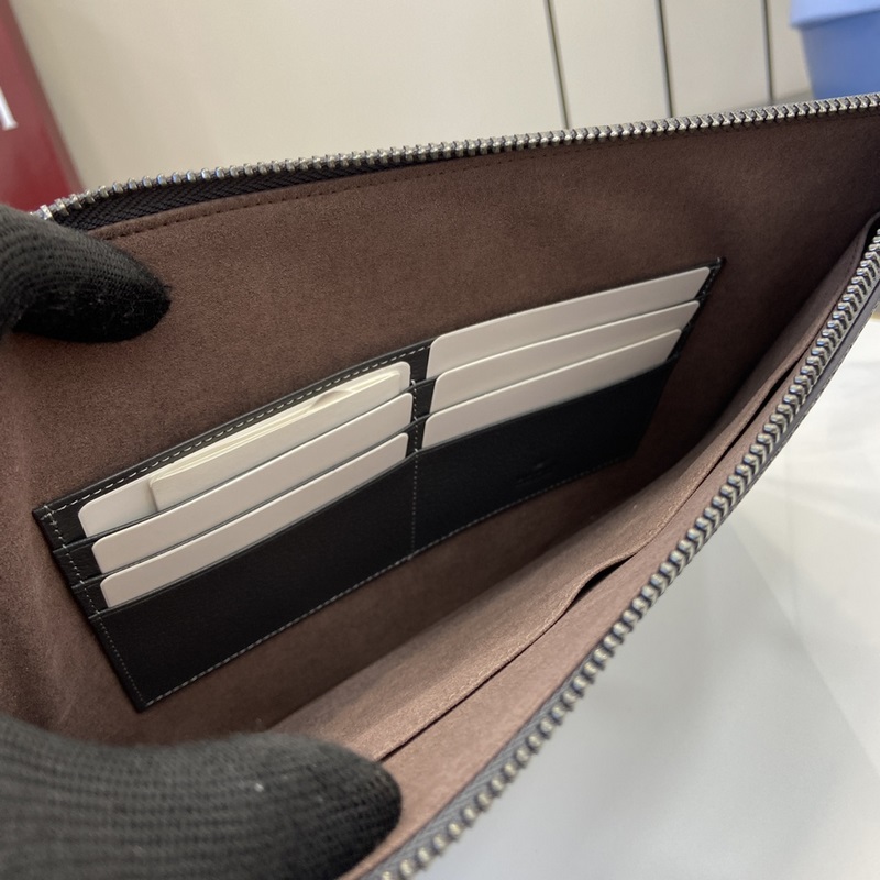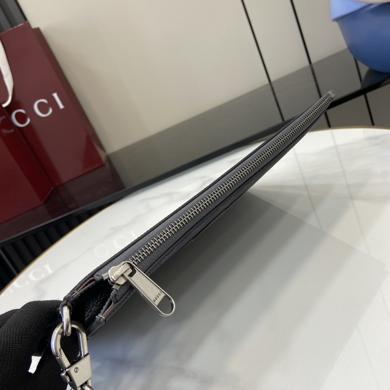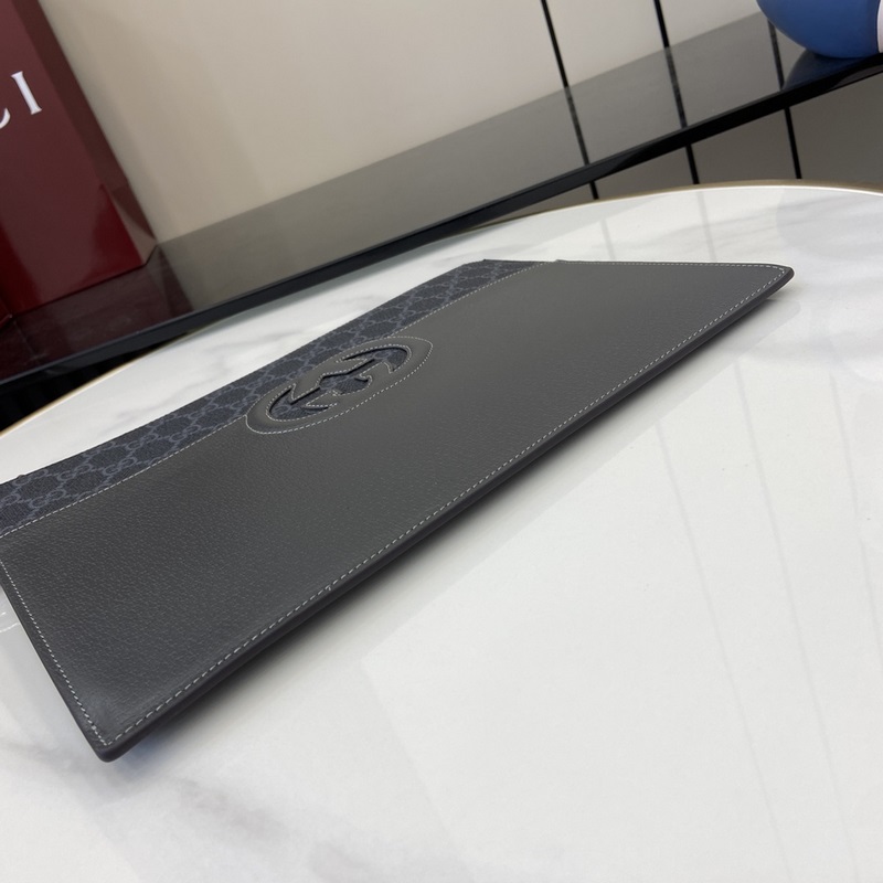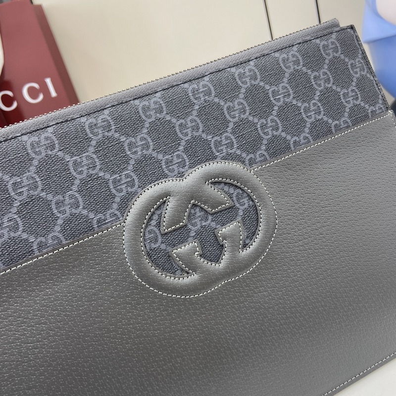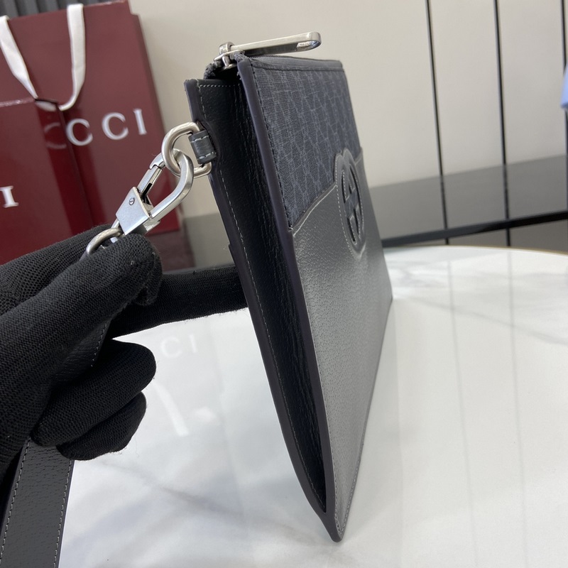 Pouch with cutout interlocking G. This pouch with cutout leather interlocking G detail is paired with GG Supreme canvas for a modern yet classic accessory. The iconic interlocking G logo has been an integral part of Gucci collections since its creation in the 1960s. Derived from the initials of Guccio Gucci, the logo has been reinvented in various forms and styles. Black and grey GG Supreme canvas, grey leather trim, moiré lining, cutout interlocking G detail, interior: 4 internal card compartments and 1 external flap pocket, wristlet (12 cm height).