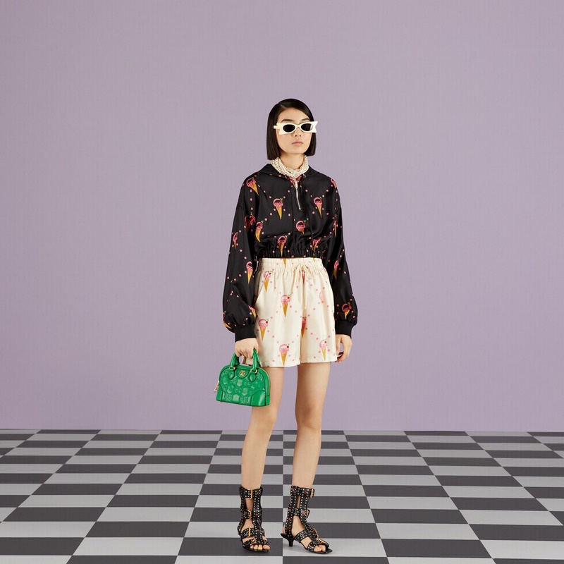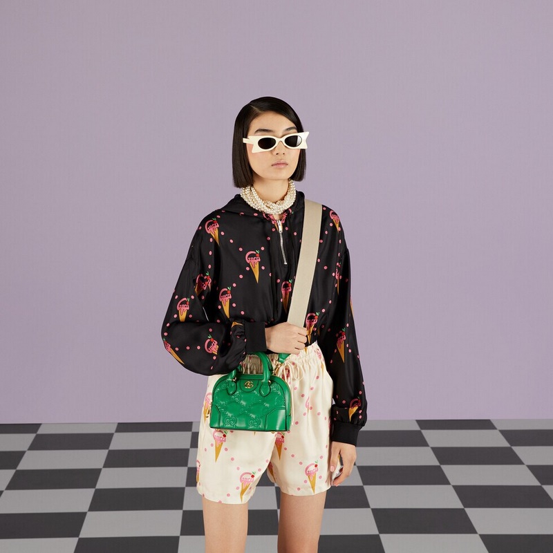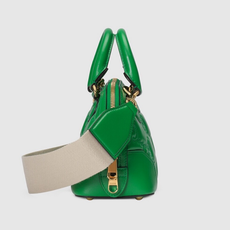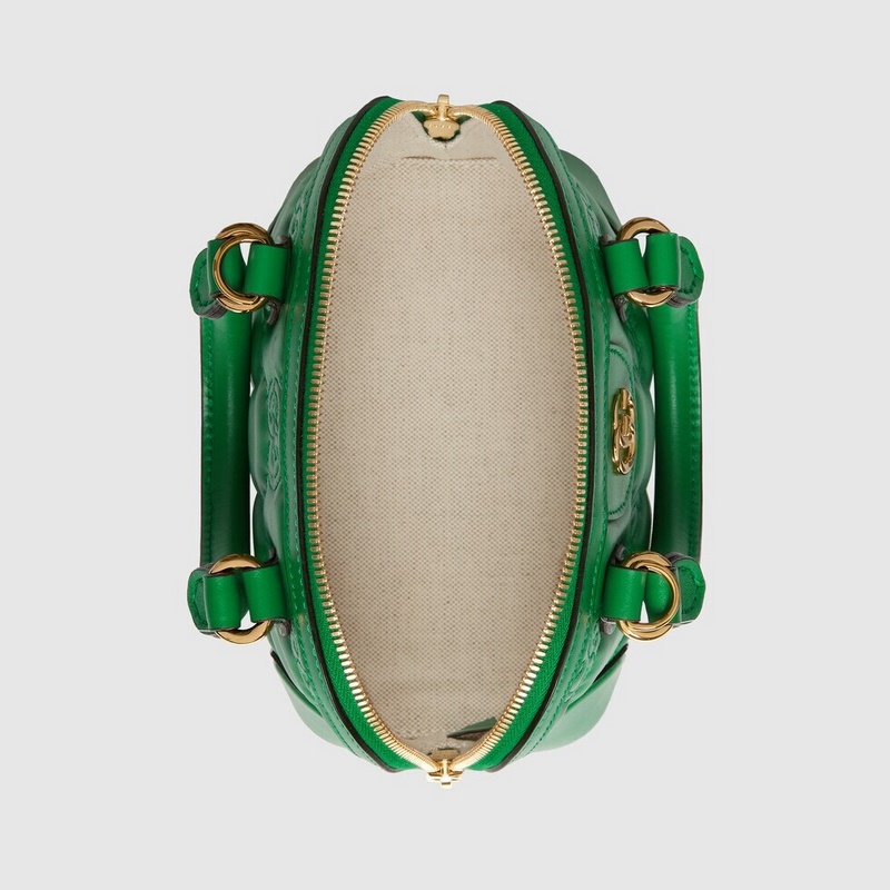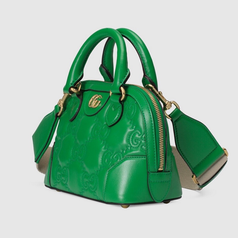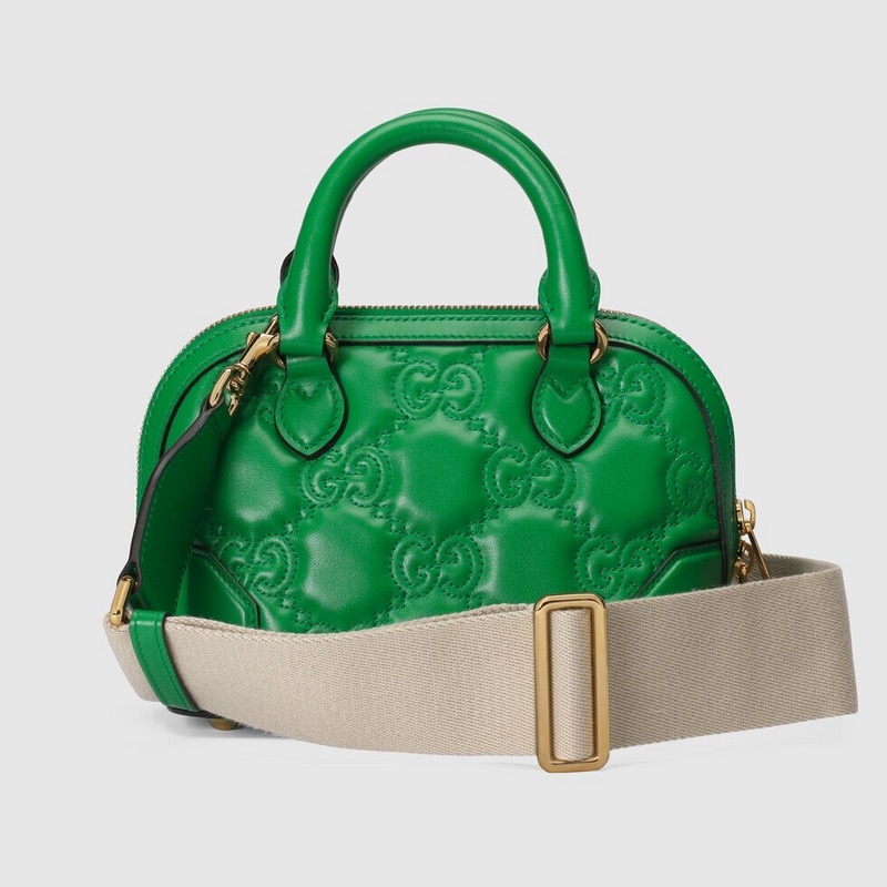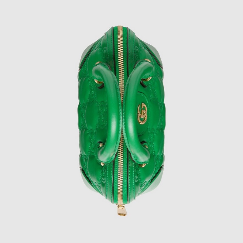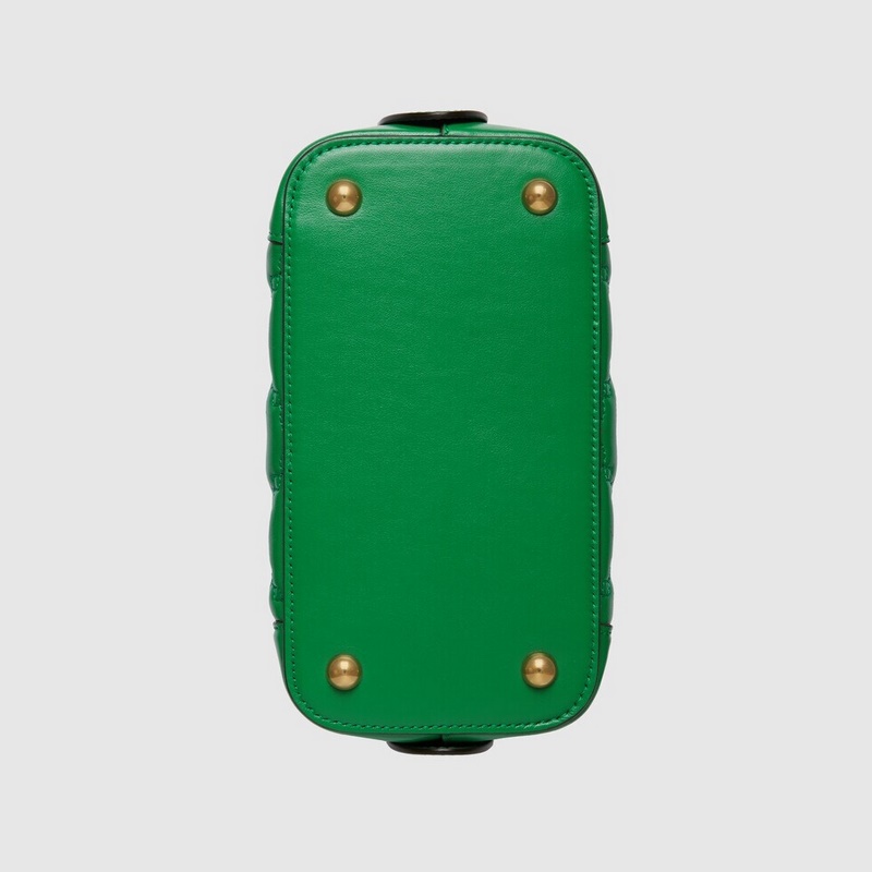 GG Matelassé leather bag, UM8HG 1046 GG Matelassé leather is a soft interpretation of the House’s iconic material. The textured GG motif is brought to life on a range of bags, including this green leather bag. The Double G hardware on the front adds a touch of House identity to the design. Green GG Matelassé leather, gold-tone hardware, cotton and linen lining, Double G top handle (6.5 cm height), removable shoulder strap (47 cm height), zip closure.