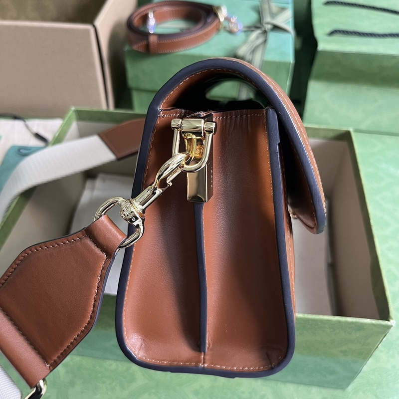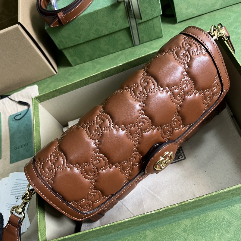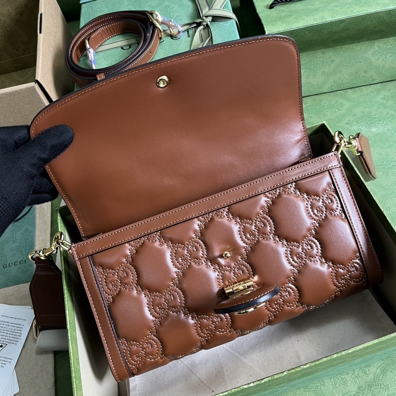 Small bag in GG Matelassé leather. GG Matelassé leather is reimagined every season in the House’s Creative Director’s cutting-edge designs. The iconic material, made extra soft, is reinterpreted in a textured, geometric pattern for Gucci’s latest collections. This design is a modern take on the 90s logo trend that has been featured in the House’s latest collections. Small shoulder bag in brown with two interchangeable straps. Brown GG Matelassé leather, gold-tone hardware, two removable straps: ivory nylon and brown leather, Double G in cotton and linen lining, double gusset and interior open pocket, adjustable leather strap with 55.5 cm drop; removable canvas strap with 55 cm drop.