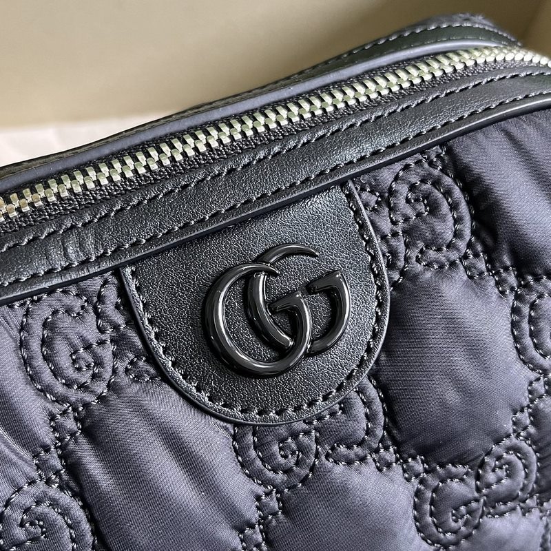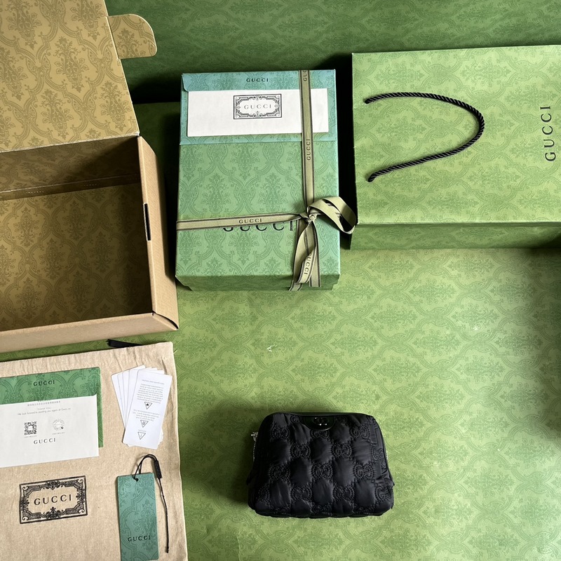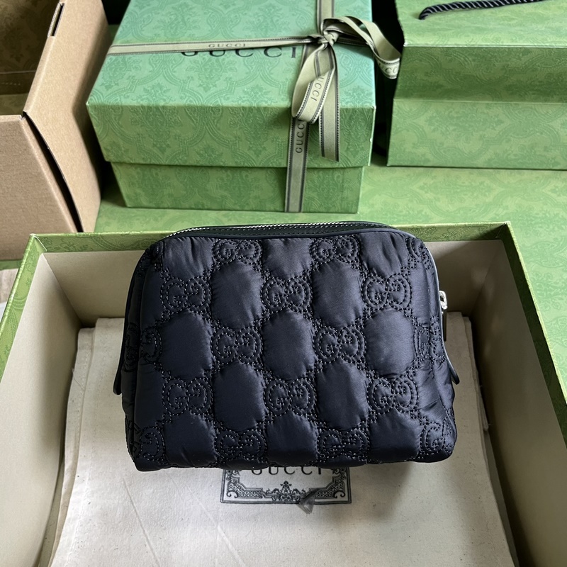 GG Matelassé cosmetics case. GG Matelassé leather is a soft interpretation of the House’s signature material. The textured geometric pattern is brought to life on a range of small leather accessories, including this black cosmetics case. The Double G hardware on the front adds a touch of House identity. Black GG Matelassé leather, black leather piping, gold-tone Double G hardware, zip closure.
