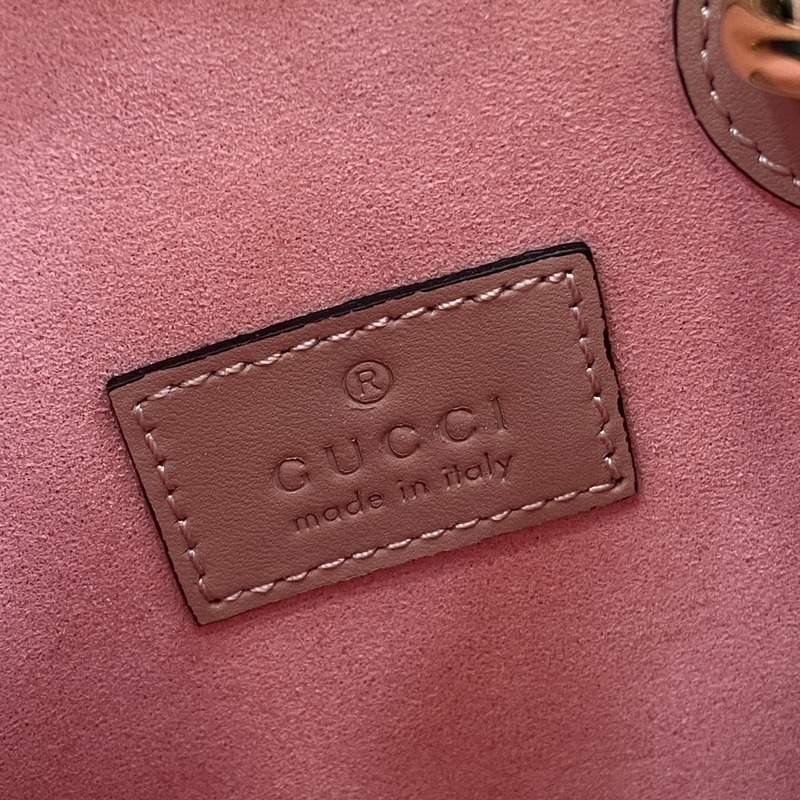 New GG super mini bag with shoulder strap. The brand’s iconic pattern is transformed into a symbolic element that is rich in variation but classic, adding color to the new series. Light pink classic GG leather adds a touch of personality to this super mini bag, and the external compartment and chain shoulder strap allow for multiple ways of wearing. Light pink GG leather, suede-textured microfiber lining, top handle (7.5 cm high) and removable shoulder strap (50 cm high); length can be adjusted between 95 cm and 110 cm, snap button placket, weight: approximately 0.25 kg.