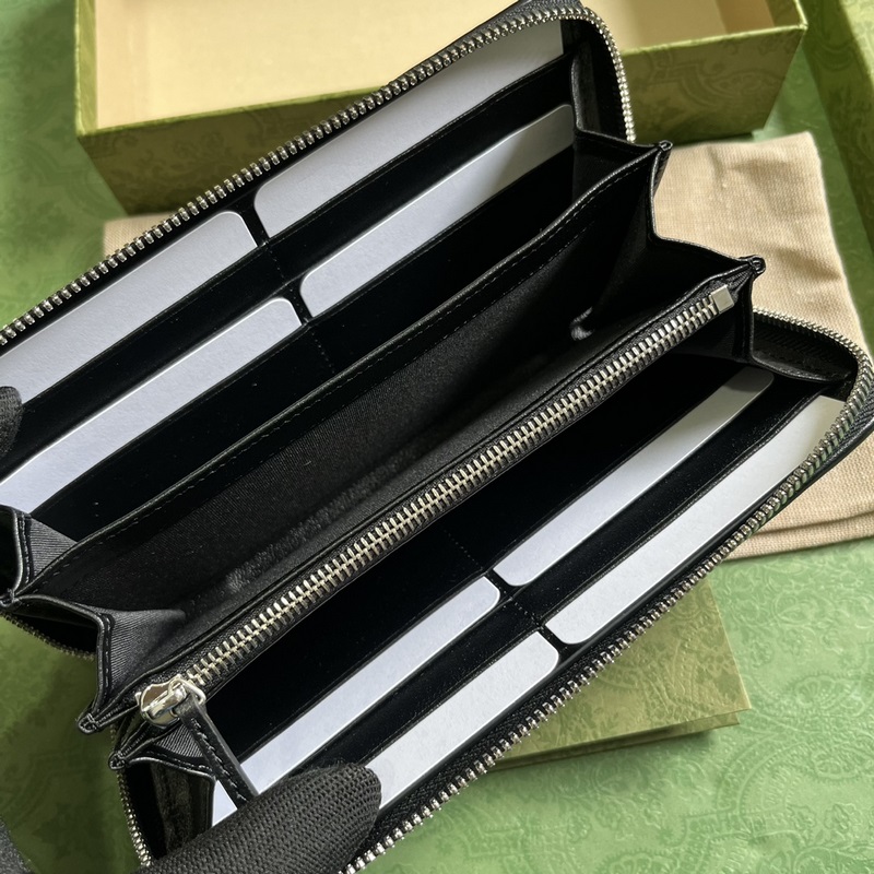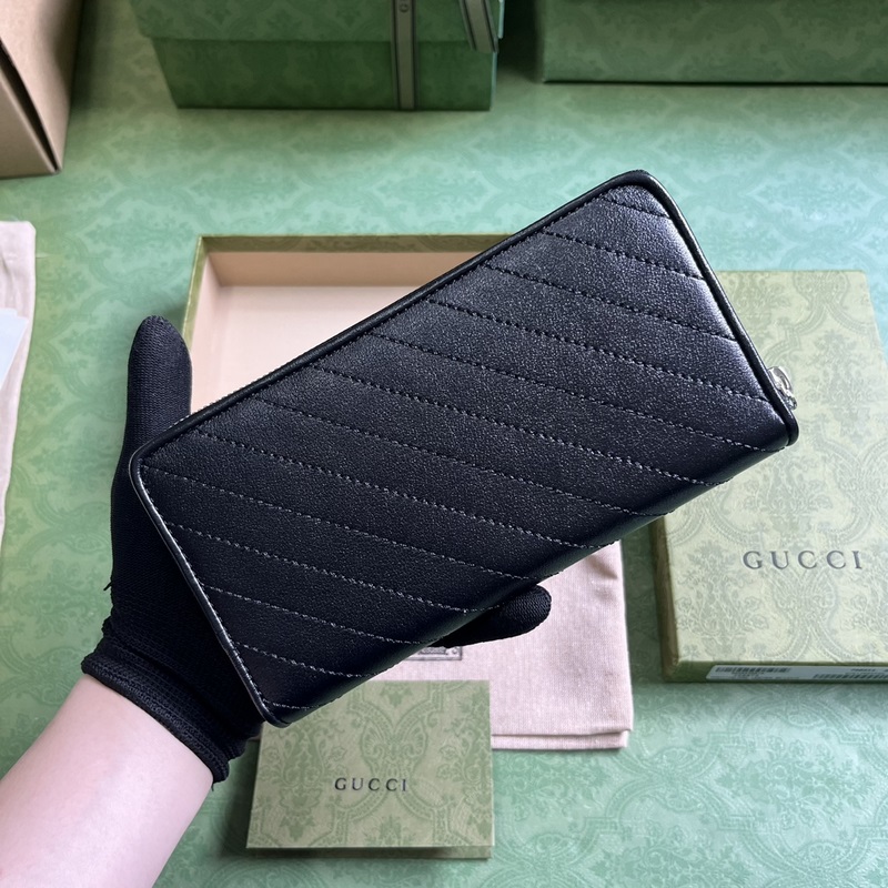 Gucci Blondie zip-around wallet. The Gucci Blondie collection features a bold pattern from the brand paired with leather in the same tone, exuding a subtle and restrained vibe. The collection features a circular geometric interlocking G, showcasing Gucci’s modern aesthetic. The logo detail is prominently displayed on this black leather zip-around wallet. Black leather, taffeta lining, circular interlocking G leather patch, interior: twelve card compartments, three bill compartments and a zippered coin pocket, zipper closure. Weight: Approximately 0.18 kg.
