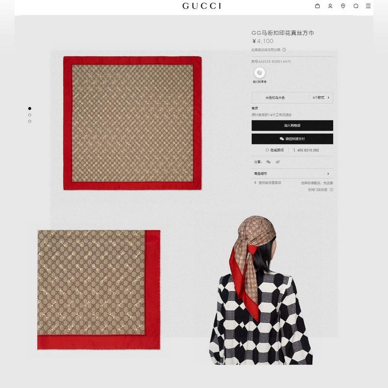 GG Horsebit Silk Square Scarf 90 Silk double-sided printed square scarf, with classic GG pattern with yellow horsebit print and solid color trim, showing generous and elegant temperament. The GG pattern pays tribute to the extraordinary experience of the brand founder Guccio Gucci, and the horsebit pattern highlights the brand’s equestrian origin. Beige and ebony GG printed silk, decorated with overprinted laminated yellow horsebit print Red trim 90 cm (width) x 90 cm (height) 100% 18 momme silk Italian creation