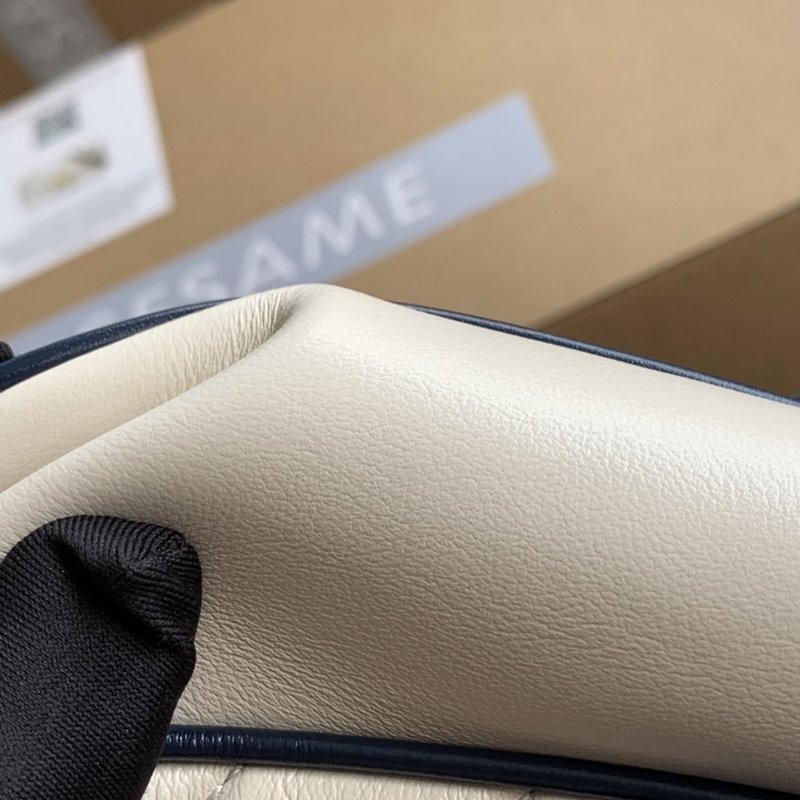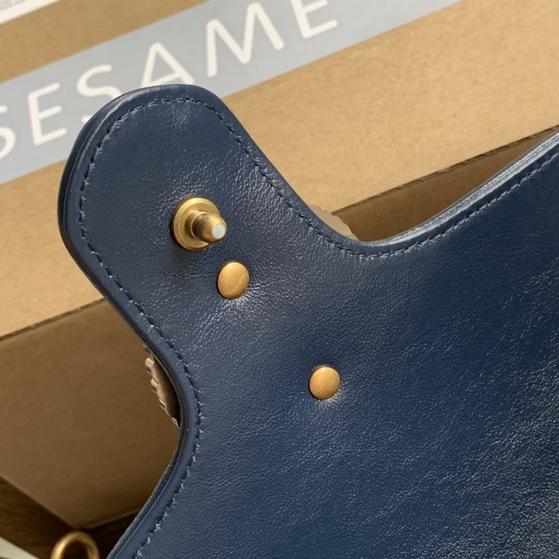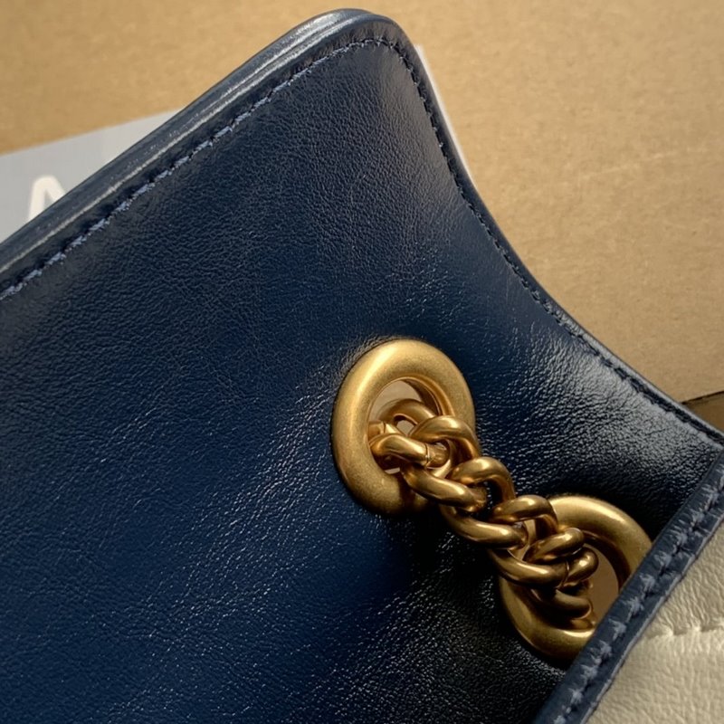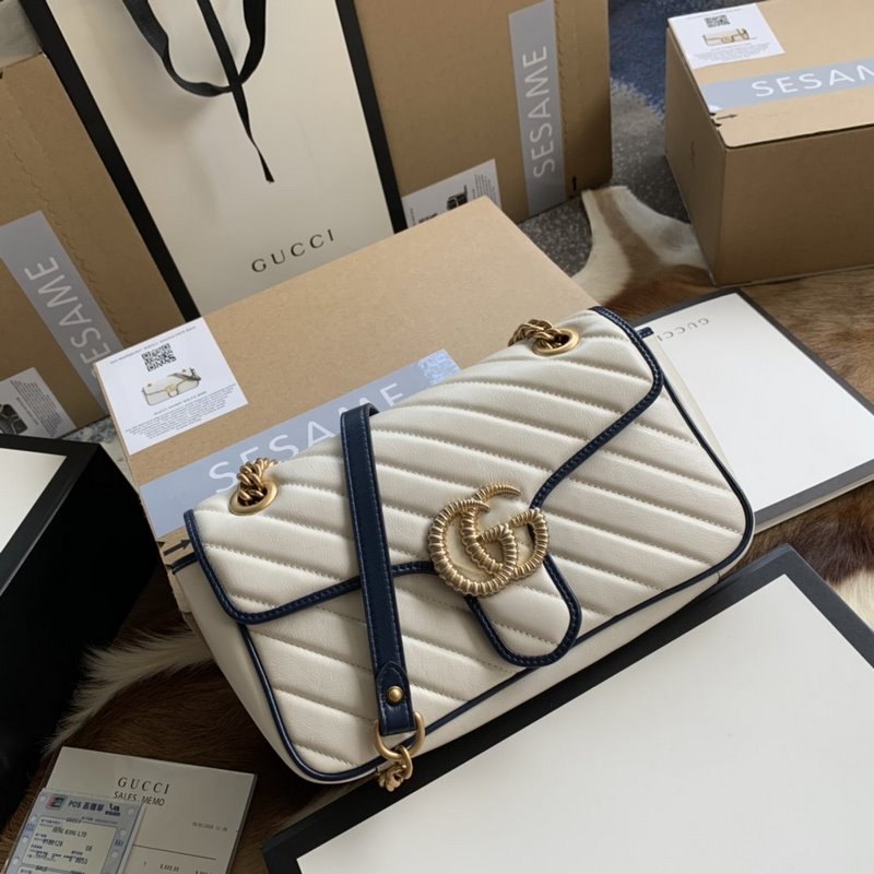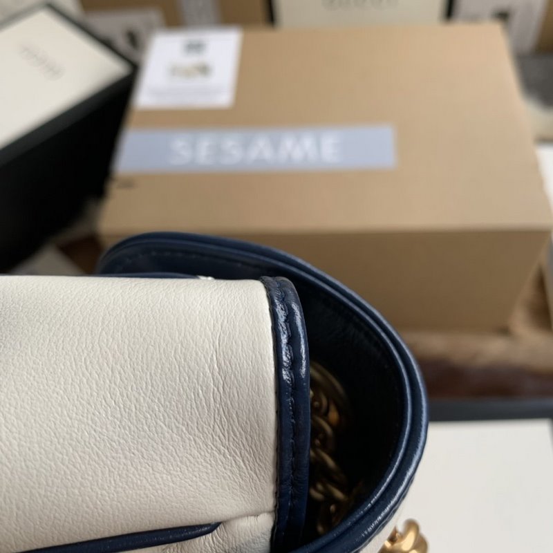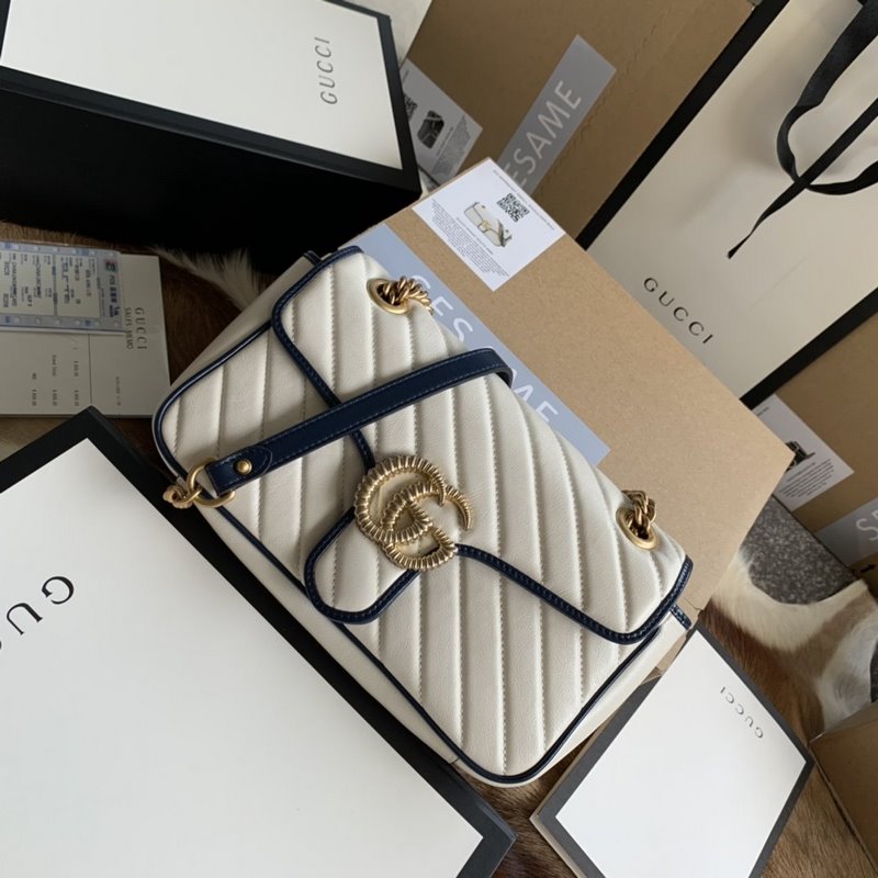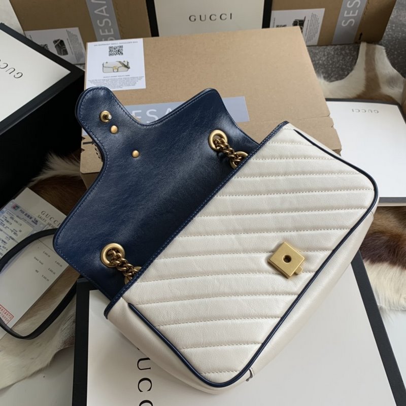 Gucci style number: 443497 The newly launched GG Marmont is made of white twill quilted leather. Decorated with lemon flower ribbon and double G decorative accessories. The bright dark blue piping highlights the stunning design of the flap buckle