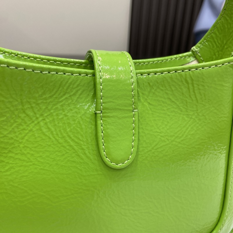 New Gucci Jackie Notte Mini Shoulder Bag. This new Jackie Notte bag was designed by Sabato De Sarno, the brand’s creative director. It brings to life the confident heritage of the brand’s classic Jackie collection, carefully blending new silhouettes and refined details to create the ideal accessory for evening looks. Green patent leather, hook closure and light gold-tone Gucci lettering chain strap give this mini shoulder bag a unique and stylish feel. Green patent leather, gold-tone hardware, leather lining, interior: one open pocket with Gucci logo and handwritten Jackie Notte, Gucci lettering chain shoulder strap, each letter is fixed by hand, height 54 cm, hook closure, weight: approximately 0.35 kg.