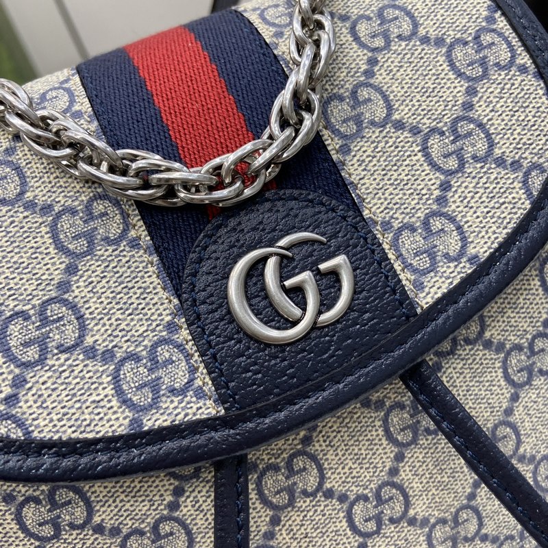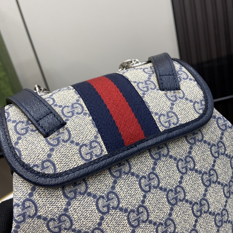 New Ophidia mini backpack. The Ophidia collection combines the essence of Gucci tradition with modern design to create a striking new creation. This backpack is carefully crafted from blue and white GG Supreme canvas and infused with the brand’s connotation with the classic web design. Adjustable shoulder straps add a modern style. Beige and white GG Supreme canvas, blue leather piping, gold-tone hardware, red and blue striped web, brown cotton and linen lining, double G handle height: 6 cm, adjustable leather shoulder strap (adjustable between 31 cm and 35 cm in length) Weight: approximately 0.55 kg.