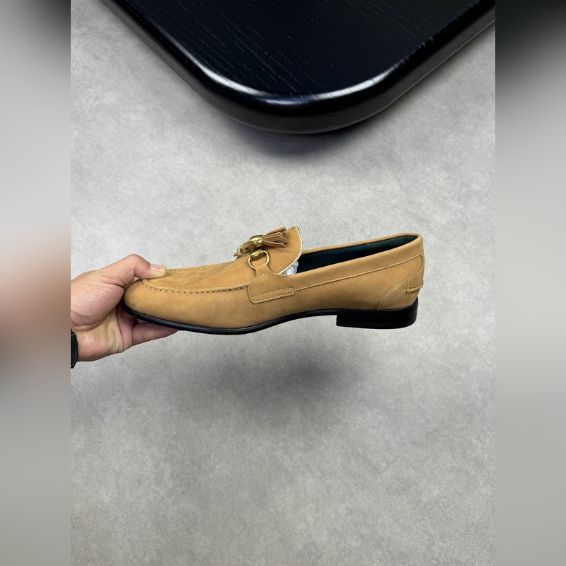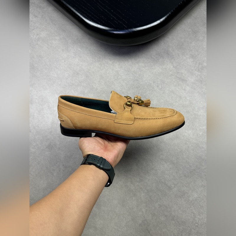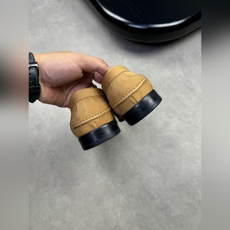 – Upper: frosted calfskin, branded metal fasteners, suede stitching