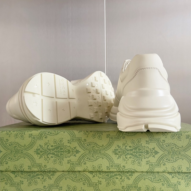 Original purchase, development and production This Rhyton series sneaker uses ivory white leather with a retro design. The shoe body cleverly incorporates contrasting interlocking double G hollow details, adding a soft brand logo to this classic sneaker.