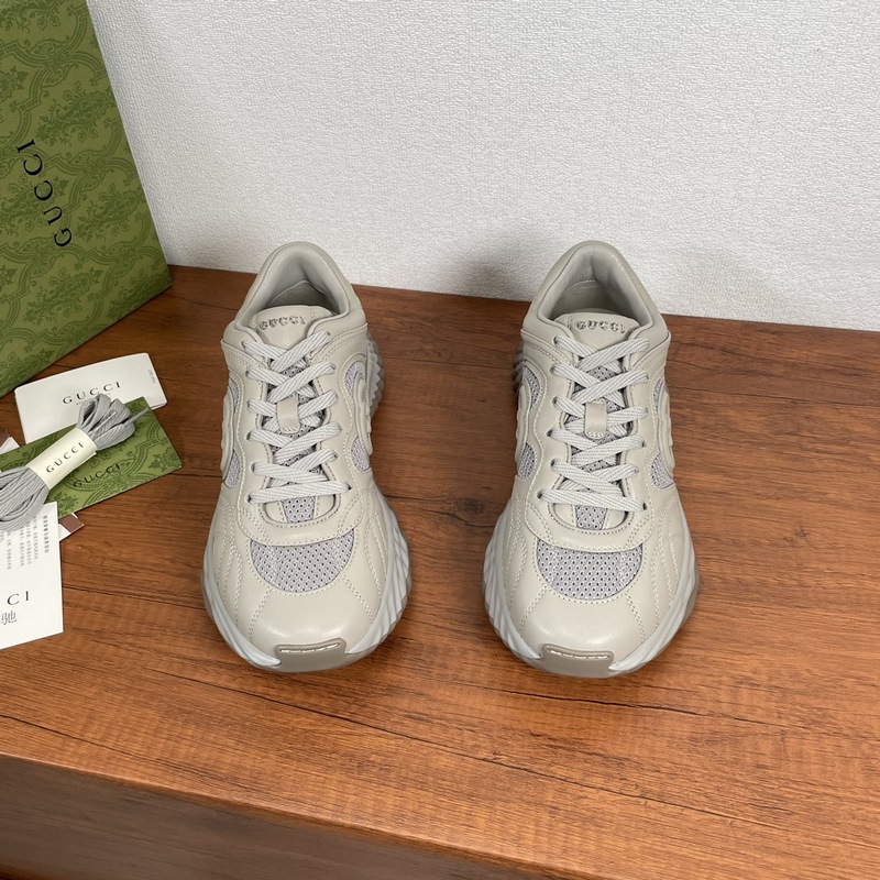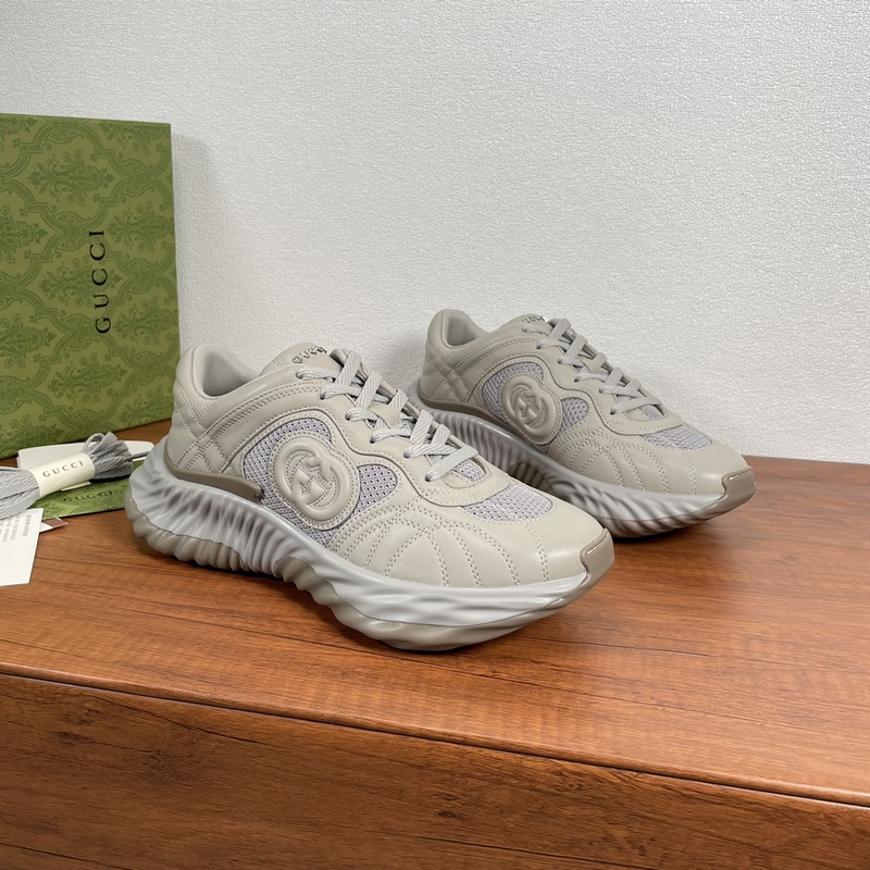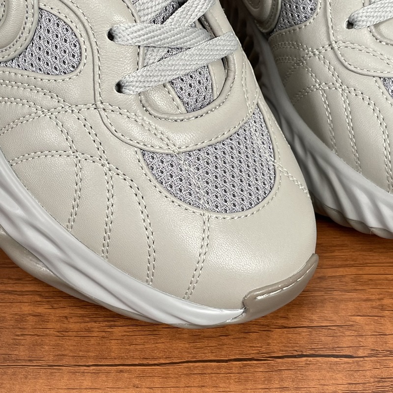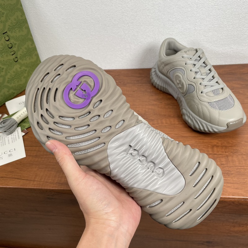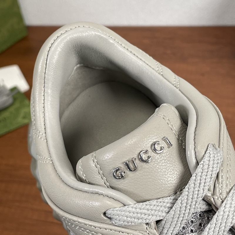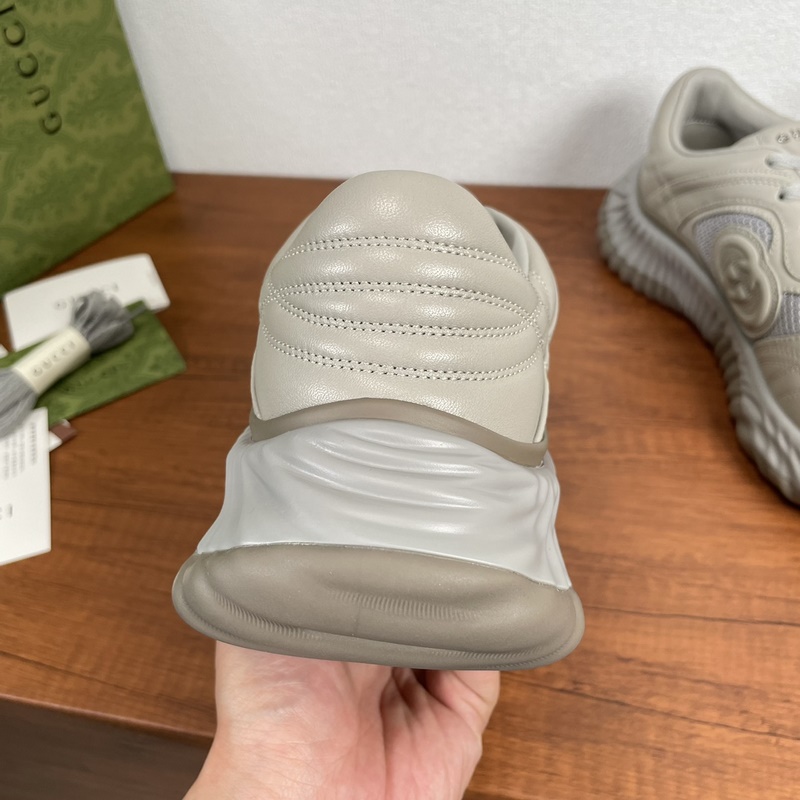 This new sneaker is designed with a lightweight rubber thick sole, with a stitched leather upper and breathable mesh, showing a full sense of technology. 3D effect interlocking double G leather patches, Gucci letter logo metal accessories logo details, the upper is made of calfskin spliced with hollow mesh fabric, with sheepskin lining, calfskin pads, comfortable and breathable to wear, with a full set of original packaging