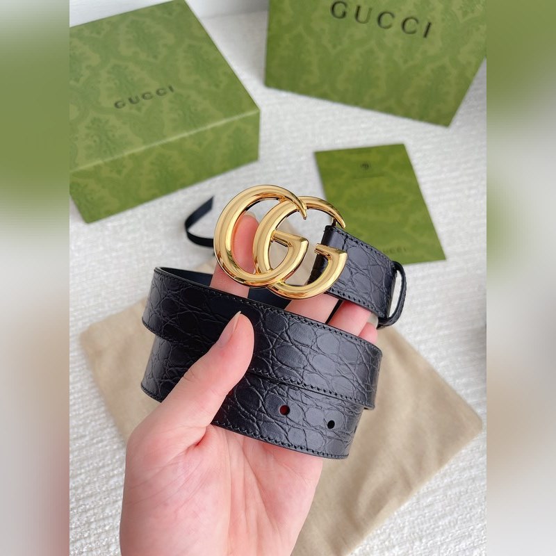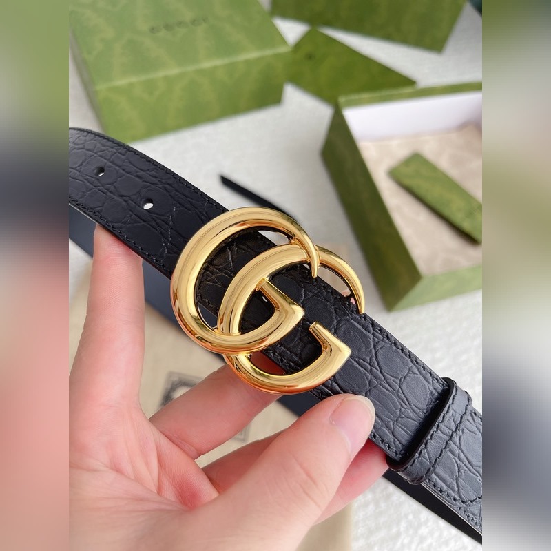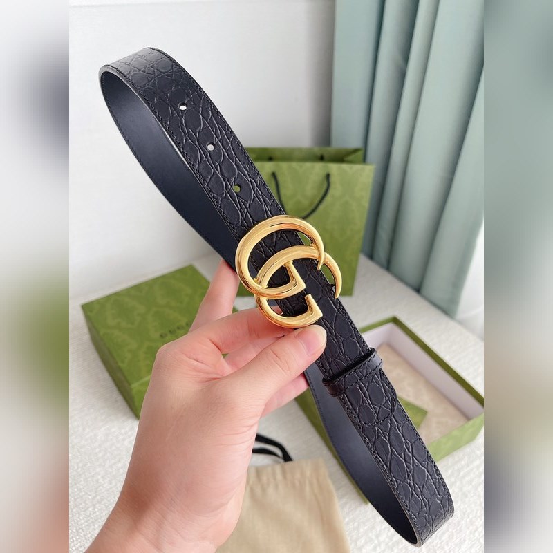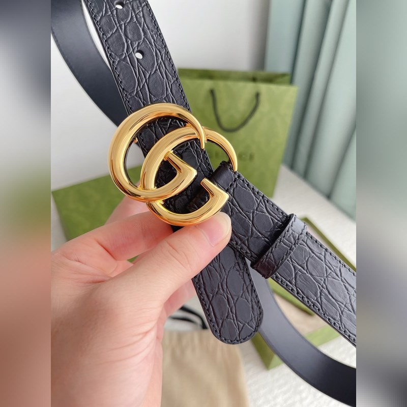 The brand’s iconic double G logo has been reinterpreted and presented in a dazzling gold tone on this black crocodile leather belt. Imported first-layer crocodile pattern cowhide with fine craftsmanship.