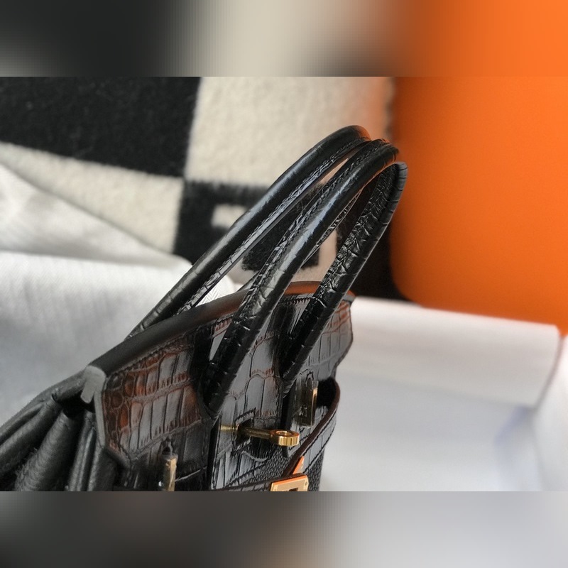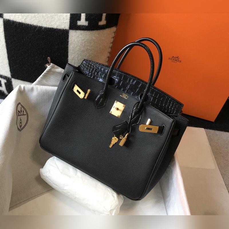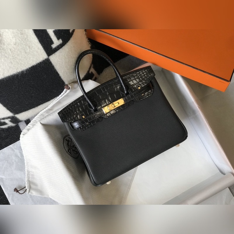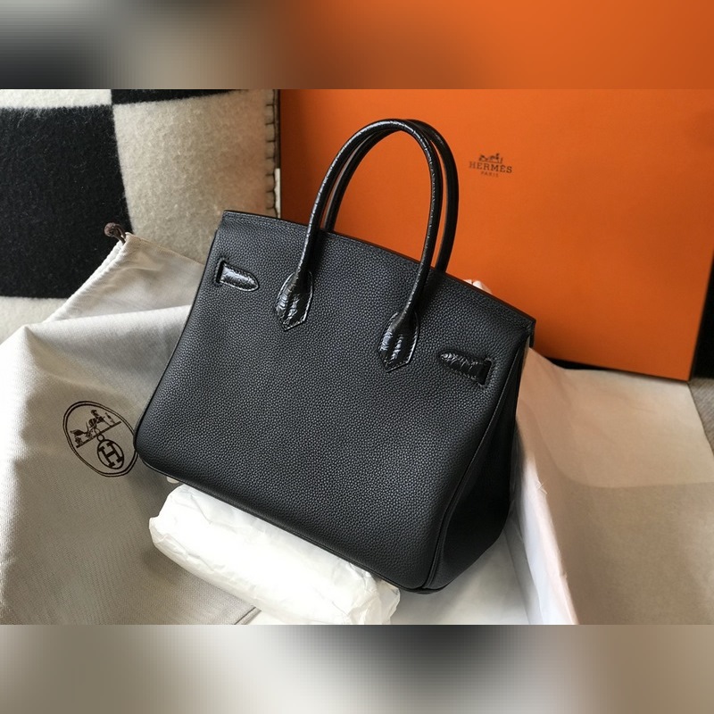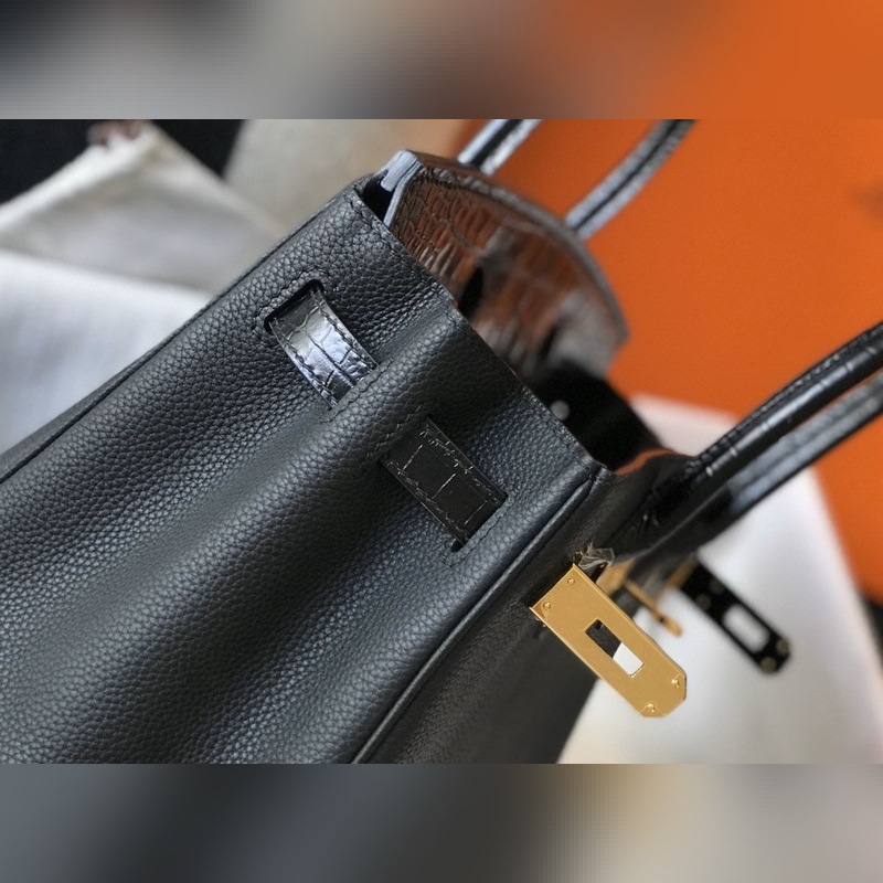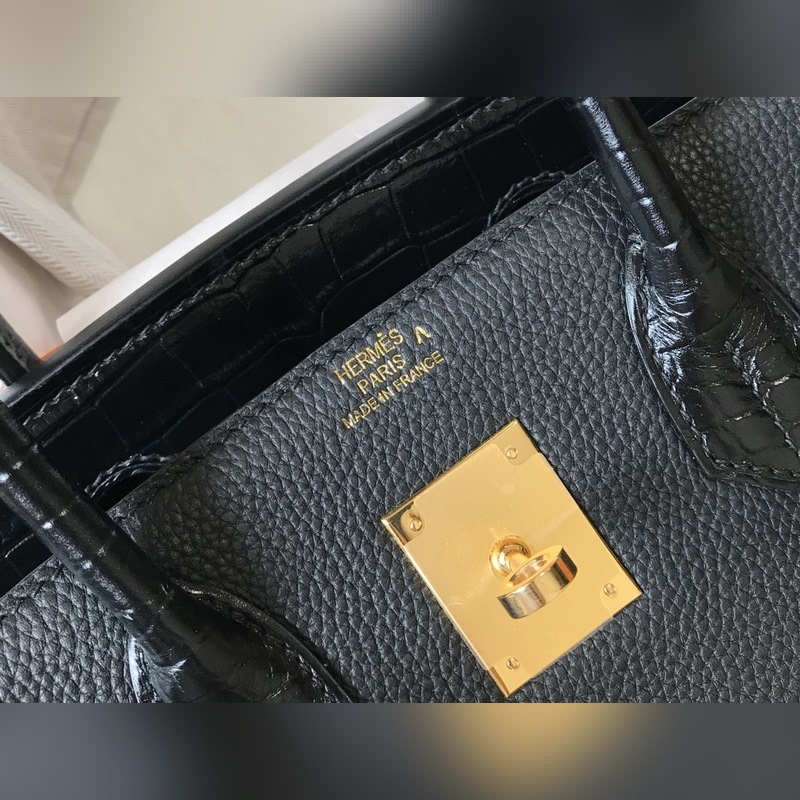 Hermes Black Nile Shiny Crocodile and Togo Leather Handbag