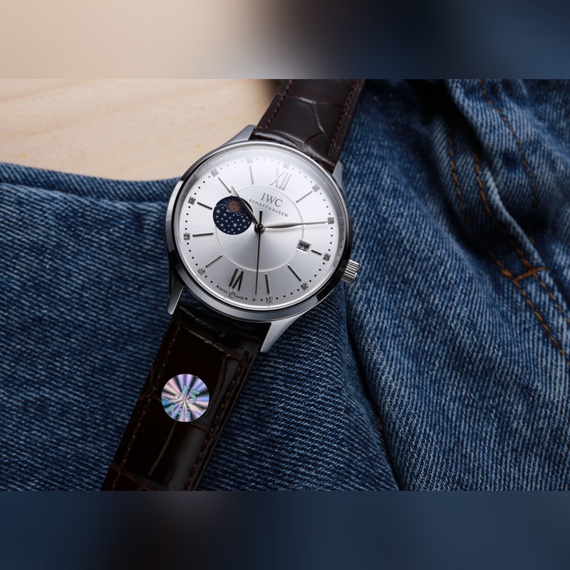 IWC Portofino series adopts a simple large three-hand layout, and the 9 o’clock position is cleverly designed as a round sun, moon and stars. In order to make the visual effect more vivid, the moon phase disk is dark blue with small stars embellished, just like the starry night sky…….