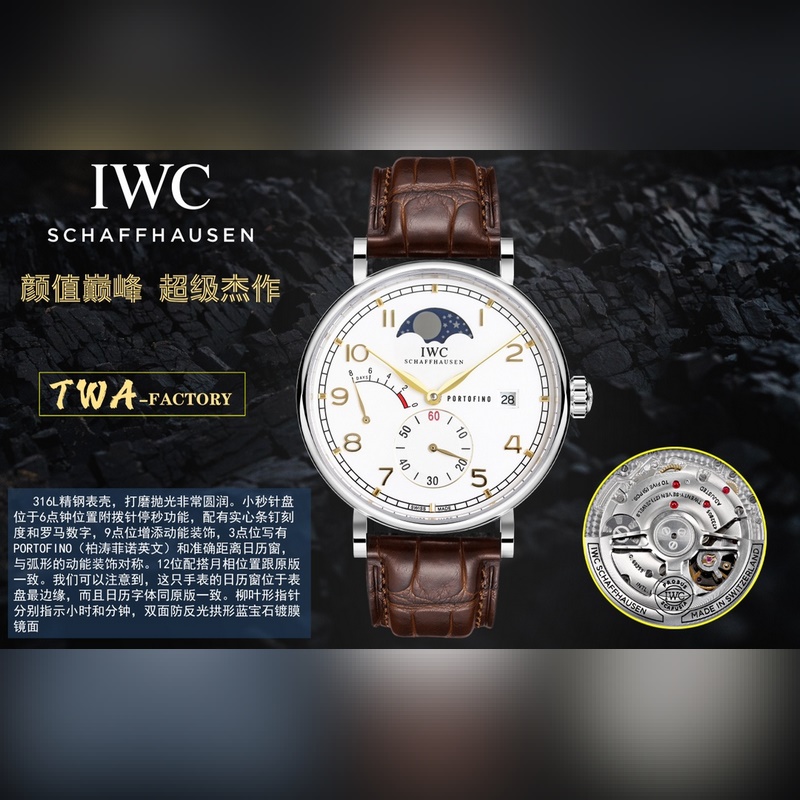 The case is 316L stainless steel, polished and very round. The small second hand dial is located at 6 o’clock with a hand stop function, equipped with solid bar nail scale and Roman numerals, kinetic decoration is added at 9 o’clock, and PORTOFINO (Portofino English) and accurate distance calendar window are written at 3 o’clock, which is symmetrical with the arc-shaped kinetic decoration. The 12-position matching moon phase position is consistent with the original. We can notice that the calendar window of this watch is located at the edge of the dial, and the calendar font is consistent with the original. The willow-shaped hands indicate hours and minutes respectively, double-sided anti-reflective arched sapphire coated mirror, strap Italian calfskin, self-developed automatic winding mechanical movement, stable movement, accurate travel time.