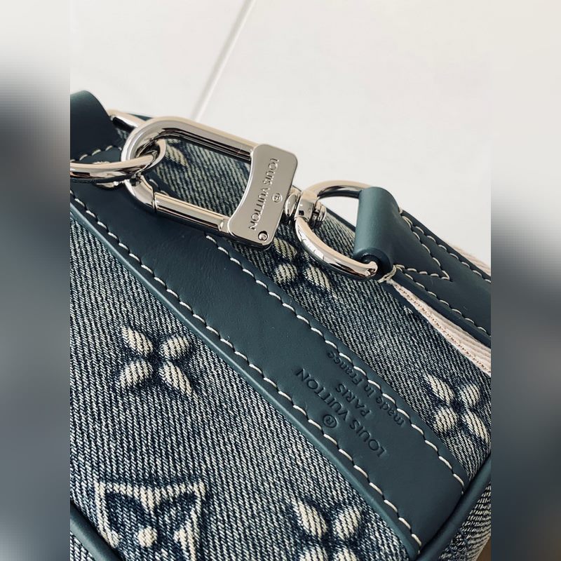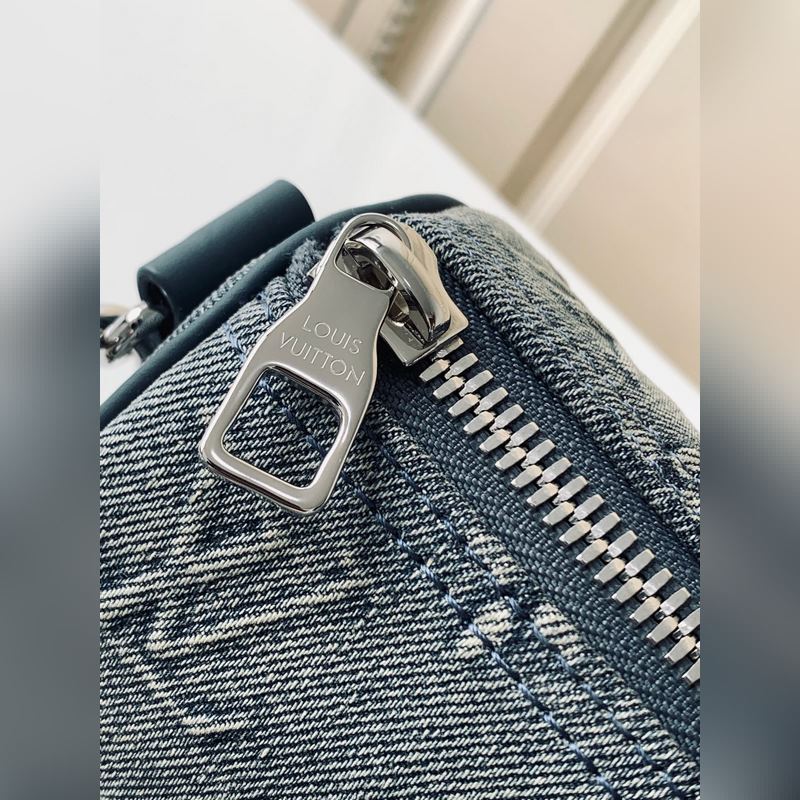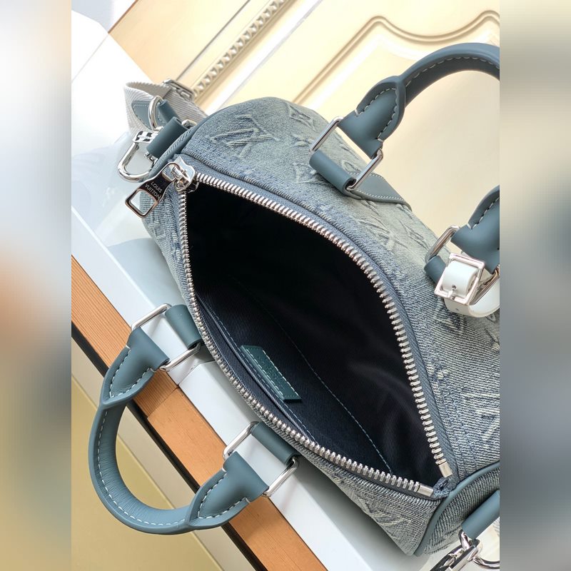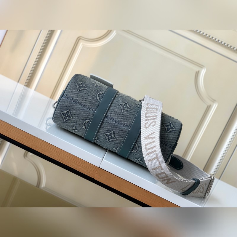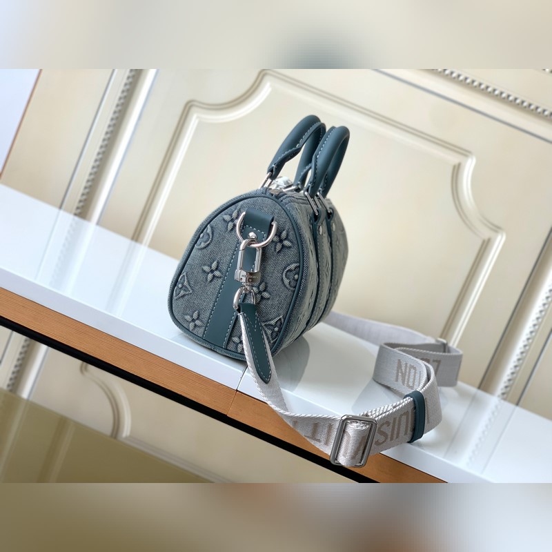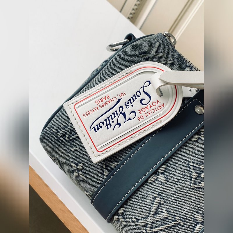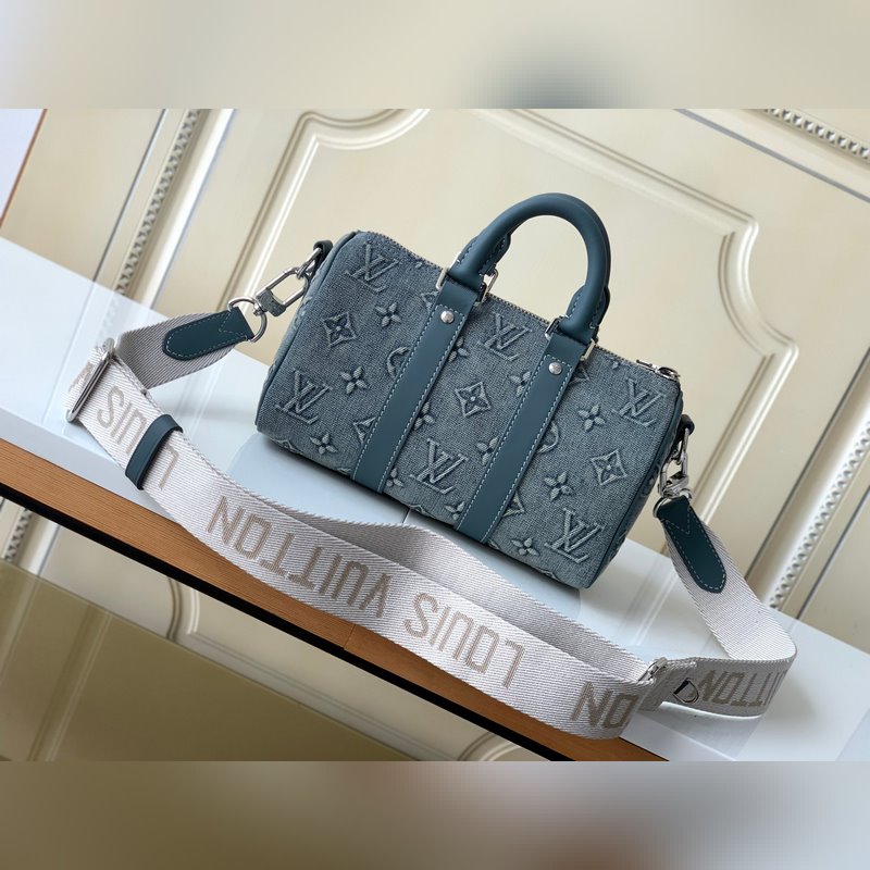 Haiyuan Foreign Single Dushijiapao M22762 Denim Embossed This Keeall Bandoulière 25 handbag shows the vintage texture of Monogram Washed Demin canvas, and the Monogram pattern is outlined by embossing and hand-painting techniques, like a faded denim that has been baptized by time, with a retro-style brand and a detachable and adjustable shoulder strap. Size: 25 x 15 x 11 cm