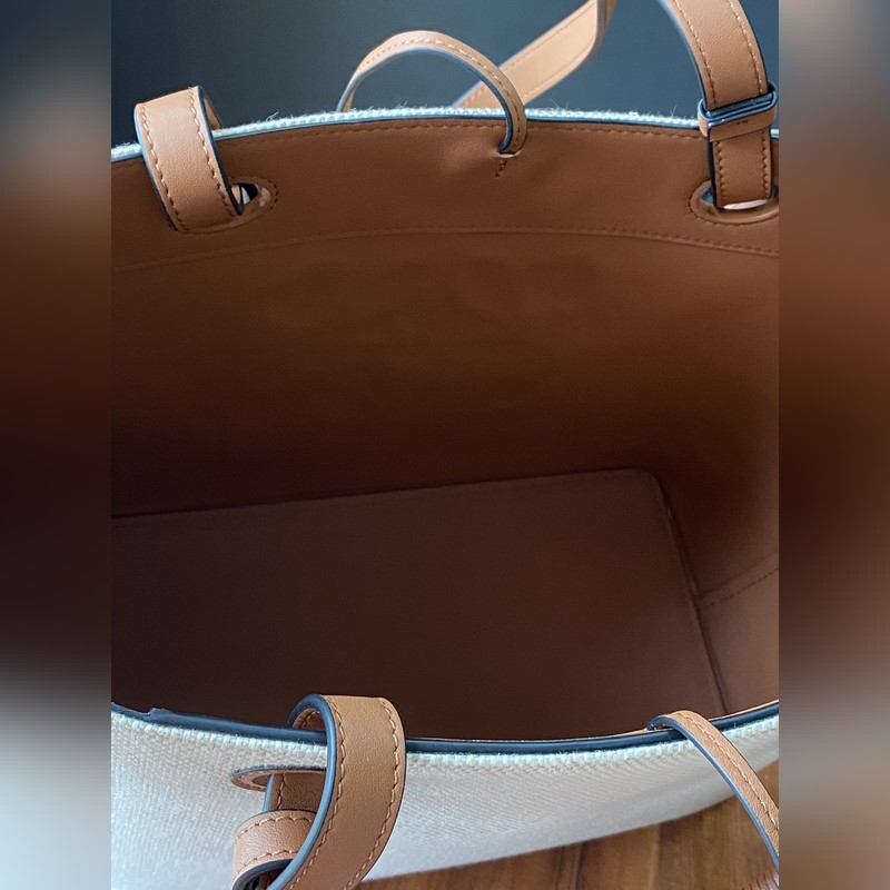 Versatile and spacious Tote handbag, made of jacquard canvas and cowhide. Large Anagram pattern on the front. Leather top handle or shorter hand-woven handle Shoulder or top handle for carrying Cowhide leather laces Internal slip pocket Cowhide leather lining Embossed size 29-25-14 Number: HQ96181350