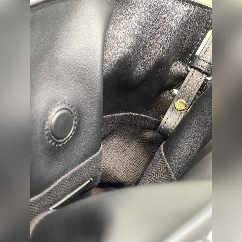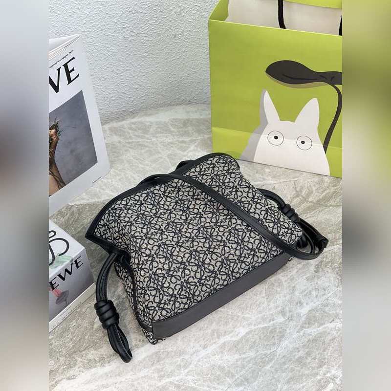 The Flamenco clutch, released in the 1870s, fastens with a drawstring and is finished with the iconic coiled knot. This mini version is made from calfskin and jacquard canvas with a repeating Anagram pattern. Carry on the shoulder, crossbody or by hand, detachable and adjustable, discreet magnetic closure, herringbone cotton canvas lining