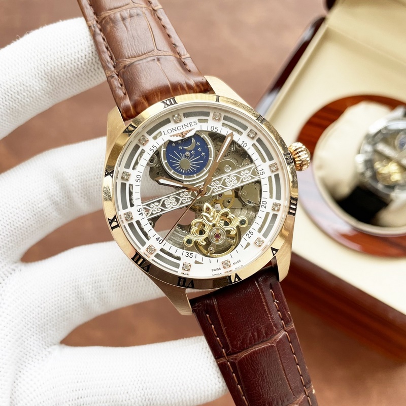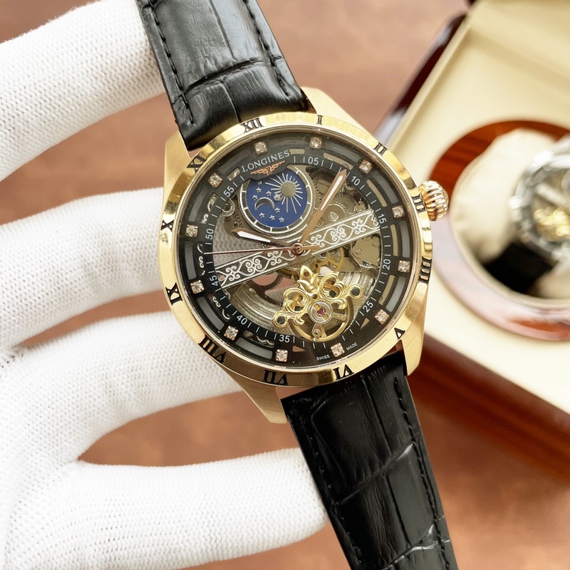 Longines men’s watch, with a powerful hollow design, exquisite craftsmanship, originality, noble atmosphere, and gentleman style. It adopts a fully automatic mechanical movement, top 316 stainless steel case, imported calfskin strap, mineral super mirror, size 43-13